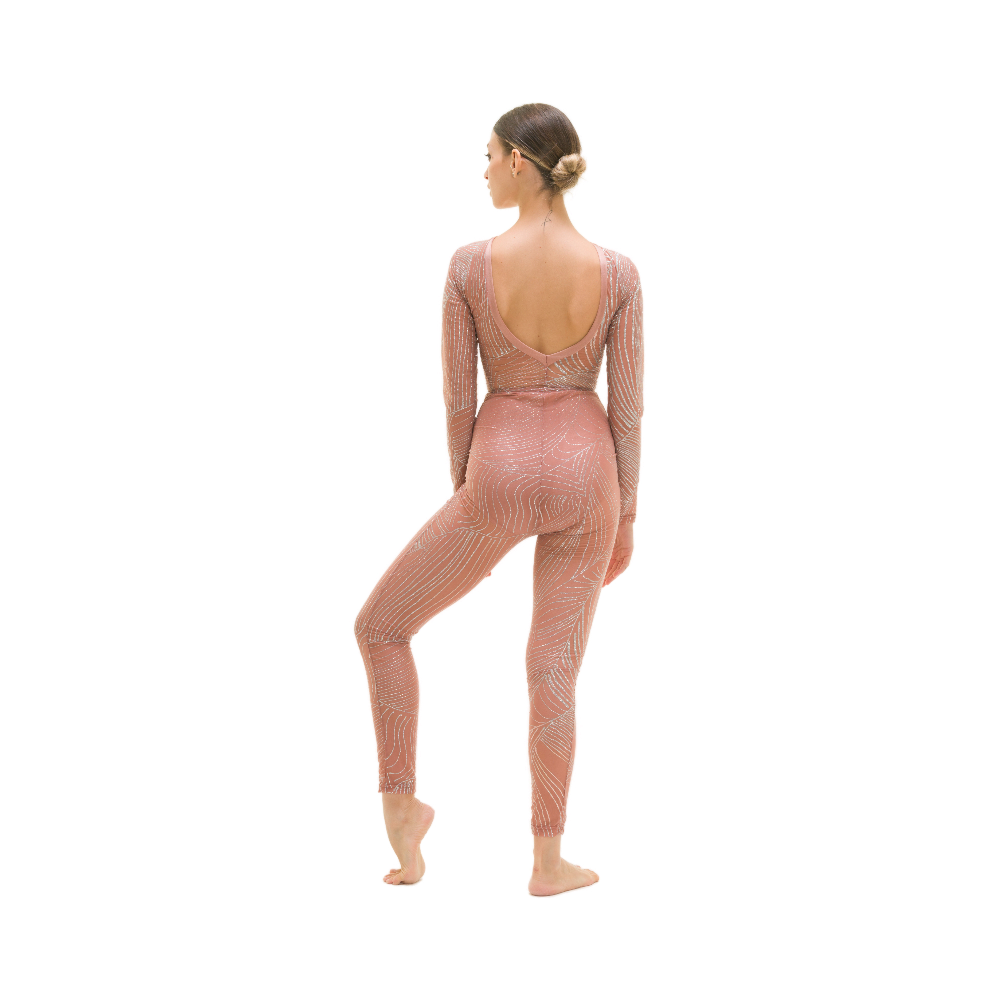 Accademico in retina glamour luccicante, parte del seno doppiata, scollo a barchetta dv ed a V dietro con bordo in lycra, coulotte in lycra da indossare sotto.