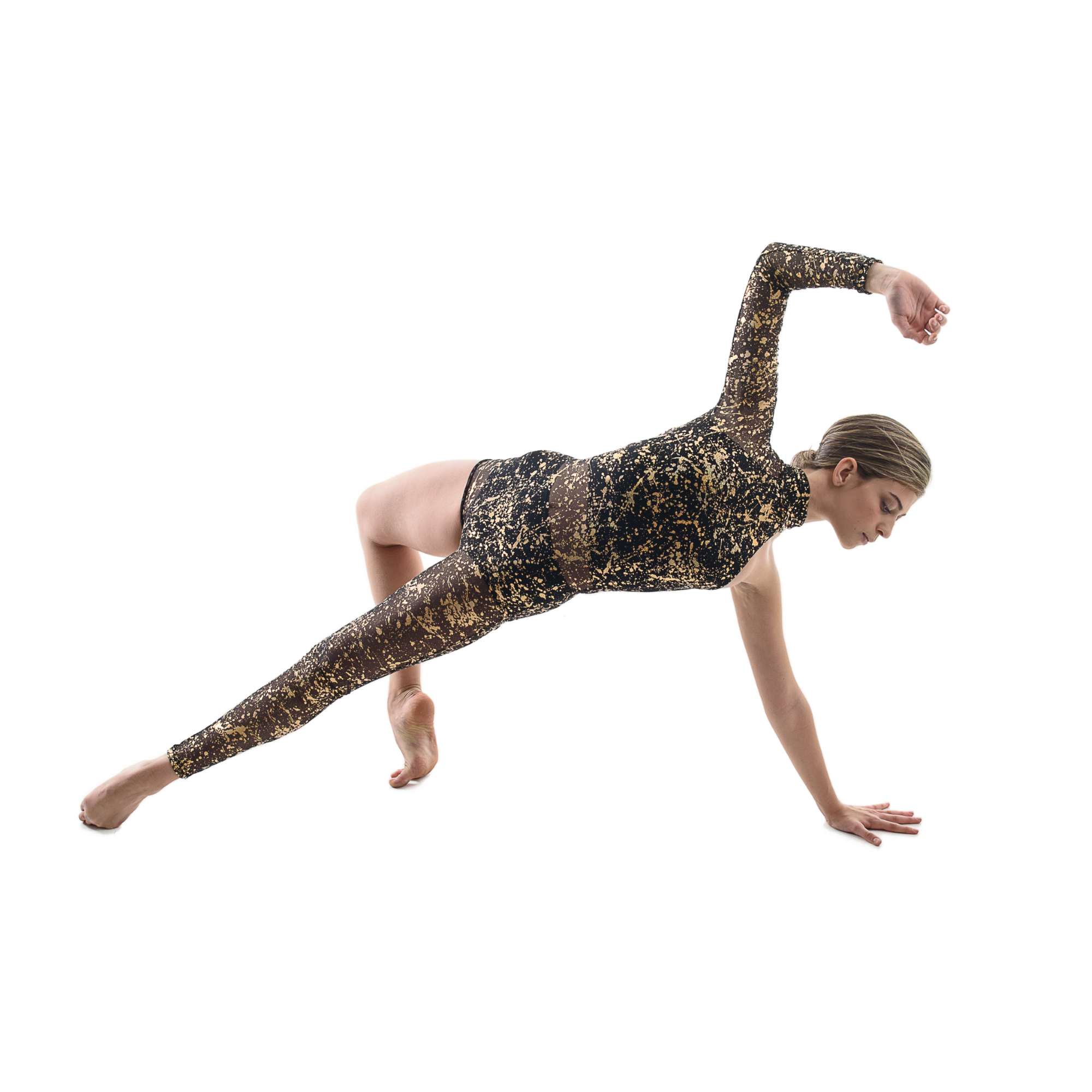 Accademico smanicato in retina e lycra con chiusura sul collo e schiena scoperta.