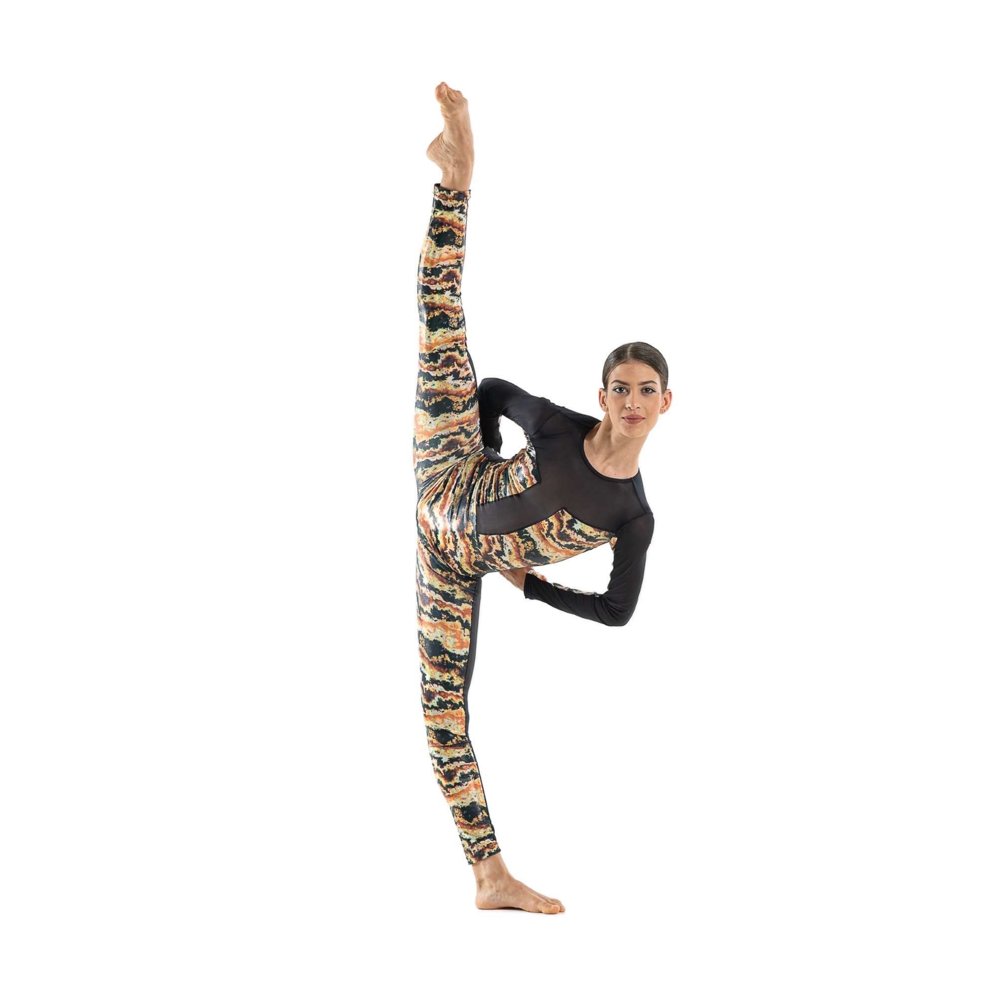 Accademico lungo in lycra fantasia ed inserti in retina semitrasparente, schiena scoperta e chiusura con gancetto sul collo.