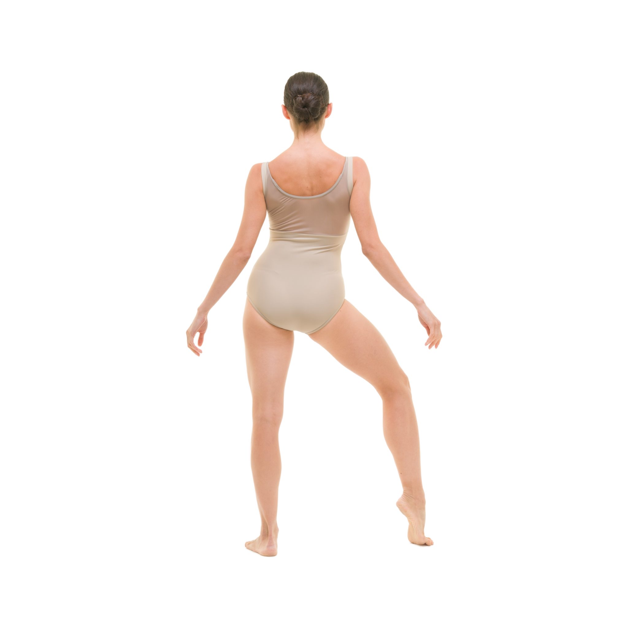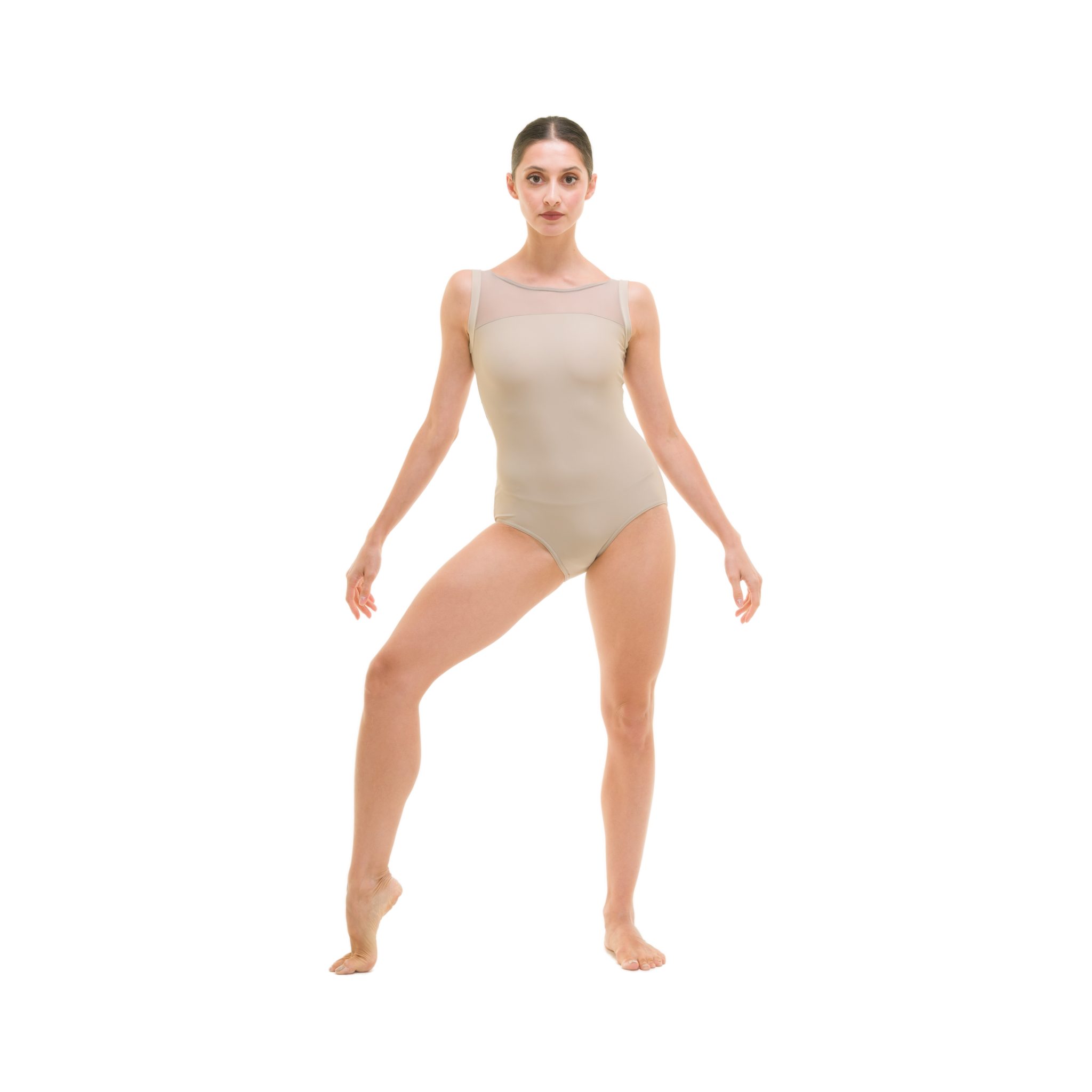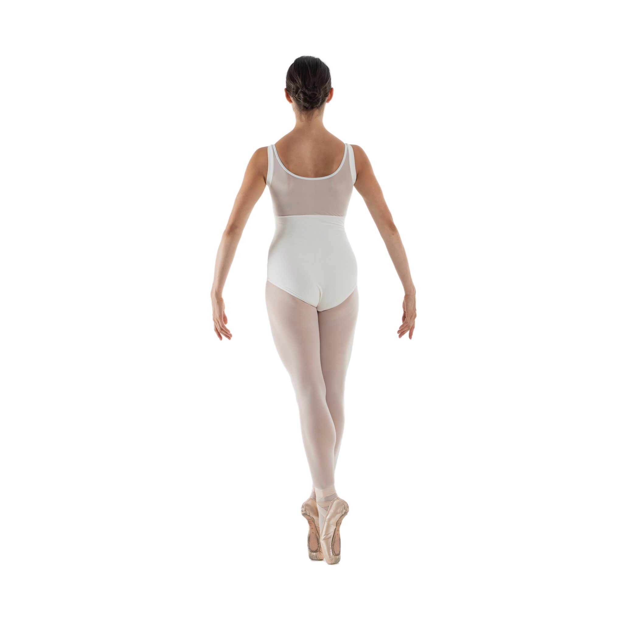 Body danza classica in lycra e retina semitrasparente (Siviglia) sulla parte alta dello scollo e sulla schiena e con bordini in lycra sul giro manica.