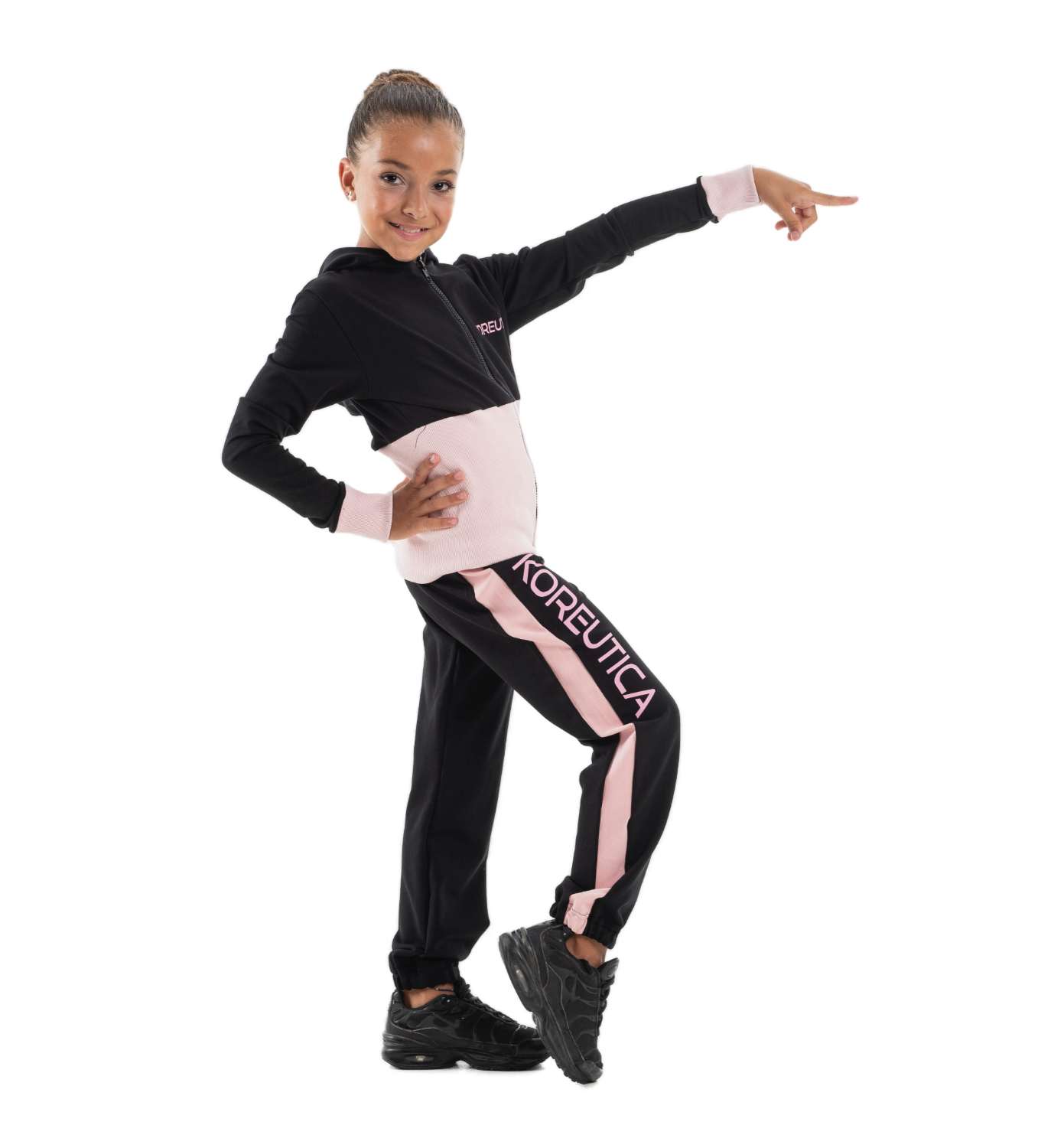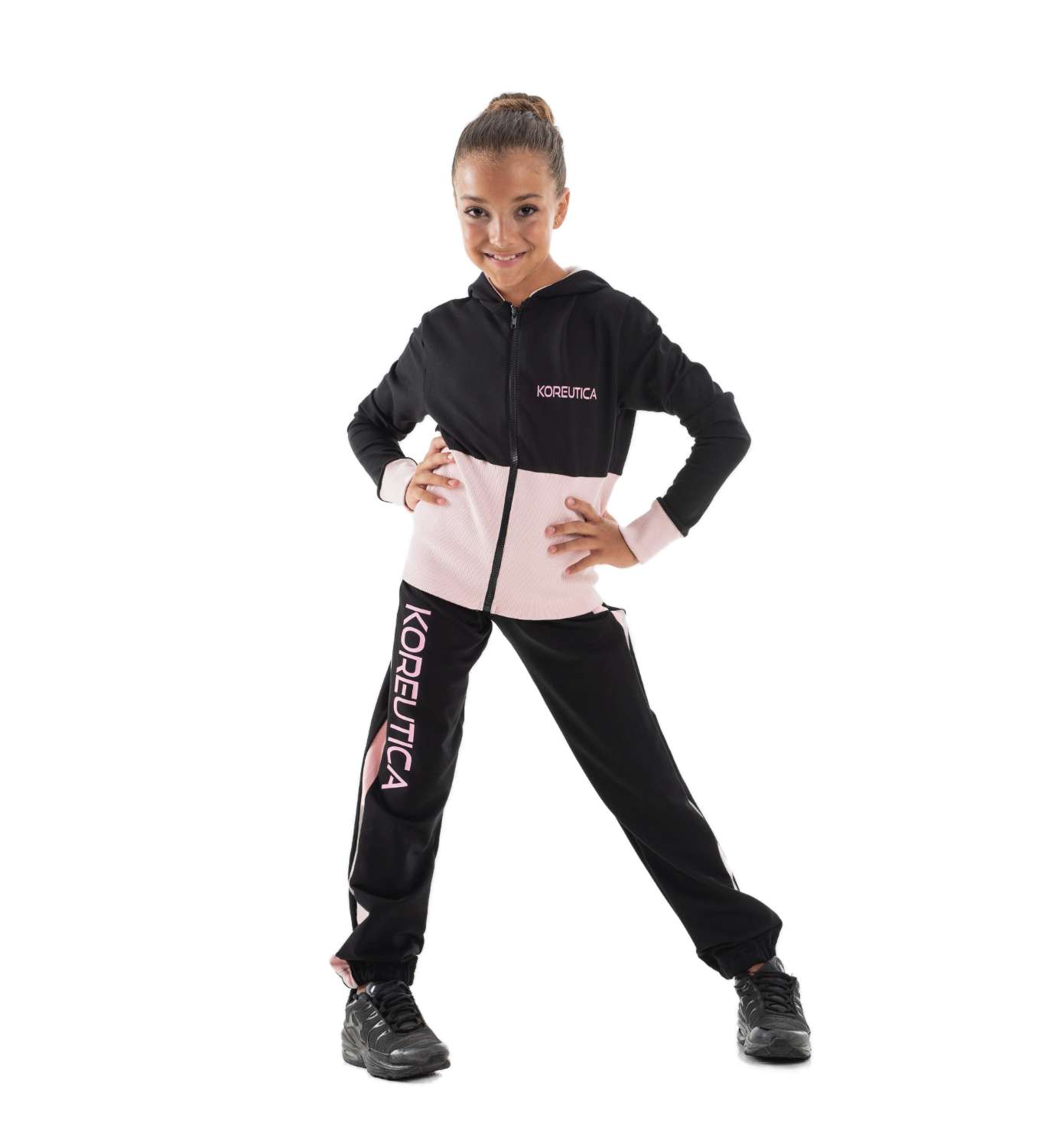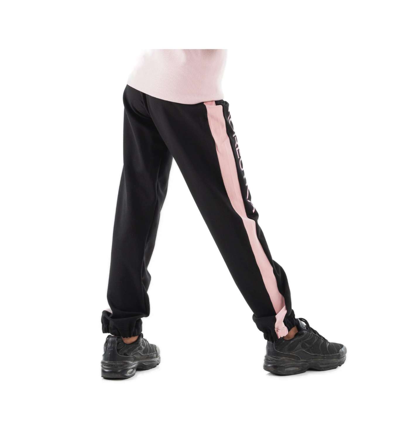 Pantalone in felpina di cotone bi-elastica con elastici in vita e alle caviglie e banda laterale.