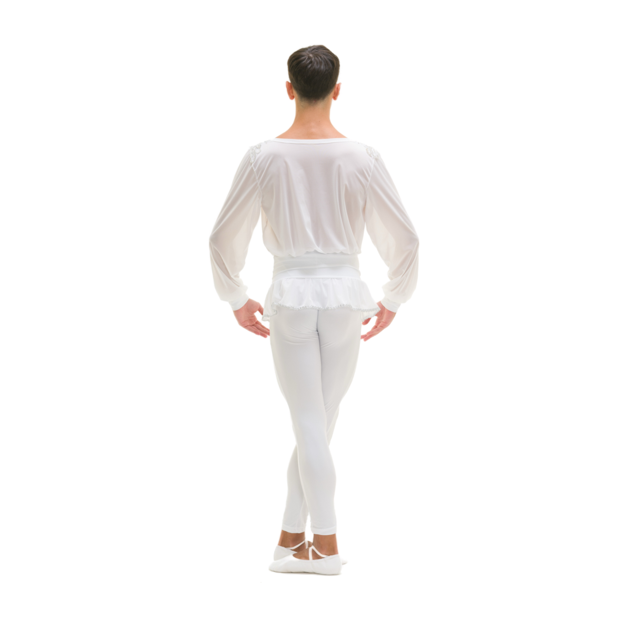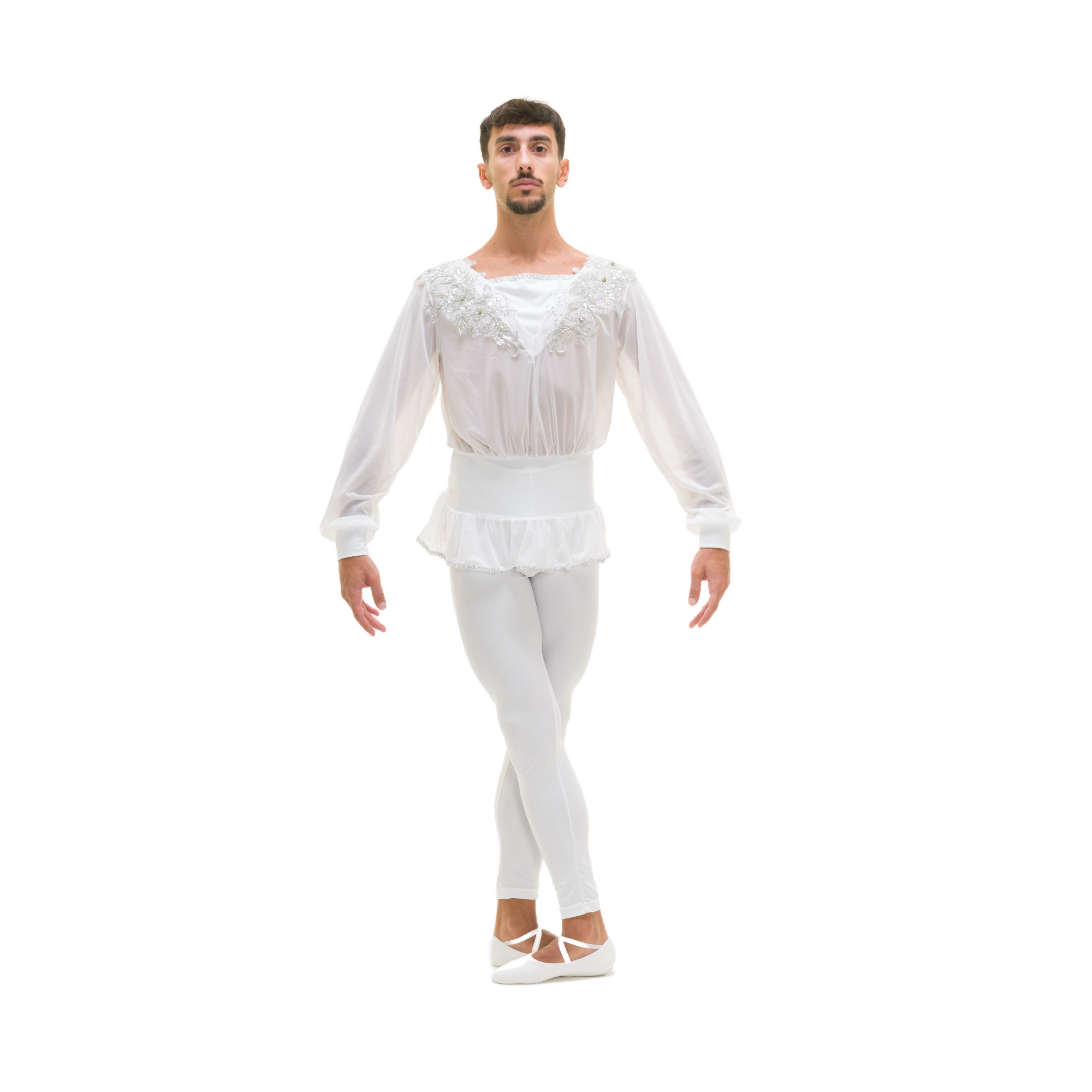 Completo composto da casacca in retina semitrasparente (Siviglia) con fascia in lycra cucita in vita, scollo a V con inserto in lycra, maniche ampie con polsini in lycra, passamaneria argento al fondo, decoro argento su spalle e scollo.