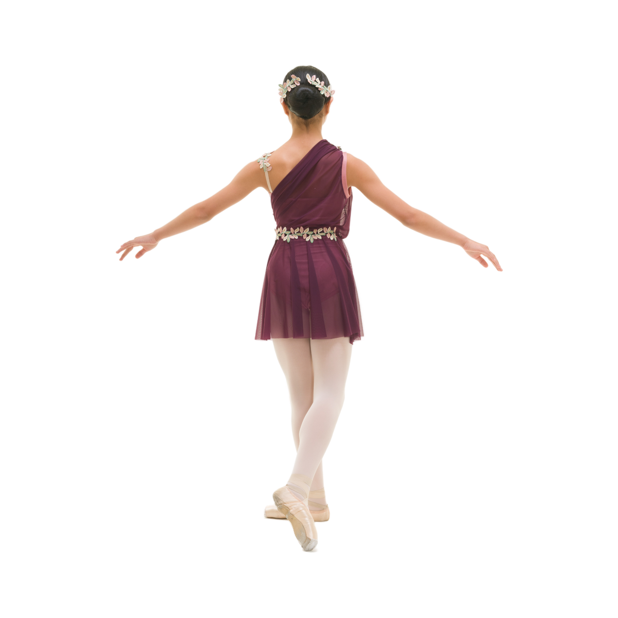 Completo composta da vestito in retina, mono-spalla, con gonna a ruota ed elastico in vita e da un body a spallina sottile color carne in lycra. Decorato con foglie ricamate su spallina sinistra, sul petto e dietro in vita.