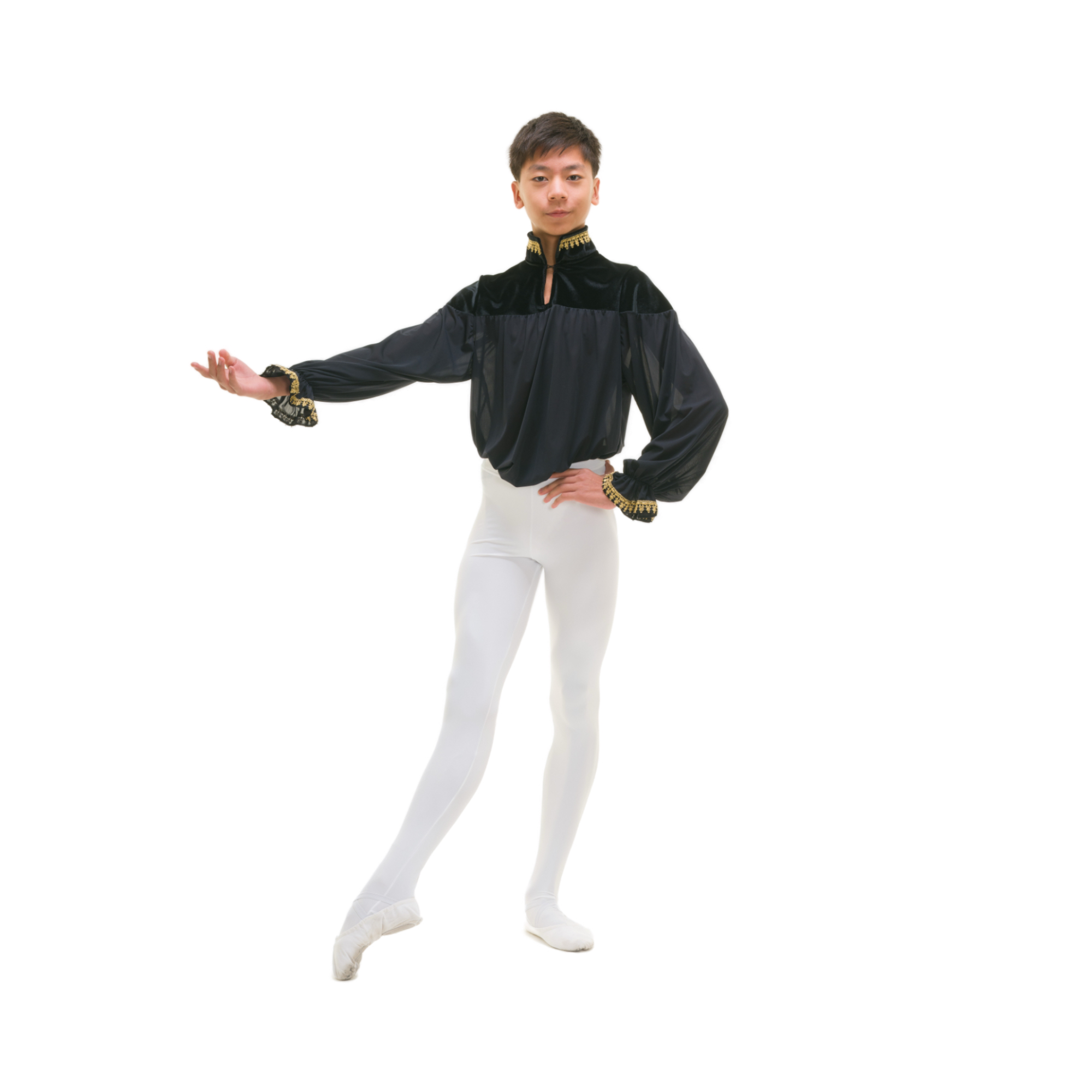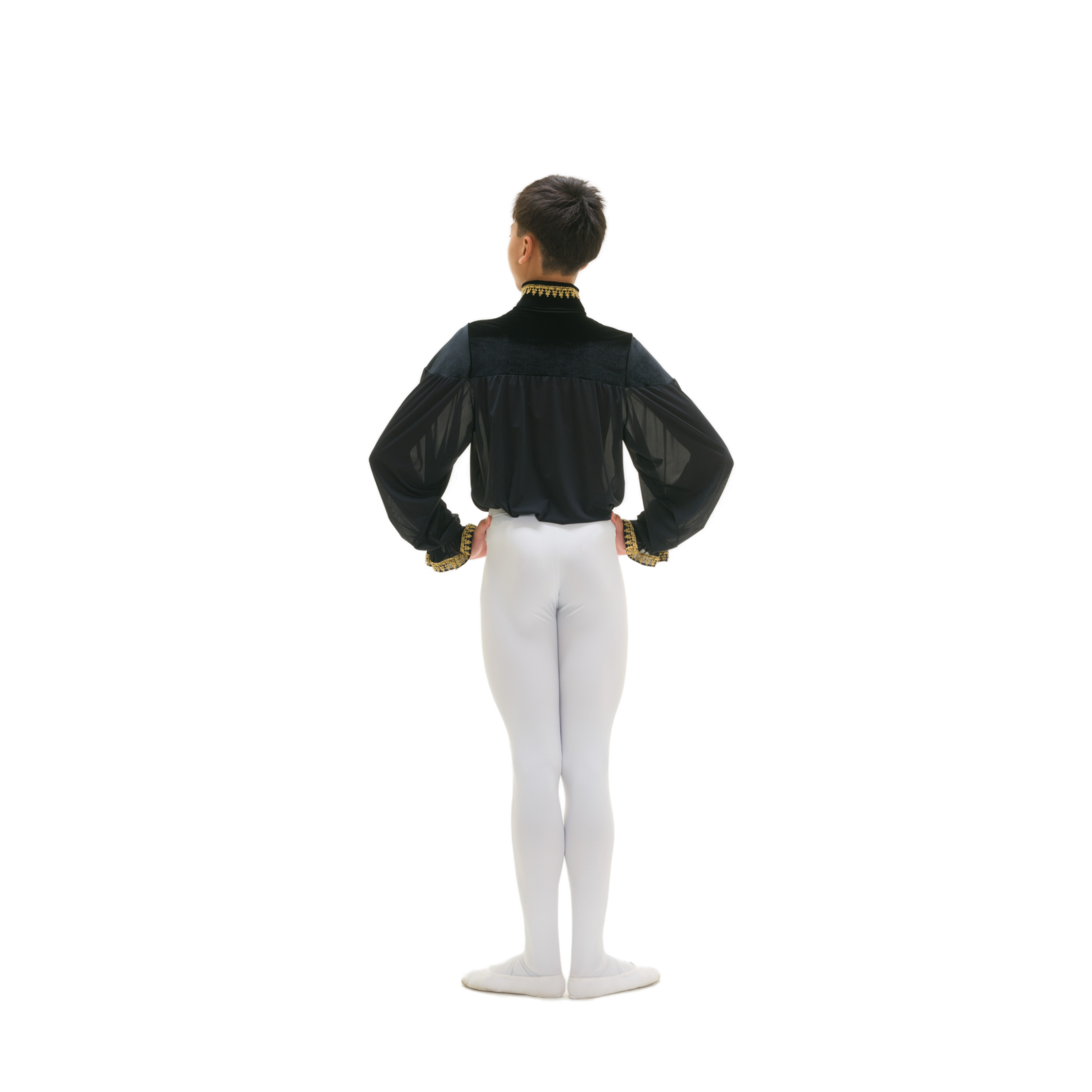 Completo composto da camicia a body a perizoma in retina semitrasparente (Siviglia) e parte alta in velluto, colletto con passamaneria e gancetto, elastico su polsi con passamaneria al fondo e fouseaux in lycra con piede.