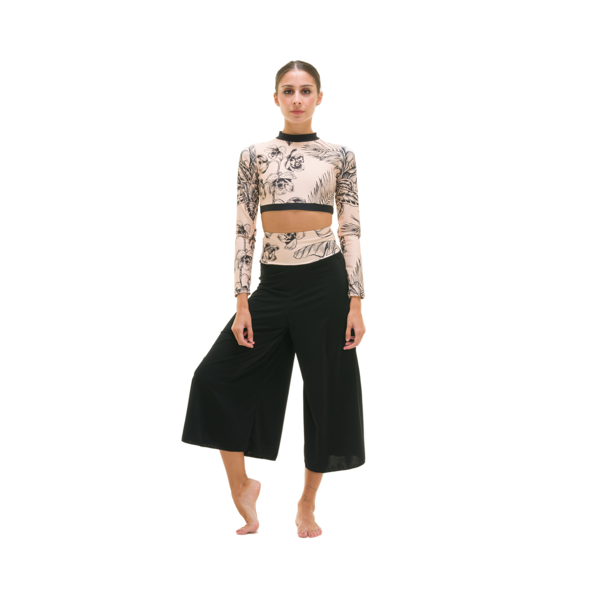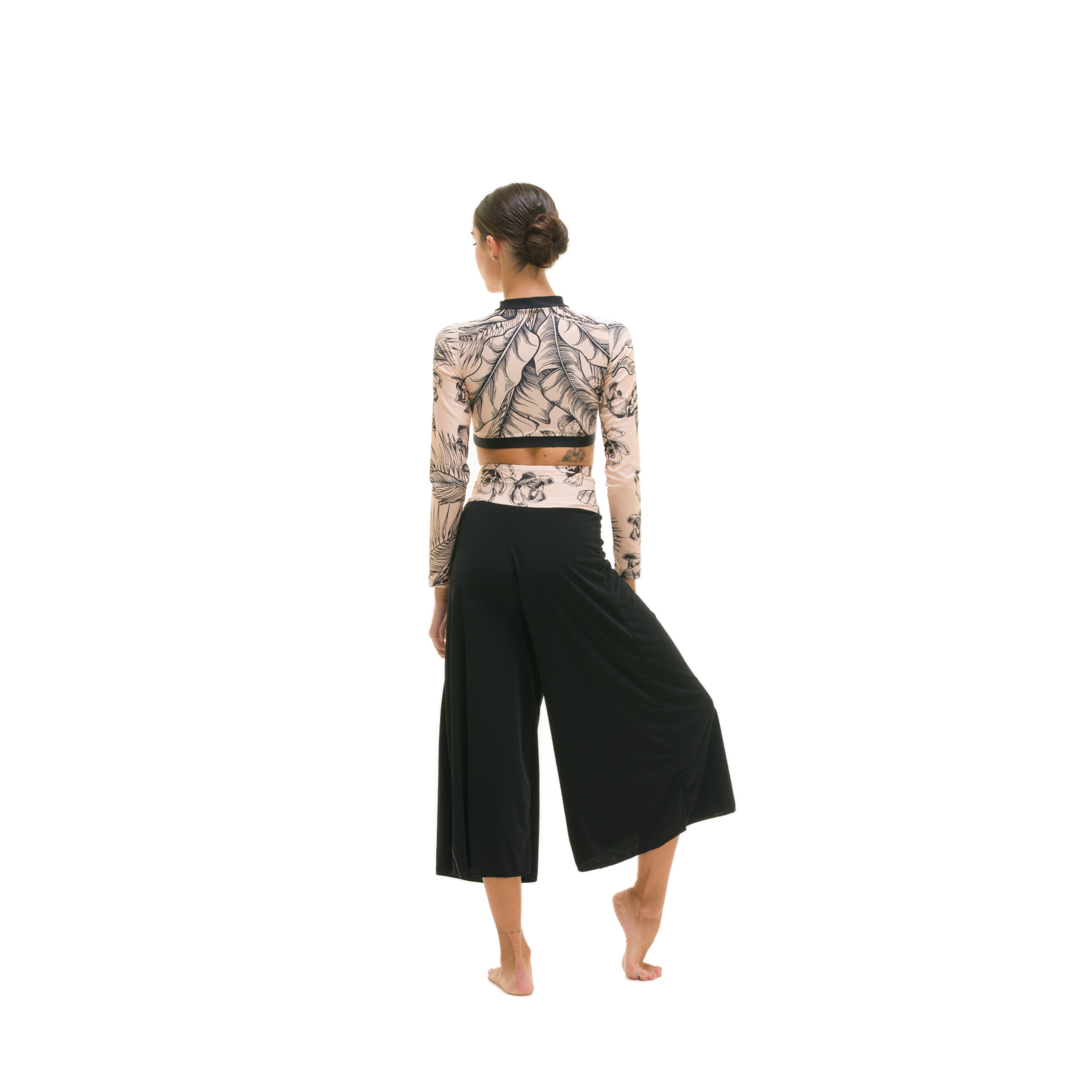 Completo composto da Top in fantasia fiori nudo/nero, maniche lunghe, colletto e bordino in lycra. Pantalone in maglina, svasato al fondo, lunghezza sotto polpaccio, fascia alta in fantasia fiori nudo/nero.
