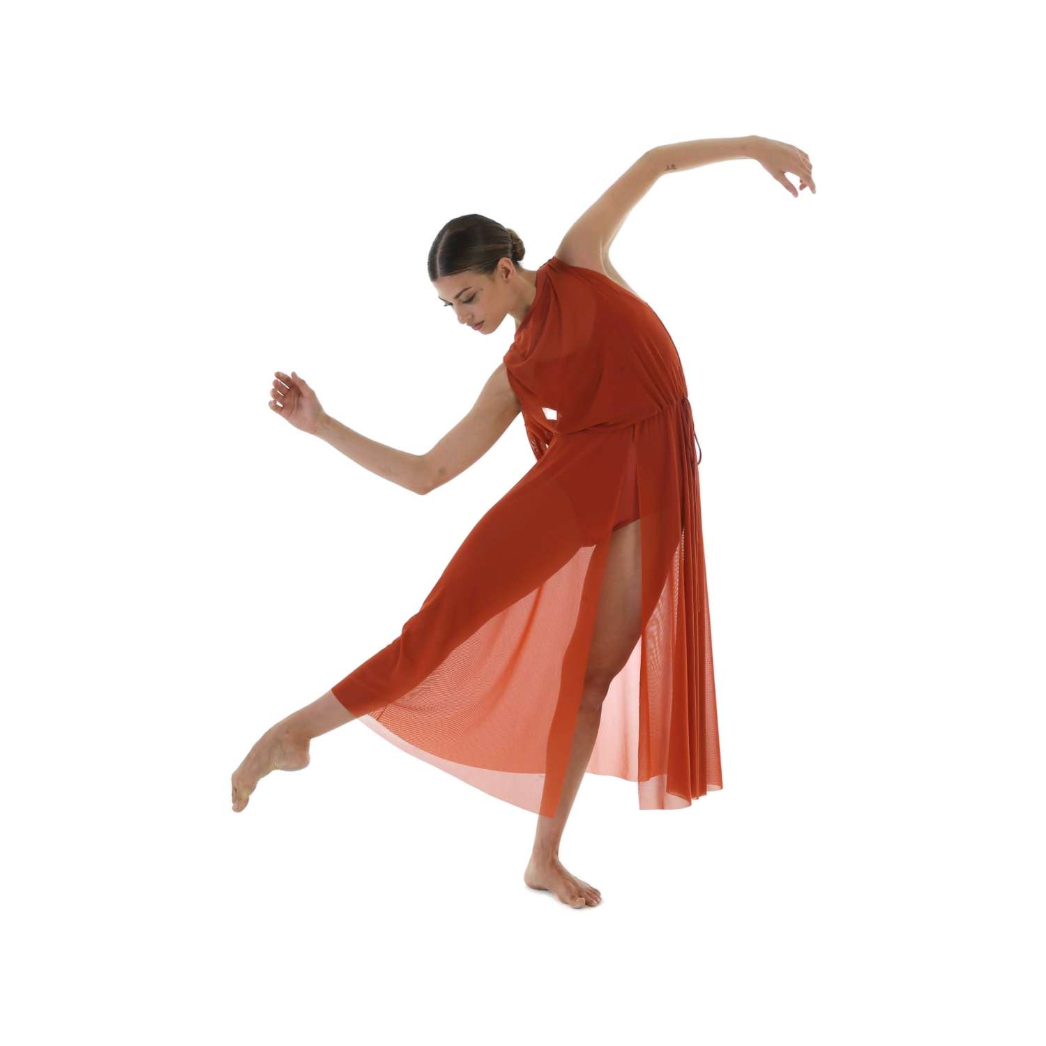 Completo composto da vestito in retina con coulisse in vita e cordino in lycra, drappo a scoprire schiena, gonna con spacco frontale su tutta la lunghezza e Body in lycra a spallina con arricciatura davanti