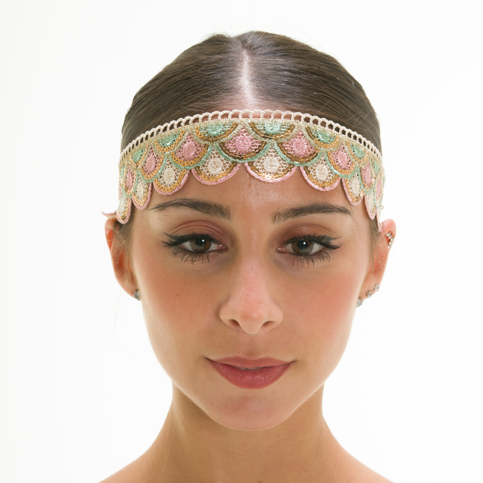 ACCESSORIO: Fascia di decoro ricamato con paillettes con nastro di lycra per fissarlo allo chignon.