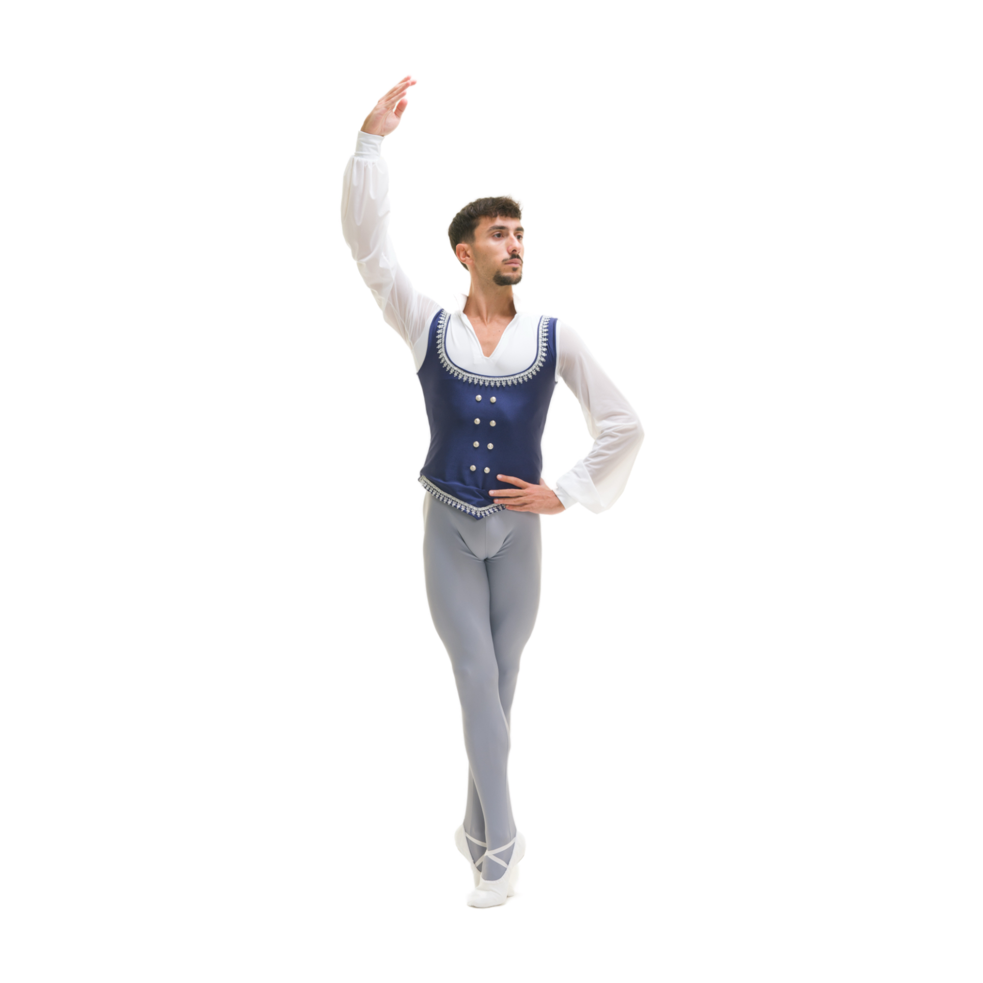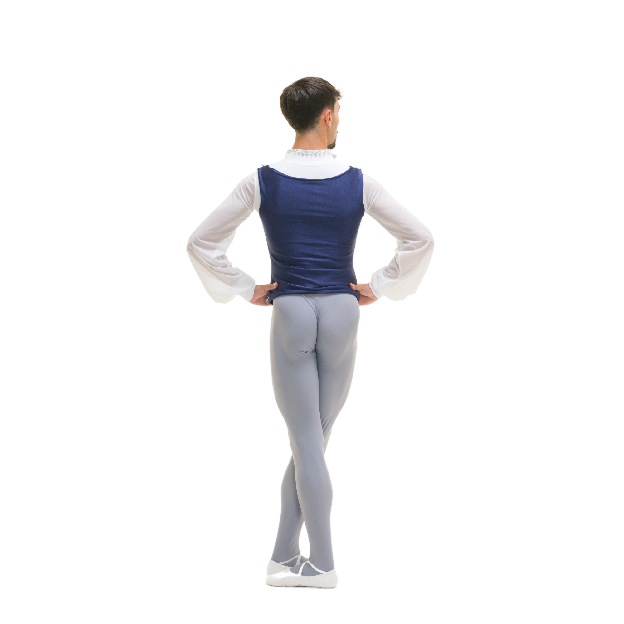 Completo composto da camicia aderente con busto in lycra e maniche in retina semitrasparente (Siviglia) con polsino, colletto. Fouseaux in lycra con piede. Gilet chiuso e tutto doppiato in lycra, passamaneria argento, bottoni argento.
