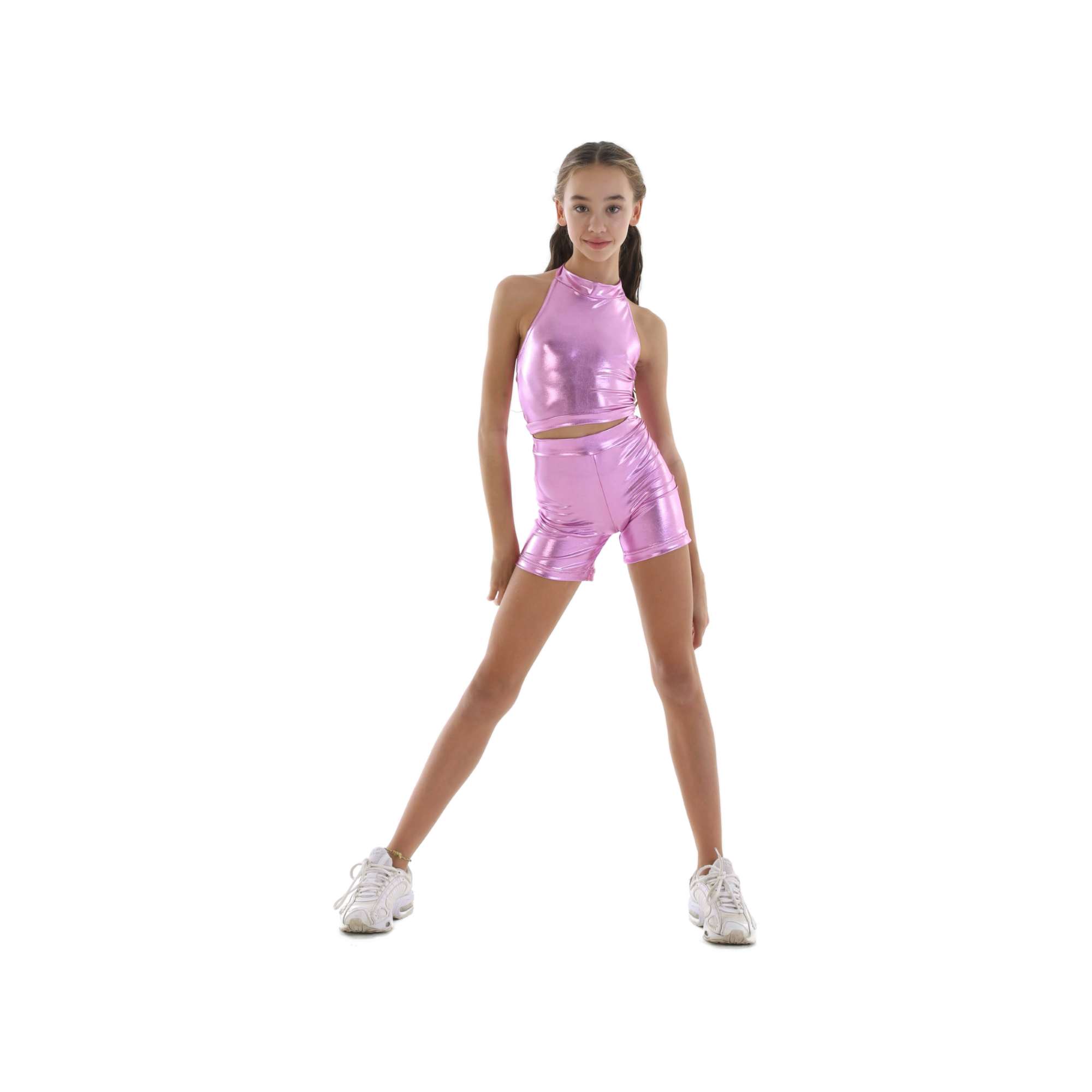 Completo in lycra spalmata composto da Top smanicato con colletto e schiena nuda e Short a vita alta con fascia in vita.
