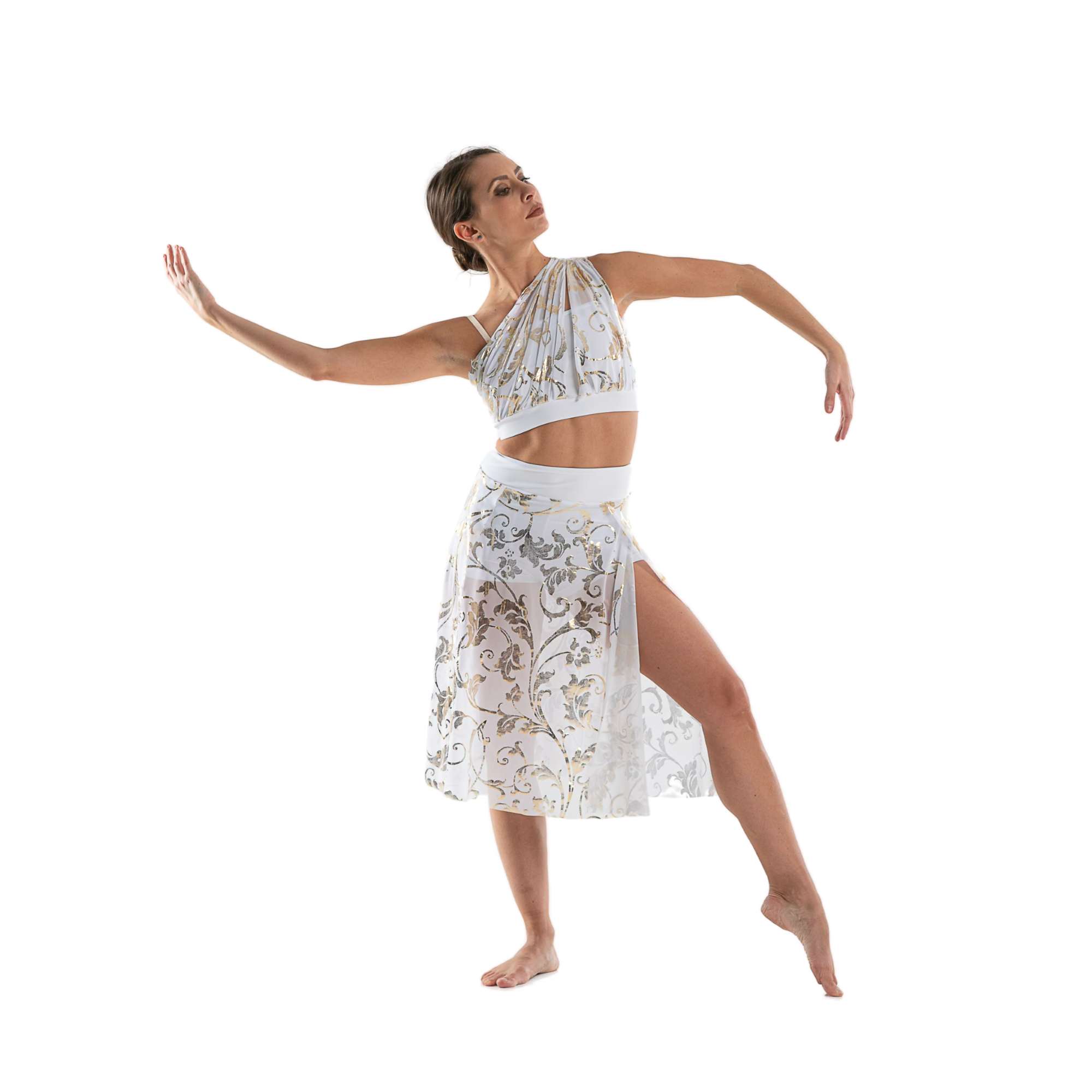 Completo composto da top in lycra doppiato in retina fantasia e short in lycra con gonna doppio spacco in retina fantasia.