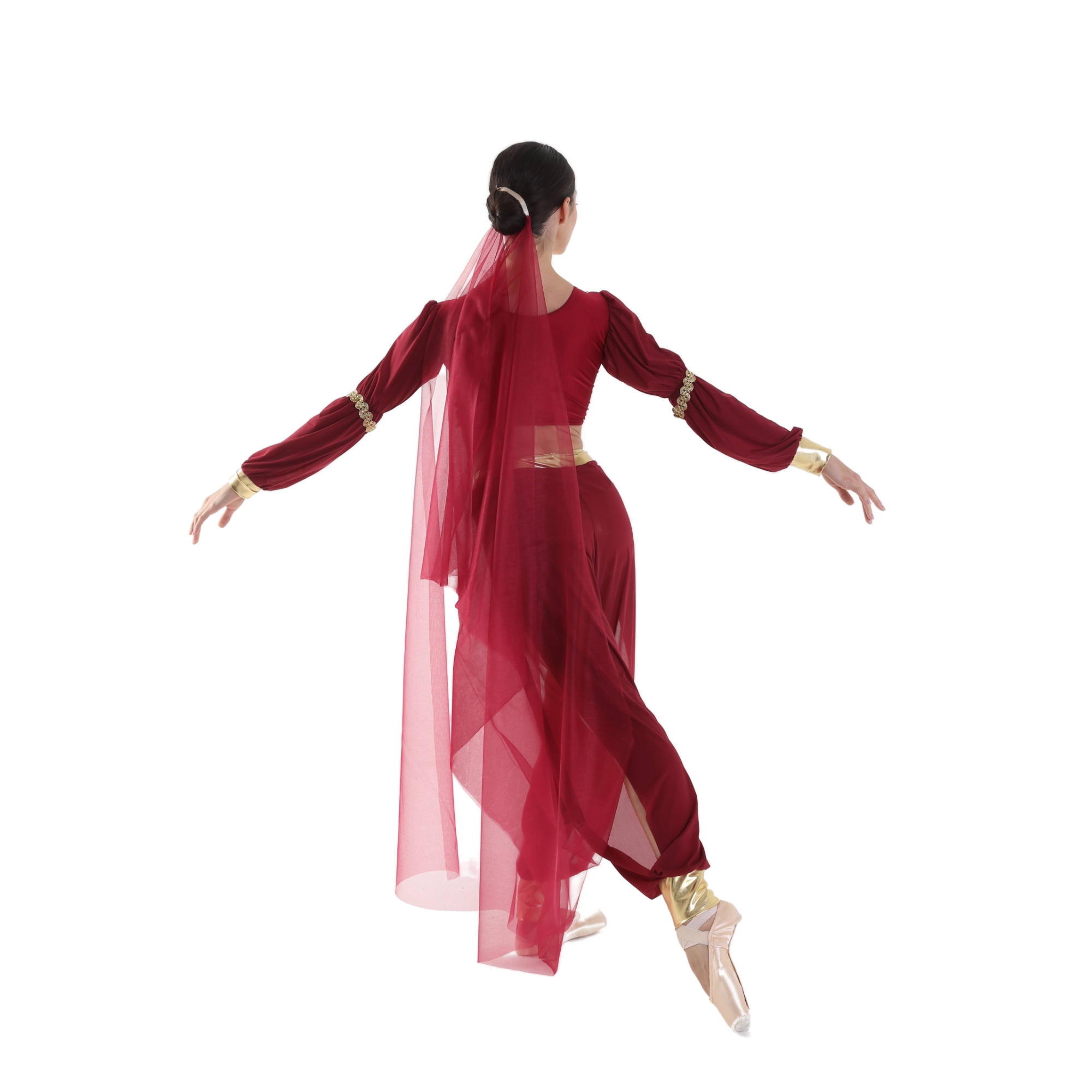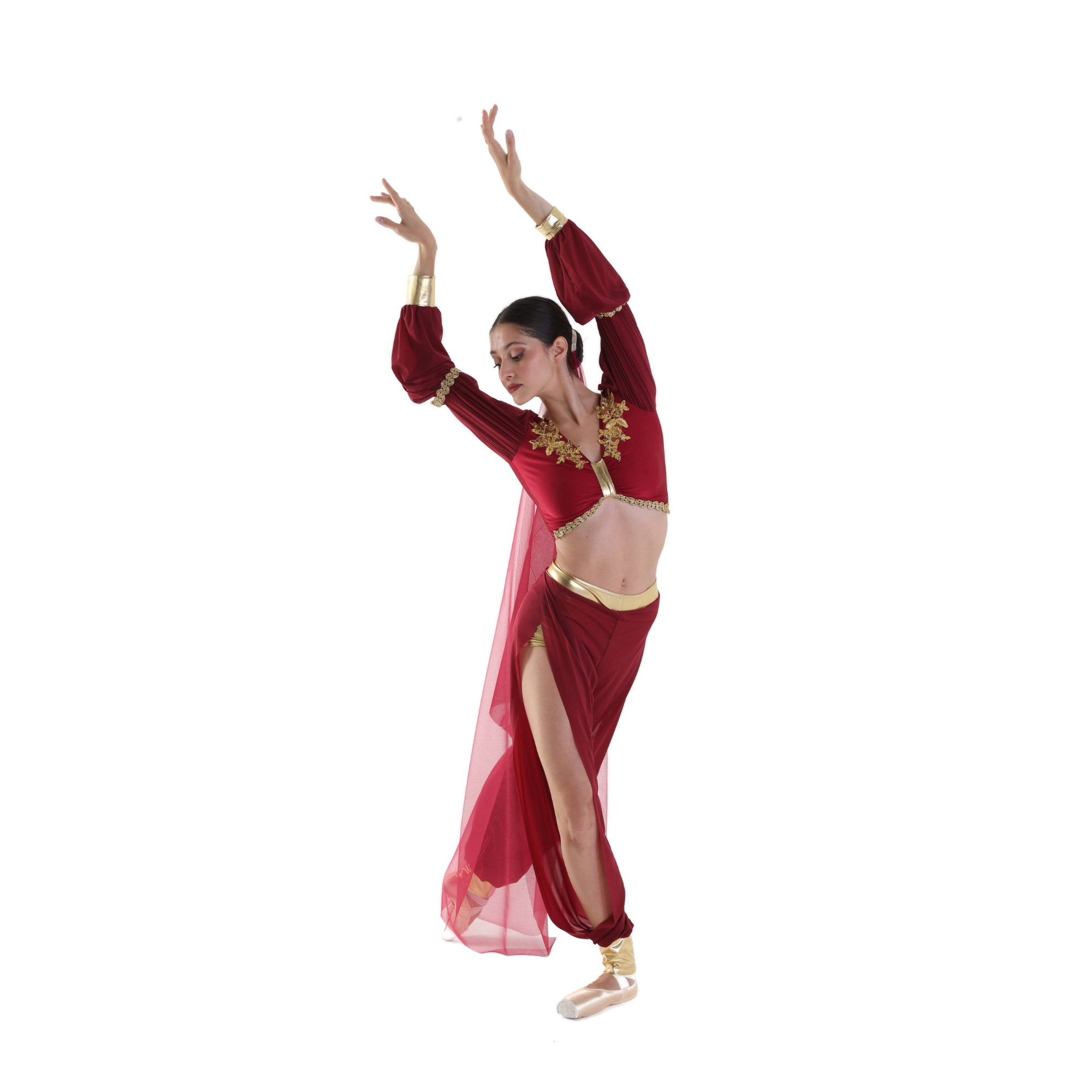 Completo composto da pantalone in retina semitrasparente (Siviglia) aperto ai lati montato su short in lycra spalmata oro, polsini alti alle caviglie. Top in lycra con maniche a sbuffo lunghe in retina semitrasparente (Siviglia), particolari in lycra spalmata oro, ricamo oro con paillettes, passamaneria oro sotto seno e al gomito. Velo in tulle scintilla con elastico color carne per applicazione su chignon.