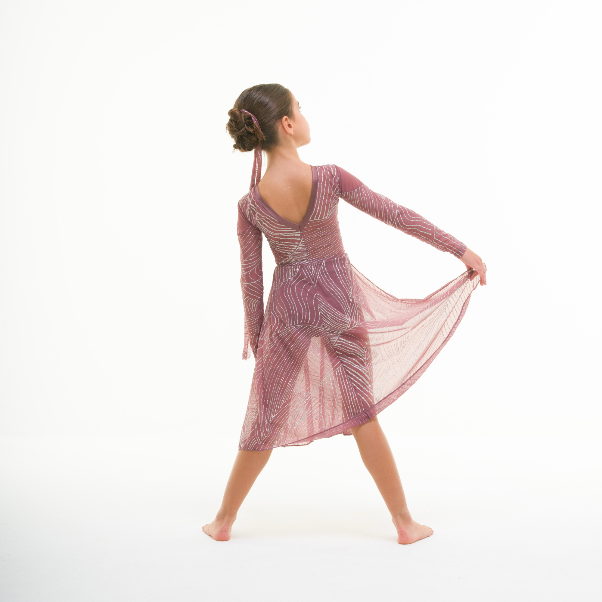 Completo composto da vestito in retina e retina glamour luccicante, seno foderato in lycra, maniche lunghe, scollo a V dietro nella schiena, gonna con pannello centro davanti a creare due spacchi. Coulotte a vita alta in lycra.