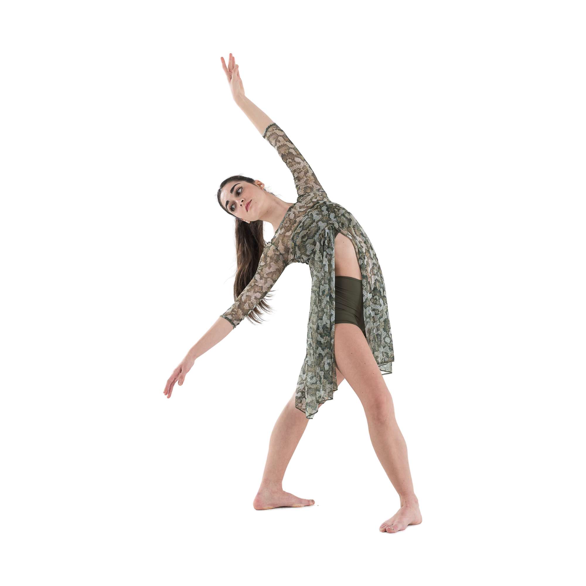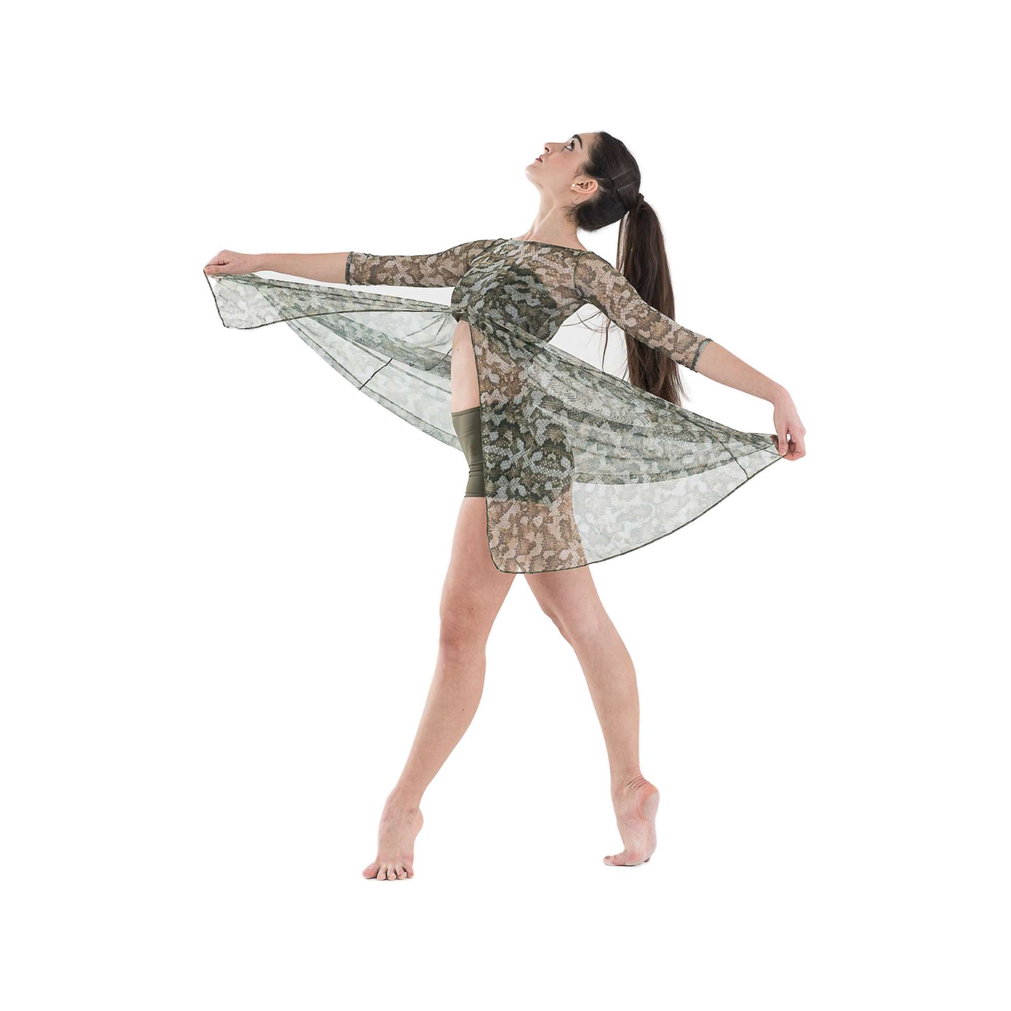 Completo composto da top accollato con veli in retina fantasia e culotte a vita alta in lycra.