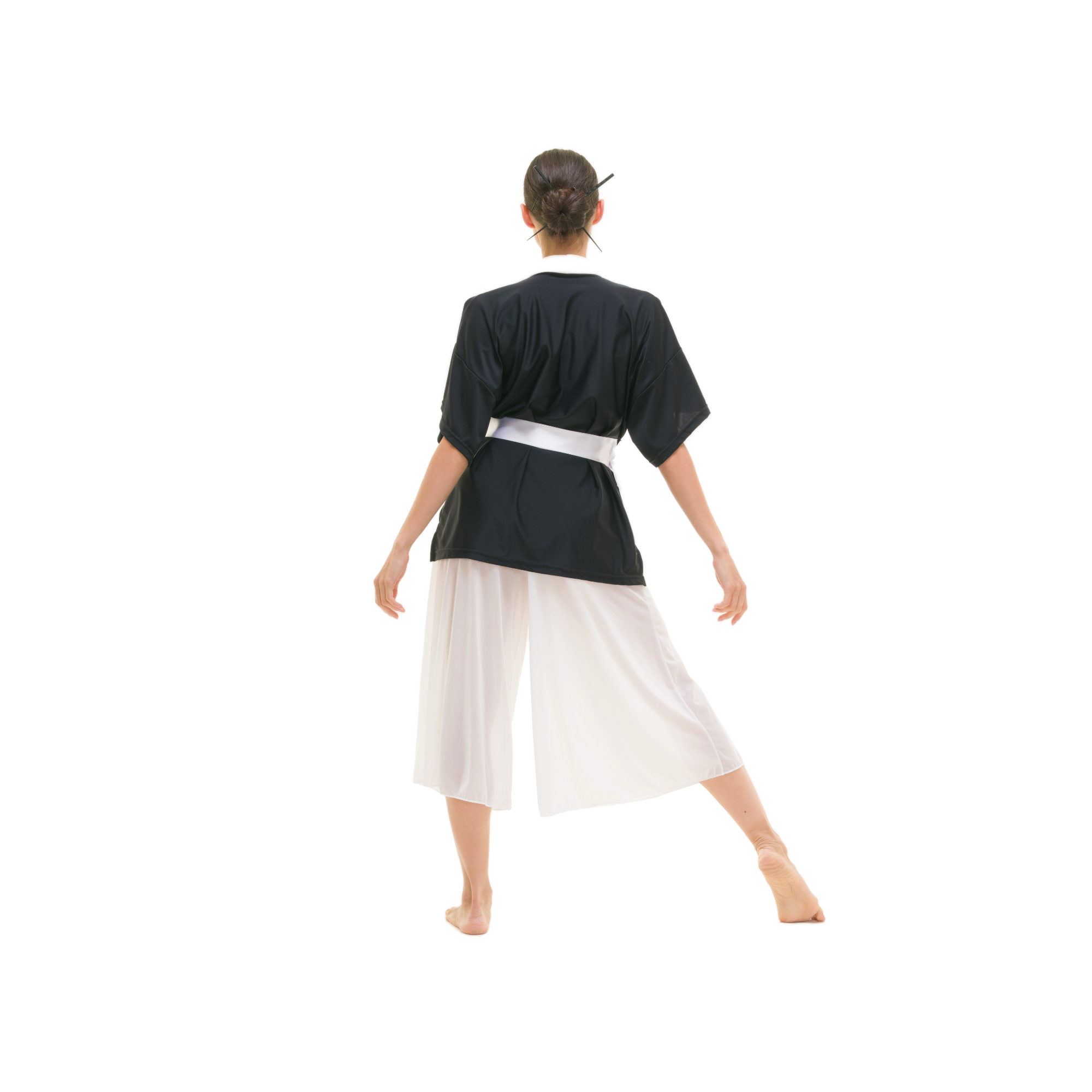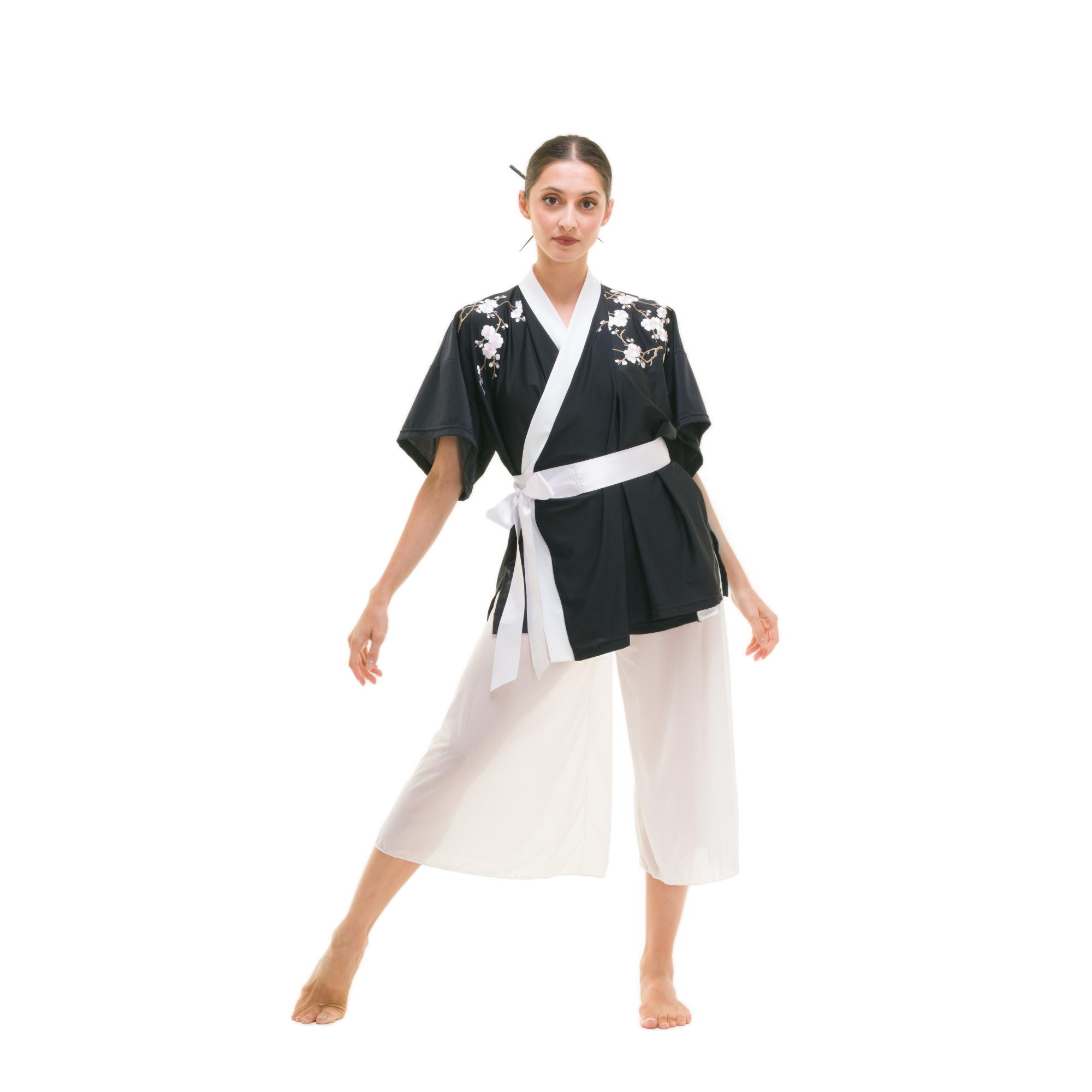 Completo composto da Kimono in lycra con bordatura a contrasto e nastro raso per chiuderlo. Decori fiori ciliegio. Coulotte in lycra. Pantalone in retina semitrasparente (Siviglia) su cinturino, svasato al fondo, lunghezza sotto polpaccio. Coulotte in lycra.
