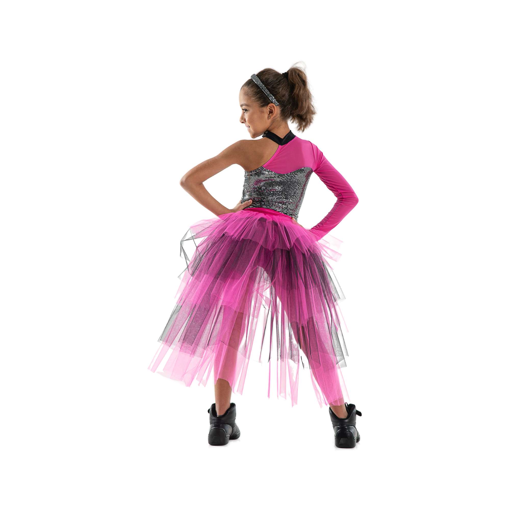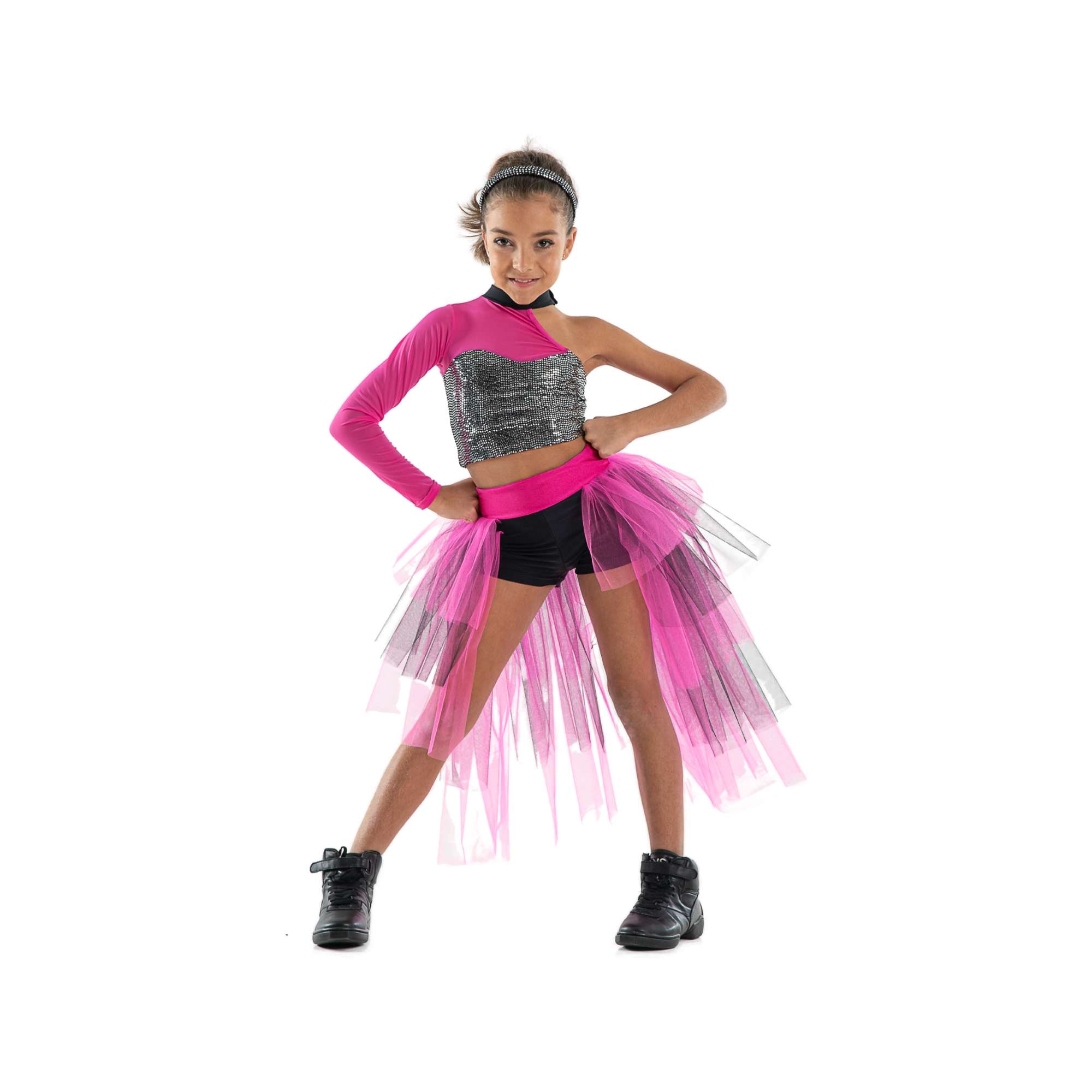 Completo composto da top mono-manica in lycra, tessuto paillettes e retina semitrasparente (Siviglia) con tutulette 5 veli scalati, bicolore, montata si culotte in lycra