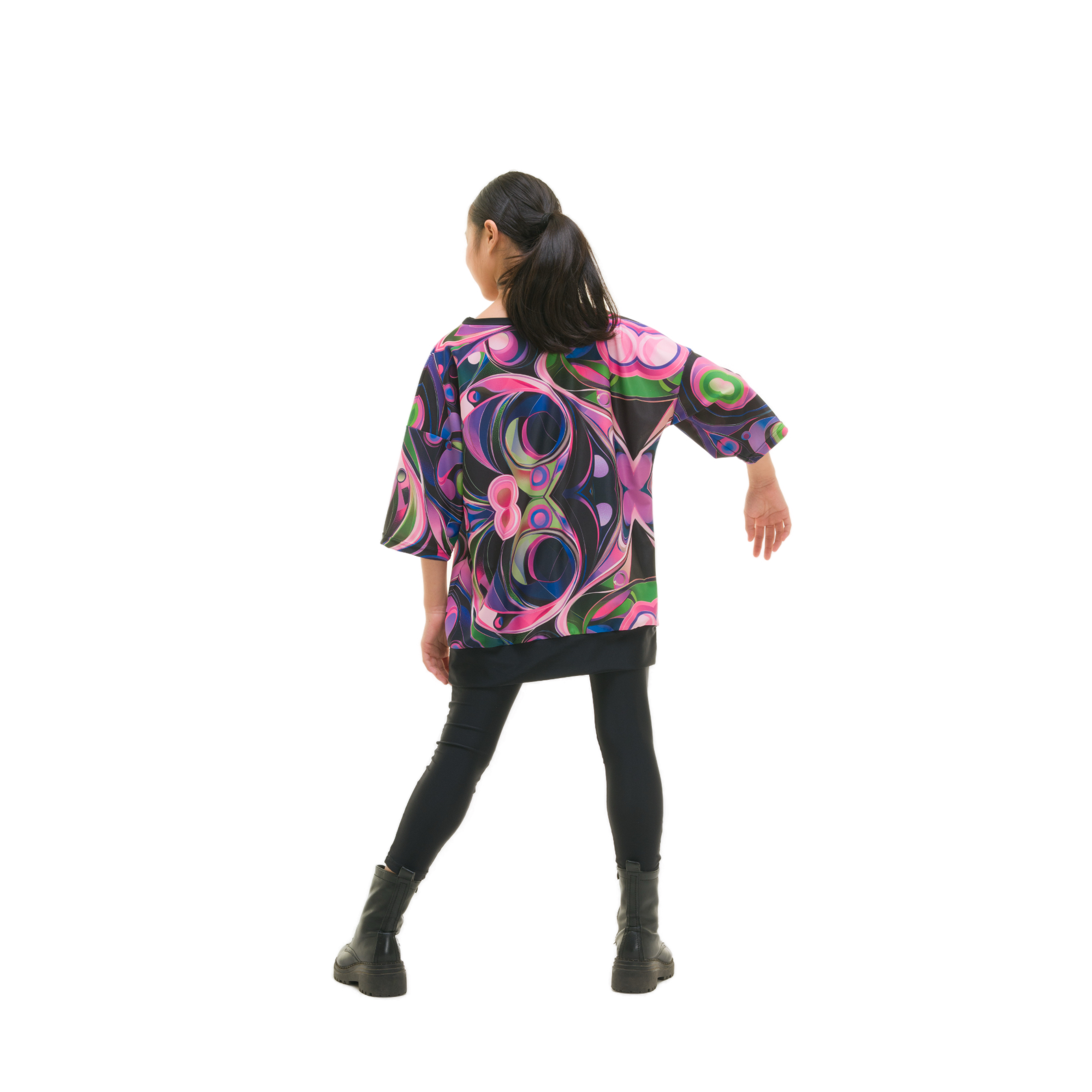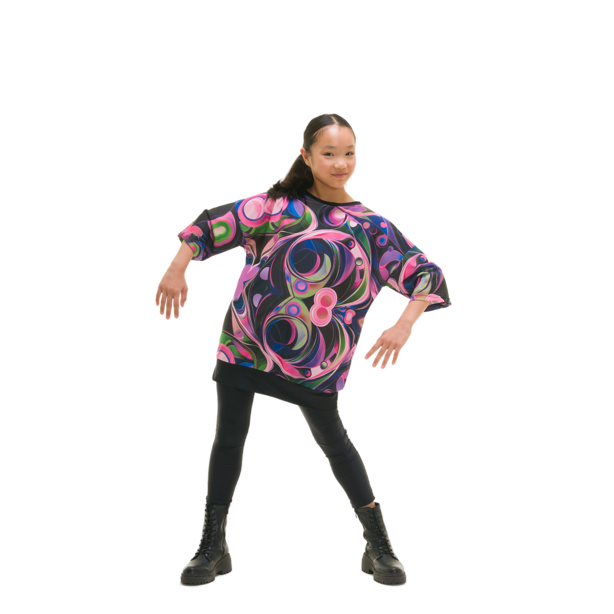 Completo composto da Maxi-maglia in fantasia vortice rosa, bordino collo e fascia in lycra. Leggings in lycra.
