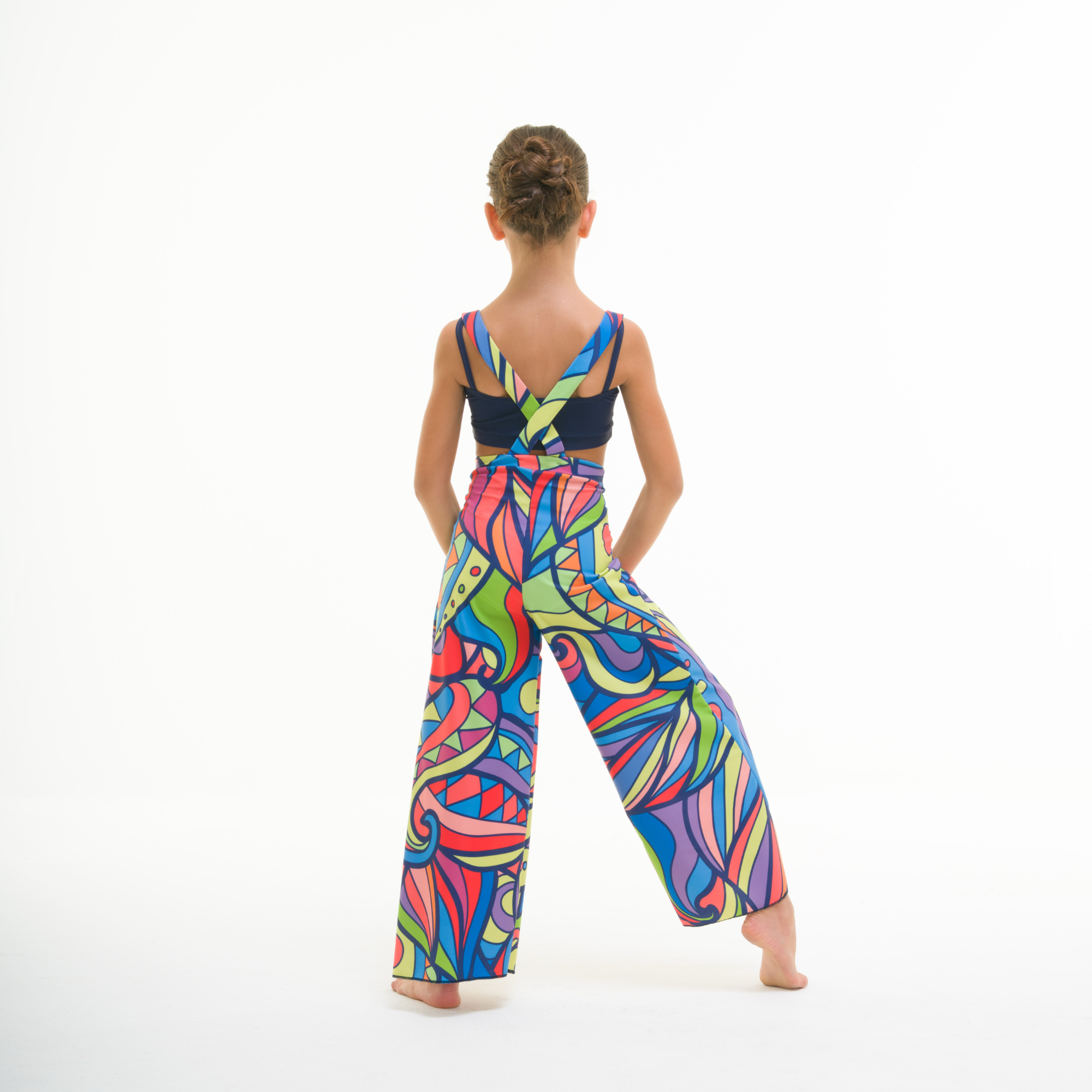 Completo composto da Top in lycra con spalline e bordino sottoseno. Pantalone in lycra fantasia fantasy, gamba svasata al fondo, bretelle insertate davanti e libere dietro per permettere la regolazione. Lunghezza alla caviglia.