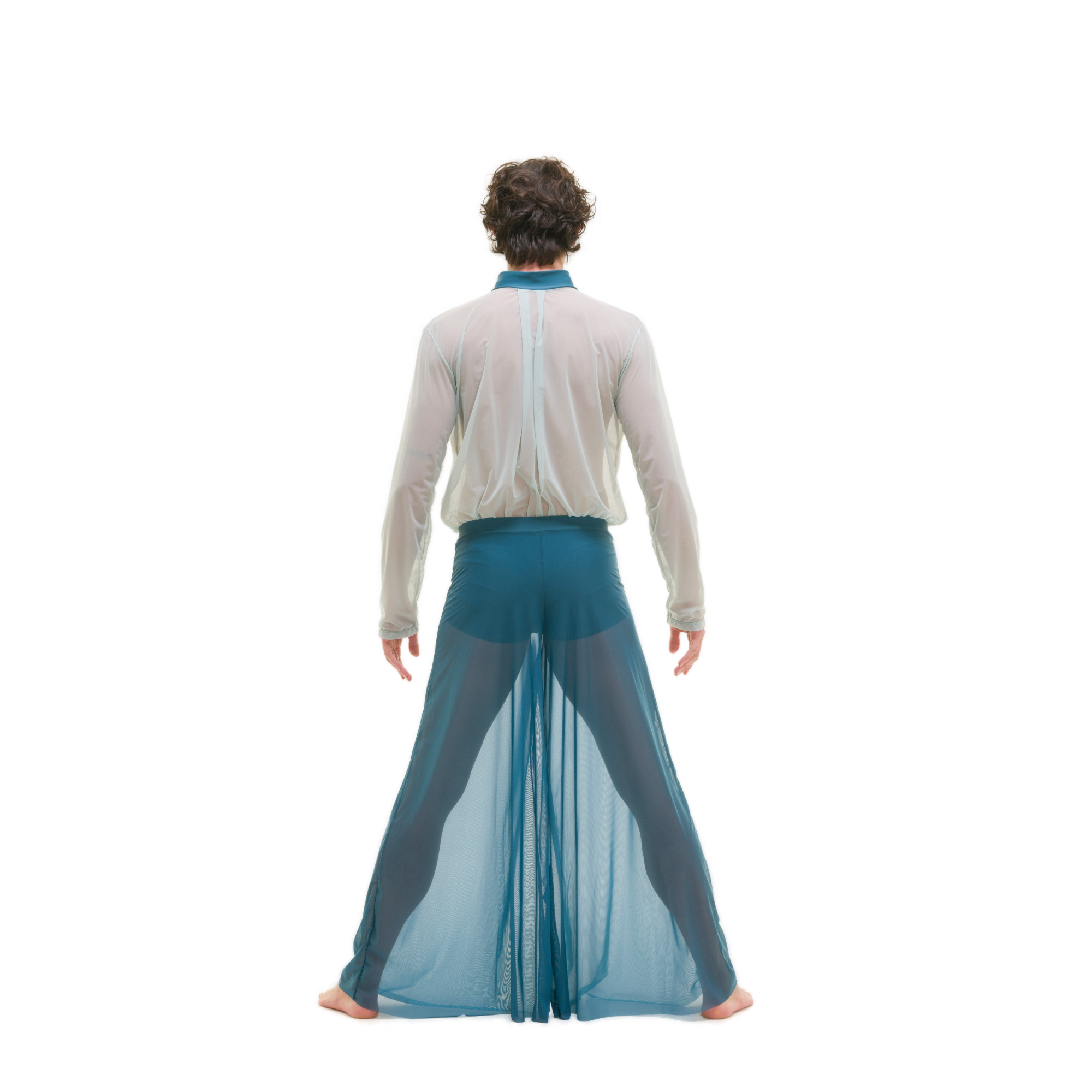Completo composto da Camicia in retina attaccata a short in lycra, inserti in lycra, manica lunga, apertura con poissoires. Pantalone svasato in retina montato su cinturino con elastico, lunghezza alla caviglia.
