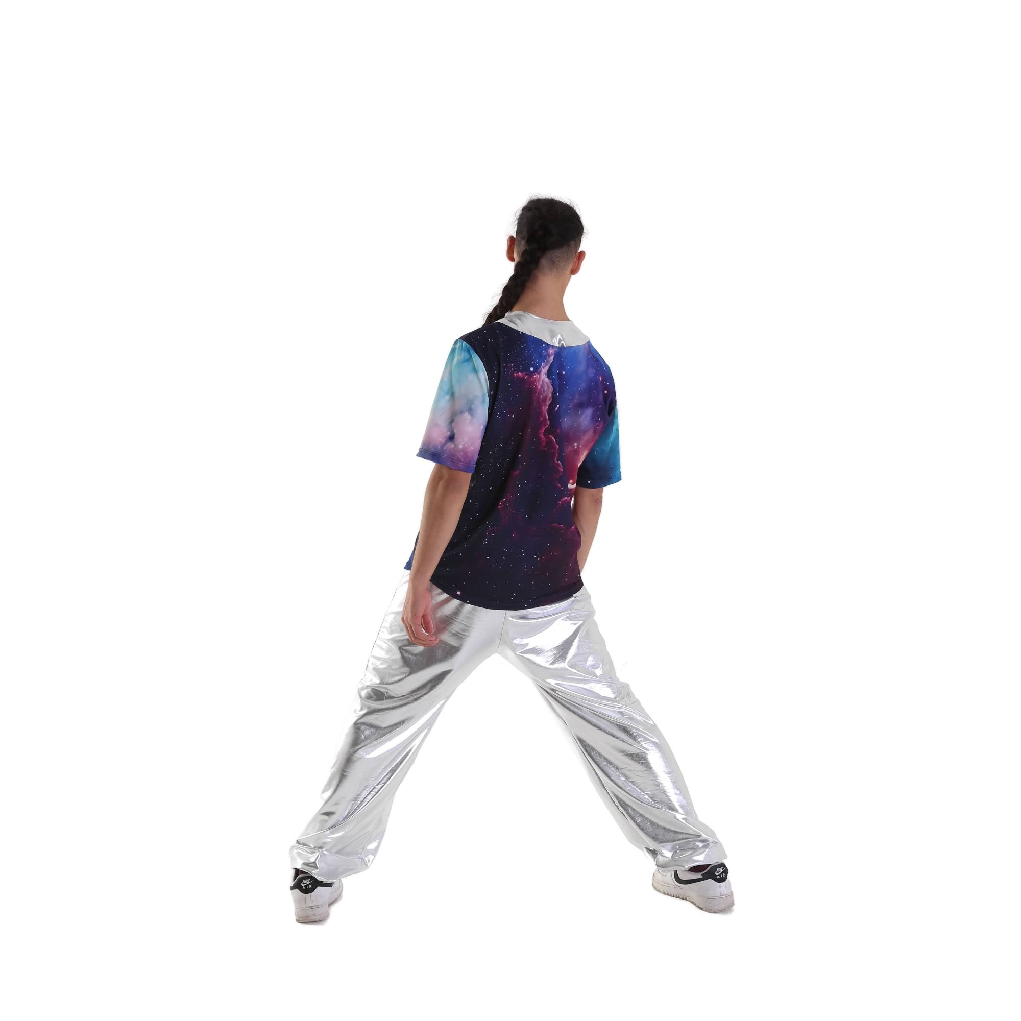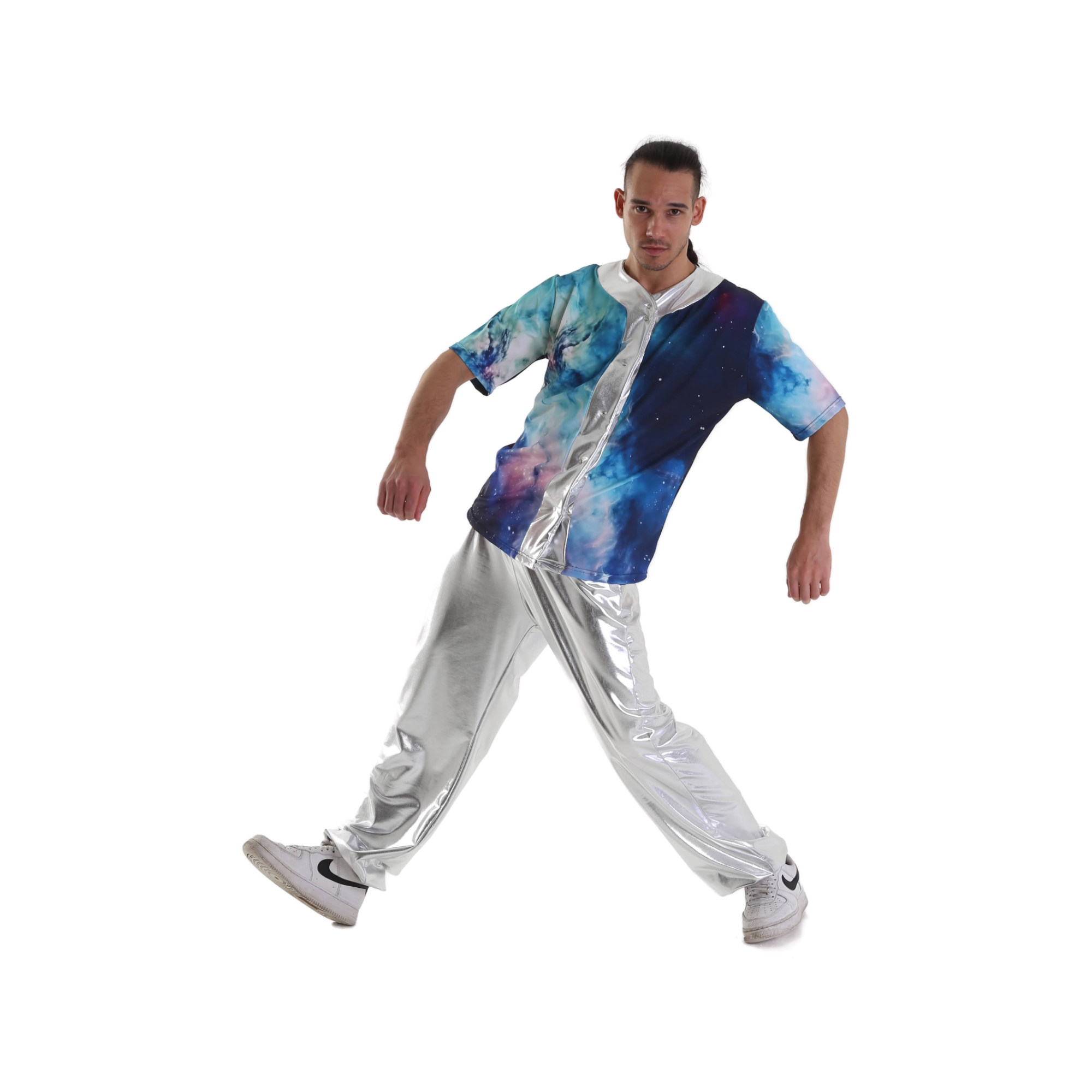 Completo composto da Camicia maniche corte, vestibilità ampia, in fantasia nebulosa con inserto in lycra spalmata argento, poissoires. Pantalone ampio in lycra spalmata argento, elastico in vita ed alle caviglie.
