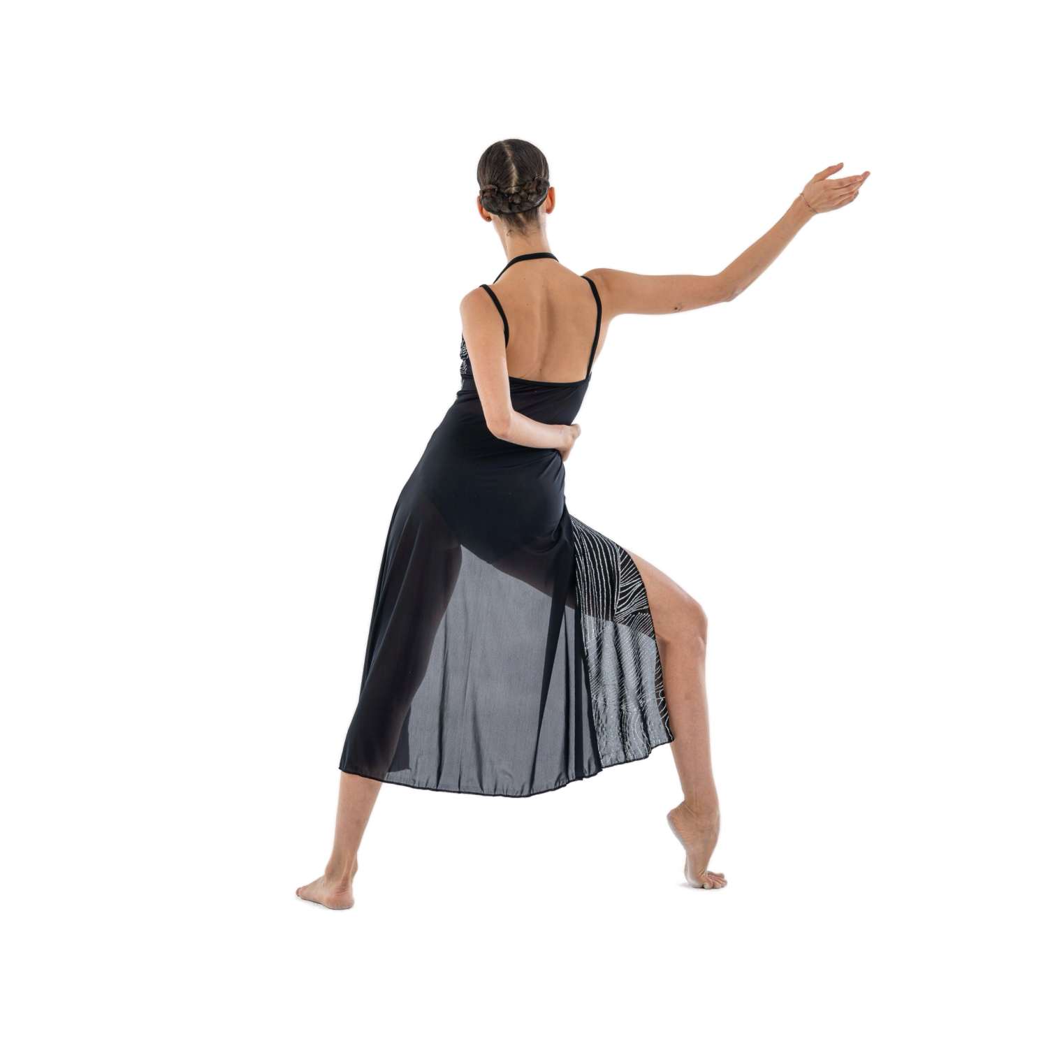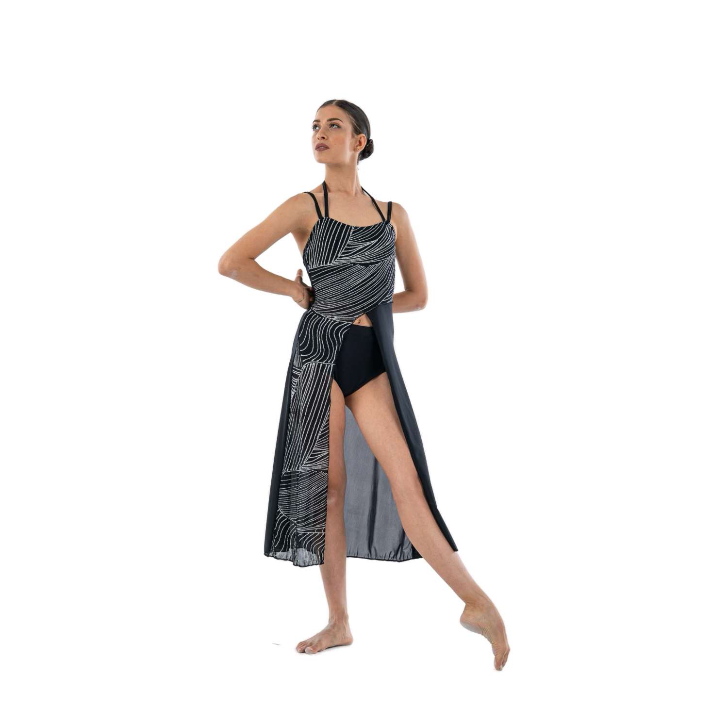 Completo composto da vestito in lycra e retina semitrasparente (Siviglia) e retina fantasia luminosa, lunghezza al polpaccio, spacco frontale, spalline in tinta e culotte a vita alta.