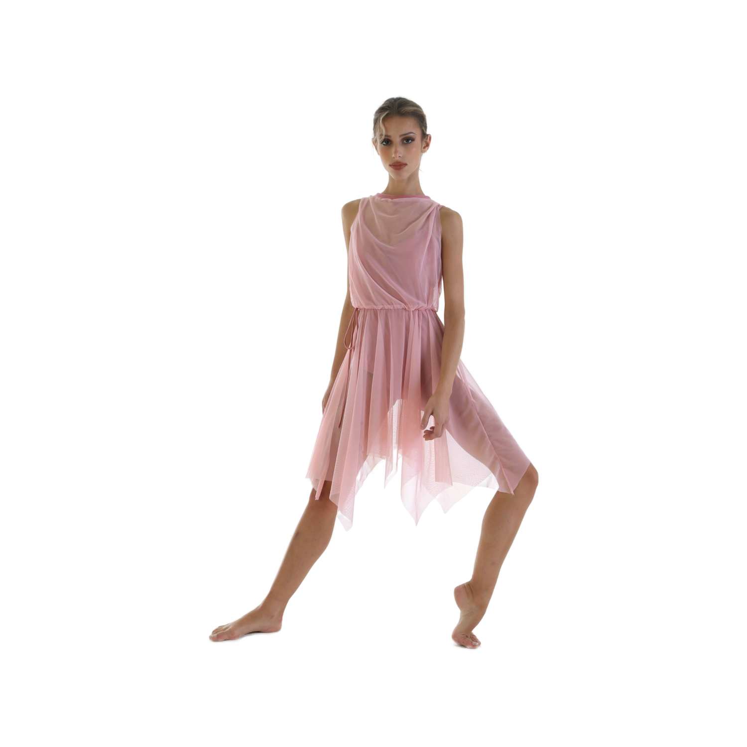 Completo composto da vestito in retina con coulisse in vita e cordino in lycra, drappo a scoprire schiena, gonna a punte asimmetriche e Body in lycra a spallina con arricciatura davanti