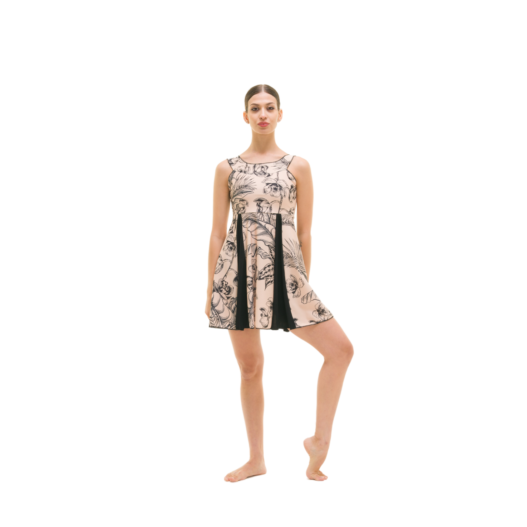 Completo composto da vestito in fantasia fiori nudo/nero, smanicato, seno foderato, gonna a spicchi alternati con maglina nera, molto ampia, scollo barchetta. Coulotte in lycra.