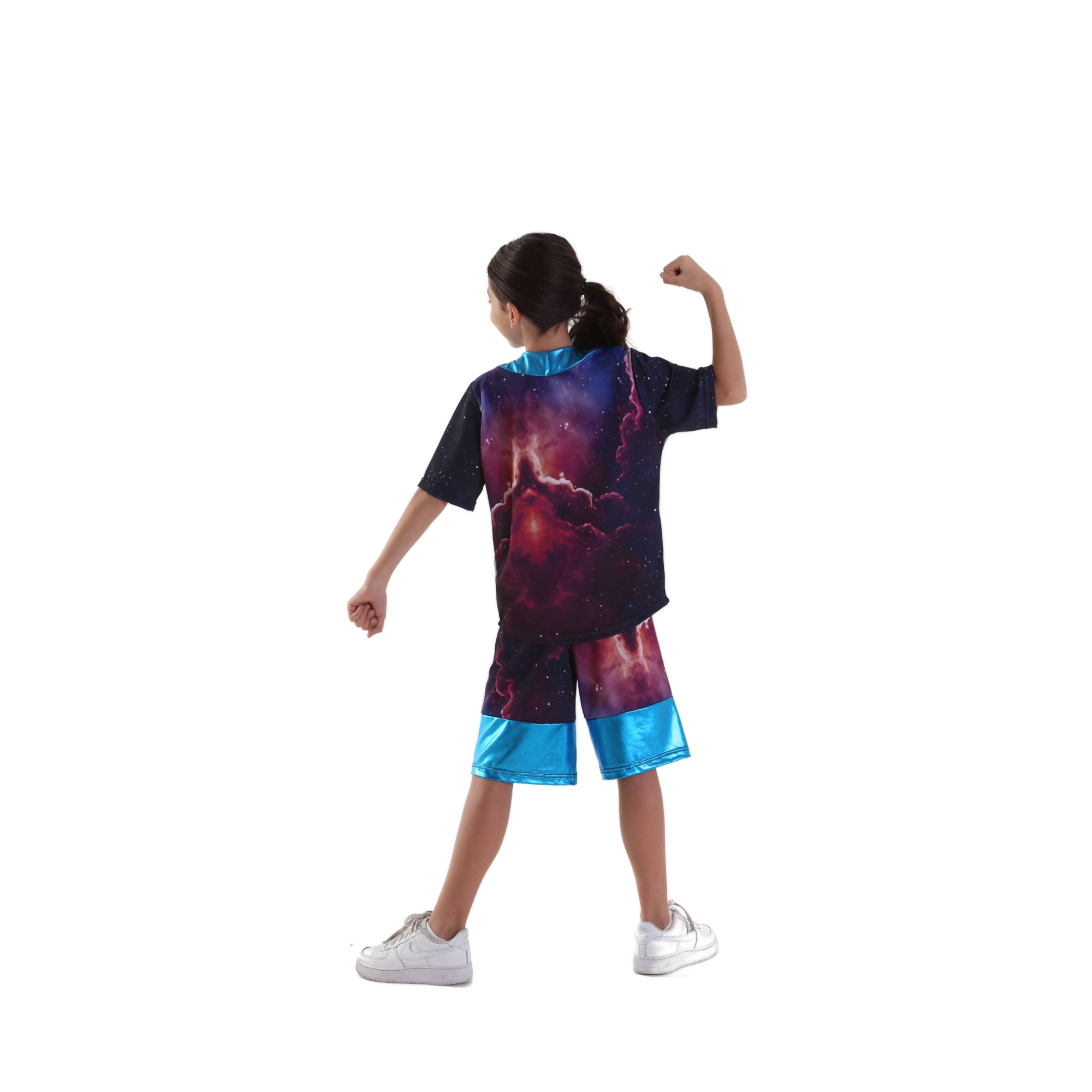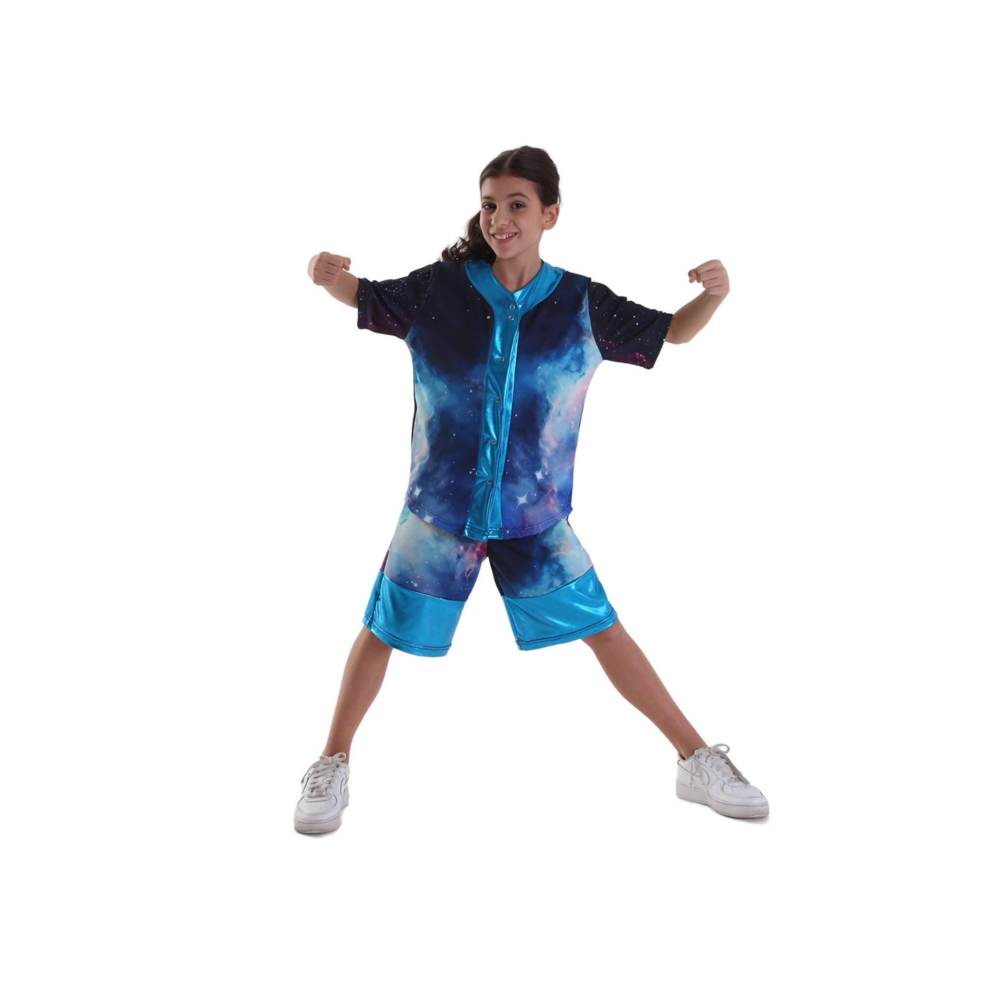 Completo composto da Camicia maniche corte, vestibilità ampia, in fantasia nebulosa con inserto in lycra spalmata turchese, poissoires. Pantaloncino ampio sotto ginocchio, in fantasia nebulosa con inserti in lycra spalmata turchese.