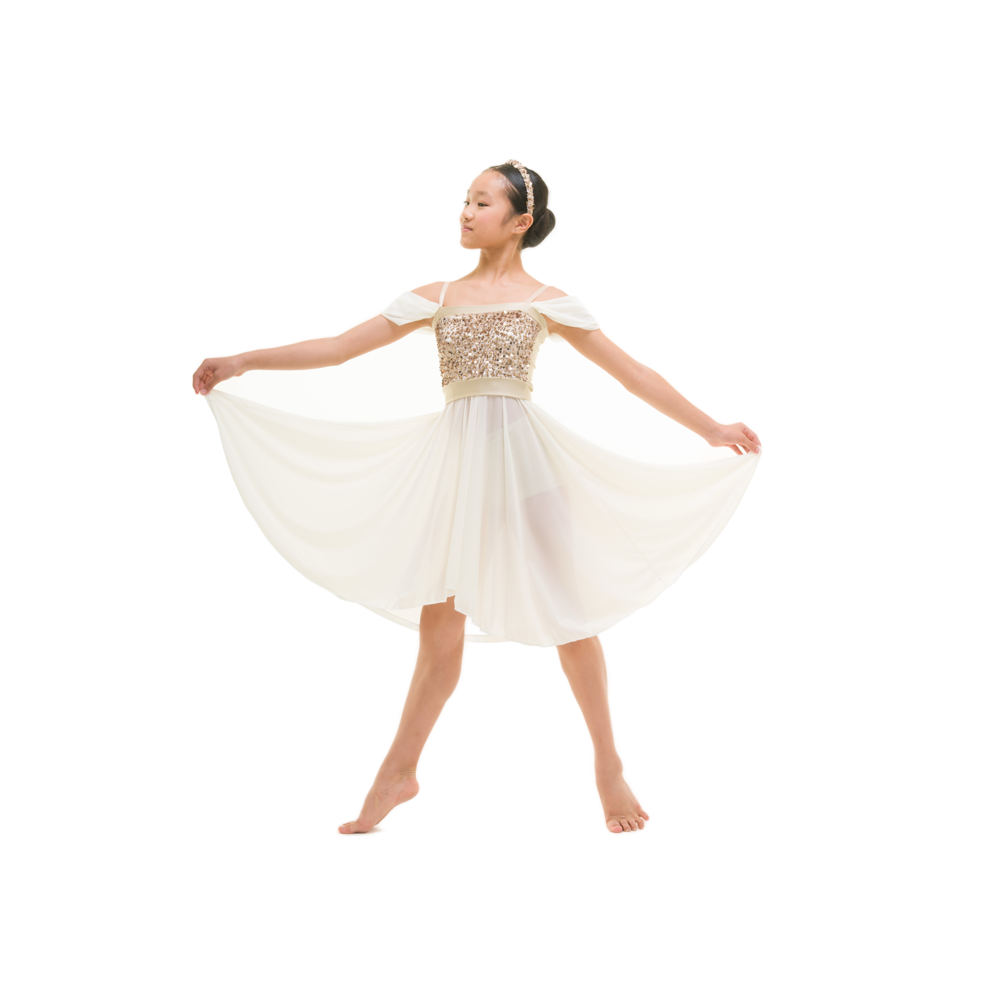 Completo composto da vestito con top a fascia in velluto paillettes e bordature in lycra, gonna a ruota più corta davanti in retina semitrasparente (Siviglia), manichette in retina semitrasparente (Siviglia), spalline carne. Coulotte in lycra.