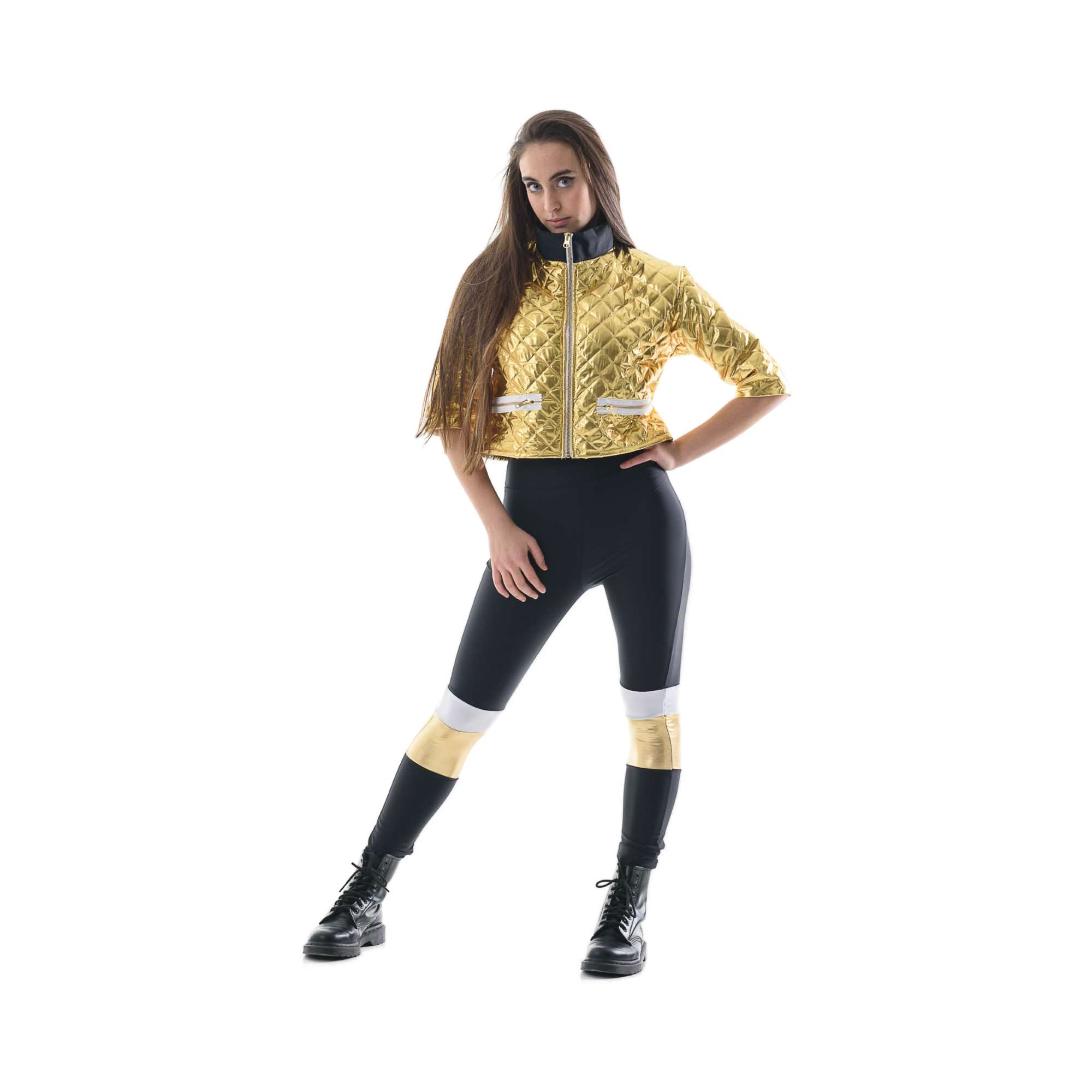 Giacchino corto in trapunta lamé, manica 3/4, foratura in raso e chiusura con zip.