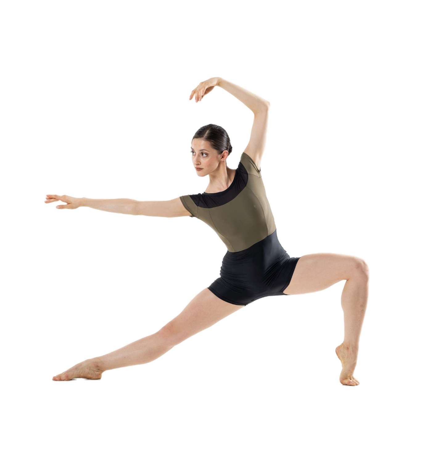 Accademico short in lycra bicolore, scollo in retina semitrasparente (Siviglia).
