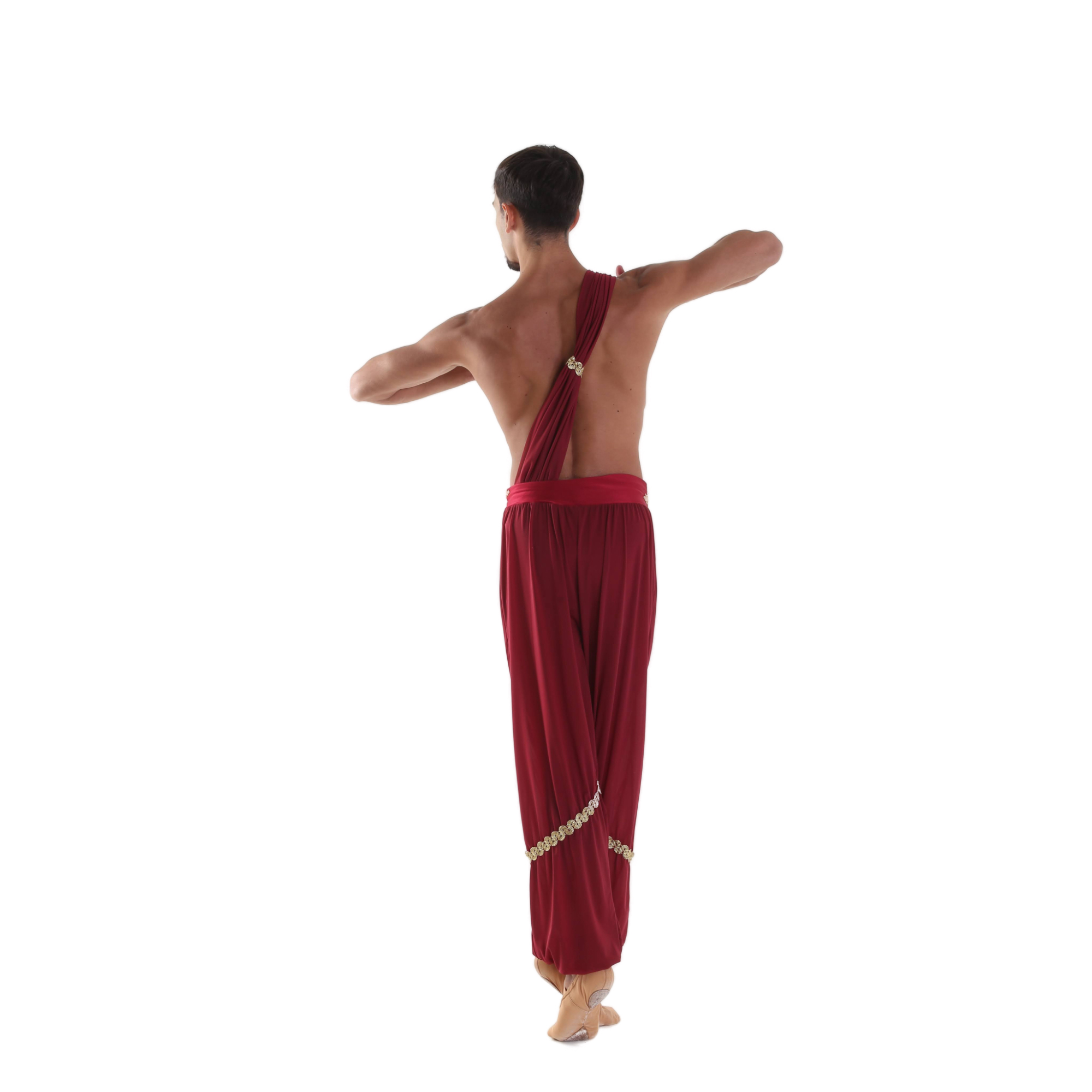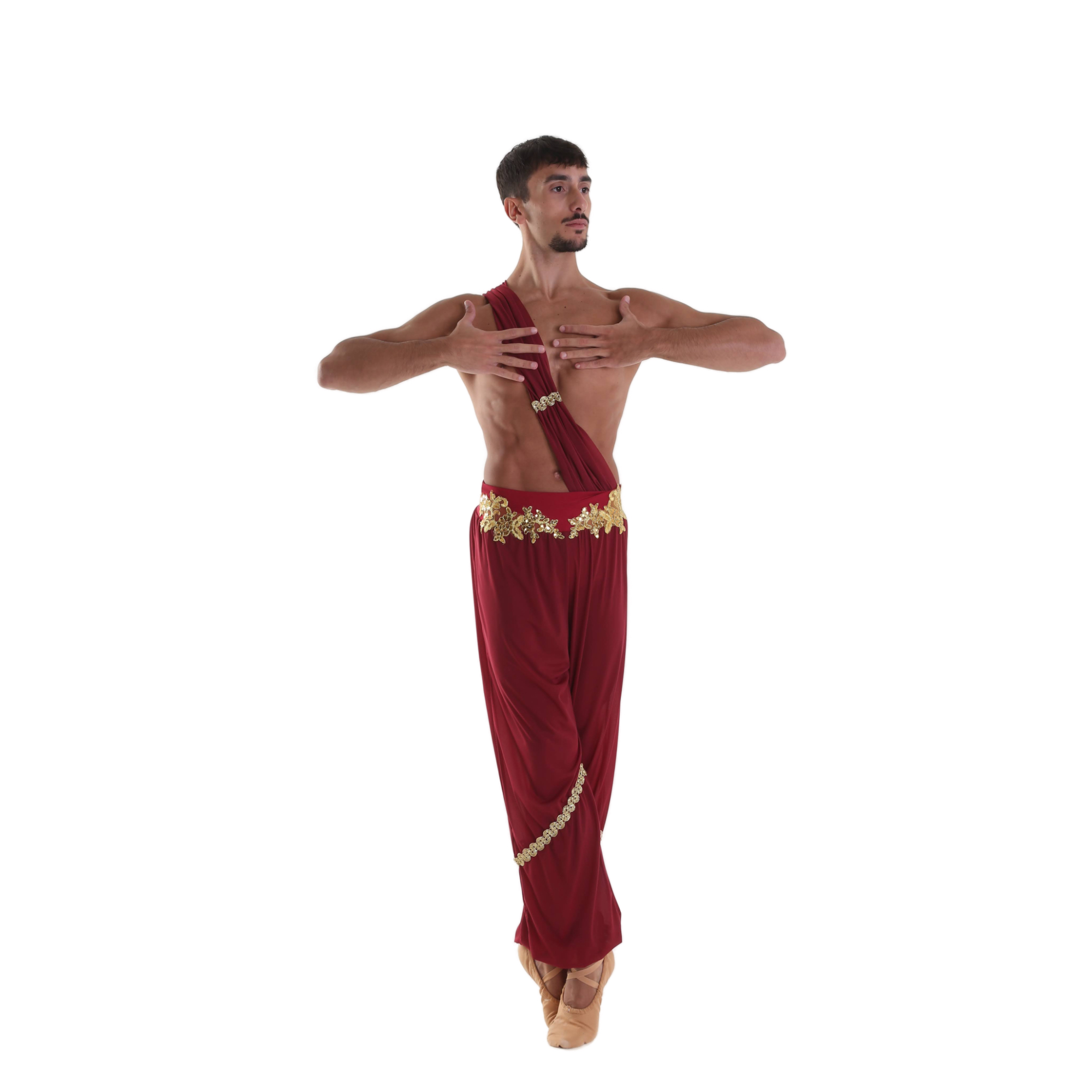 Pantalone in retina semitrasparente (Siviglia) montato su short con fascia alta in lycra, passamaneria oro altezza ginocchio, polsini in lycra spalmata oro, fascia in retina semitrasparente (Siviglia) cucita con passamaneria oro, decorazione oro con paillettes su fascia.