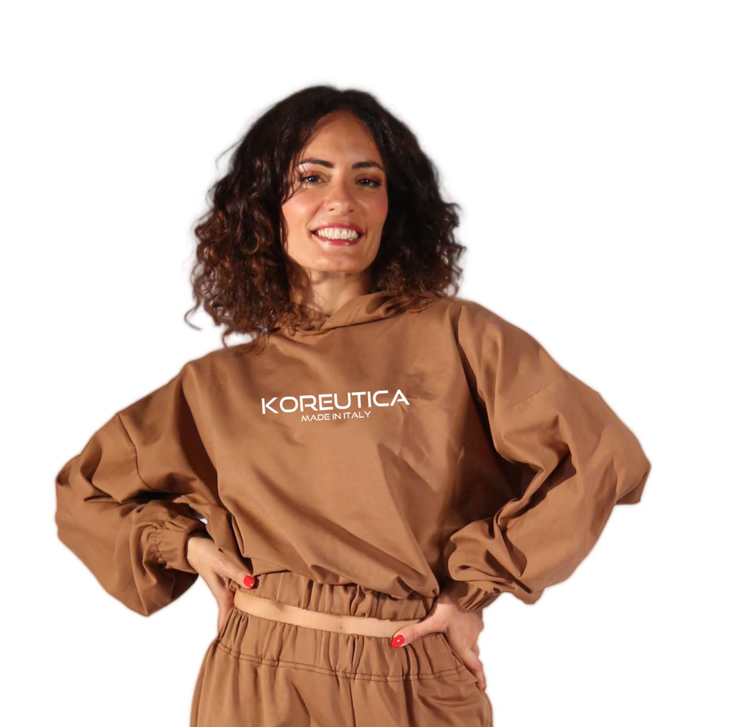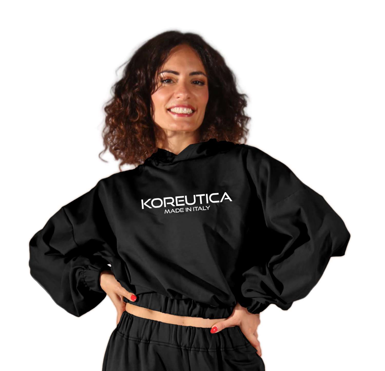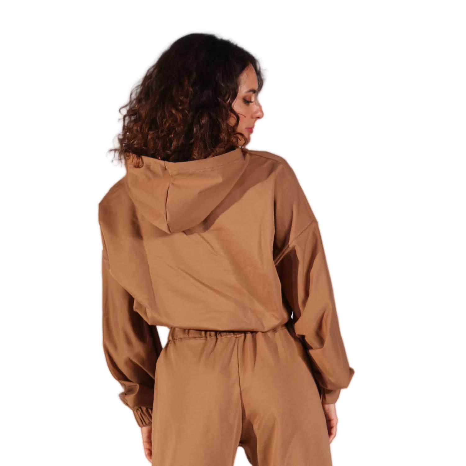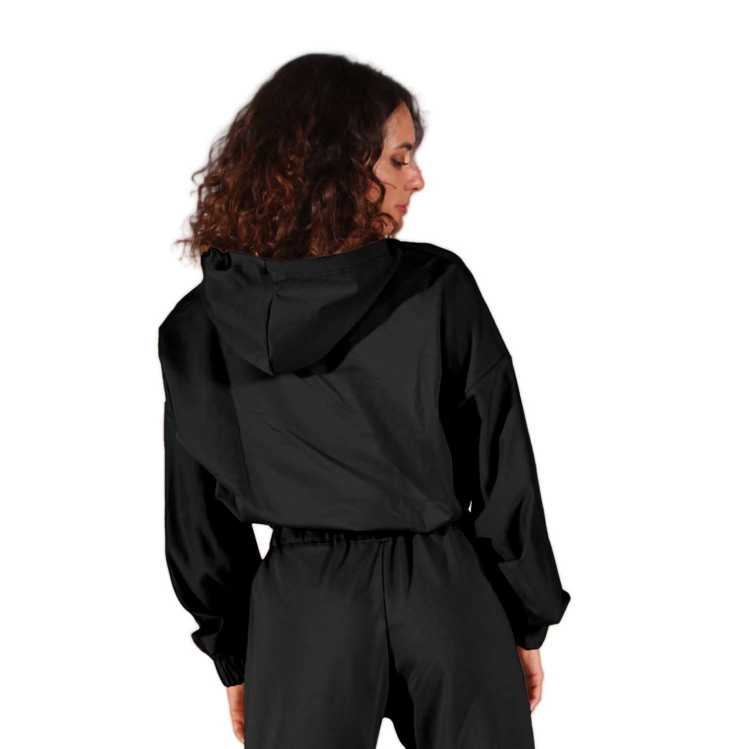 Felpa in felpina di cotone bi-eleastica con cappuccio, maniche lunghe con spalla scesa e rifiniture con elastico alto 4 cm.