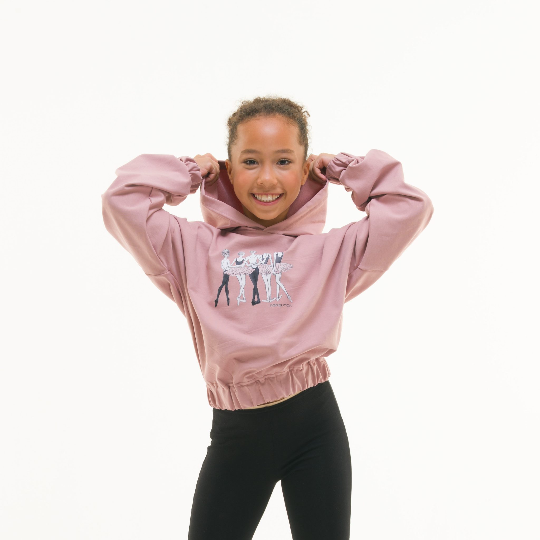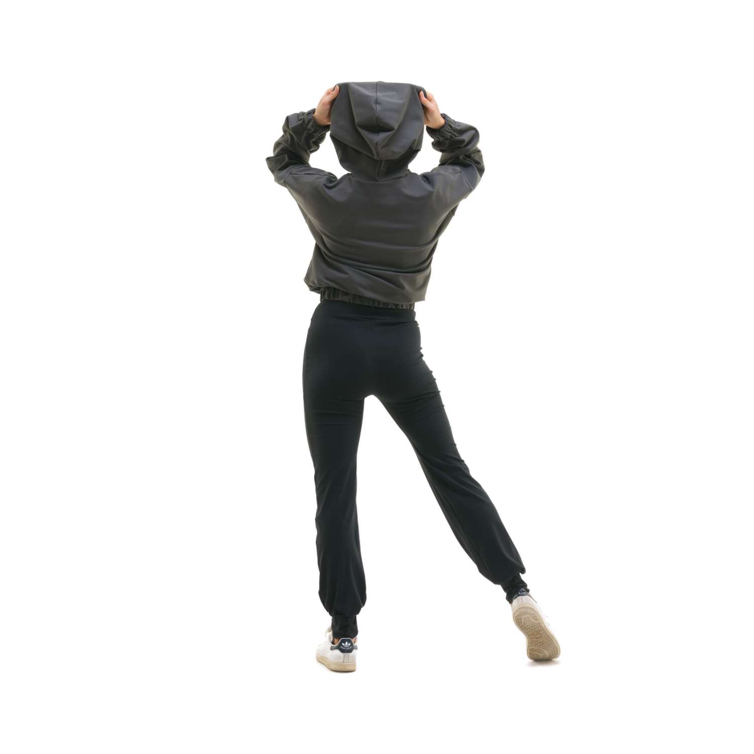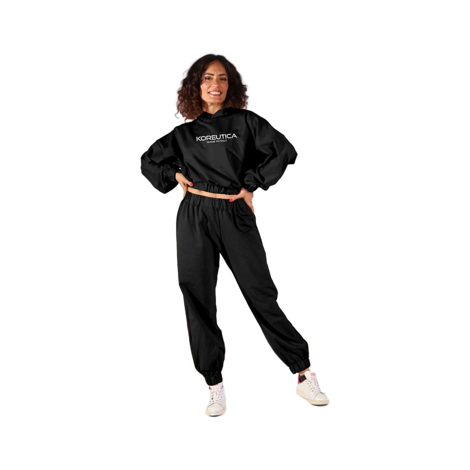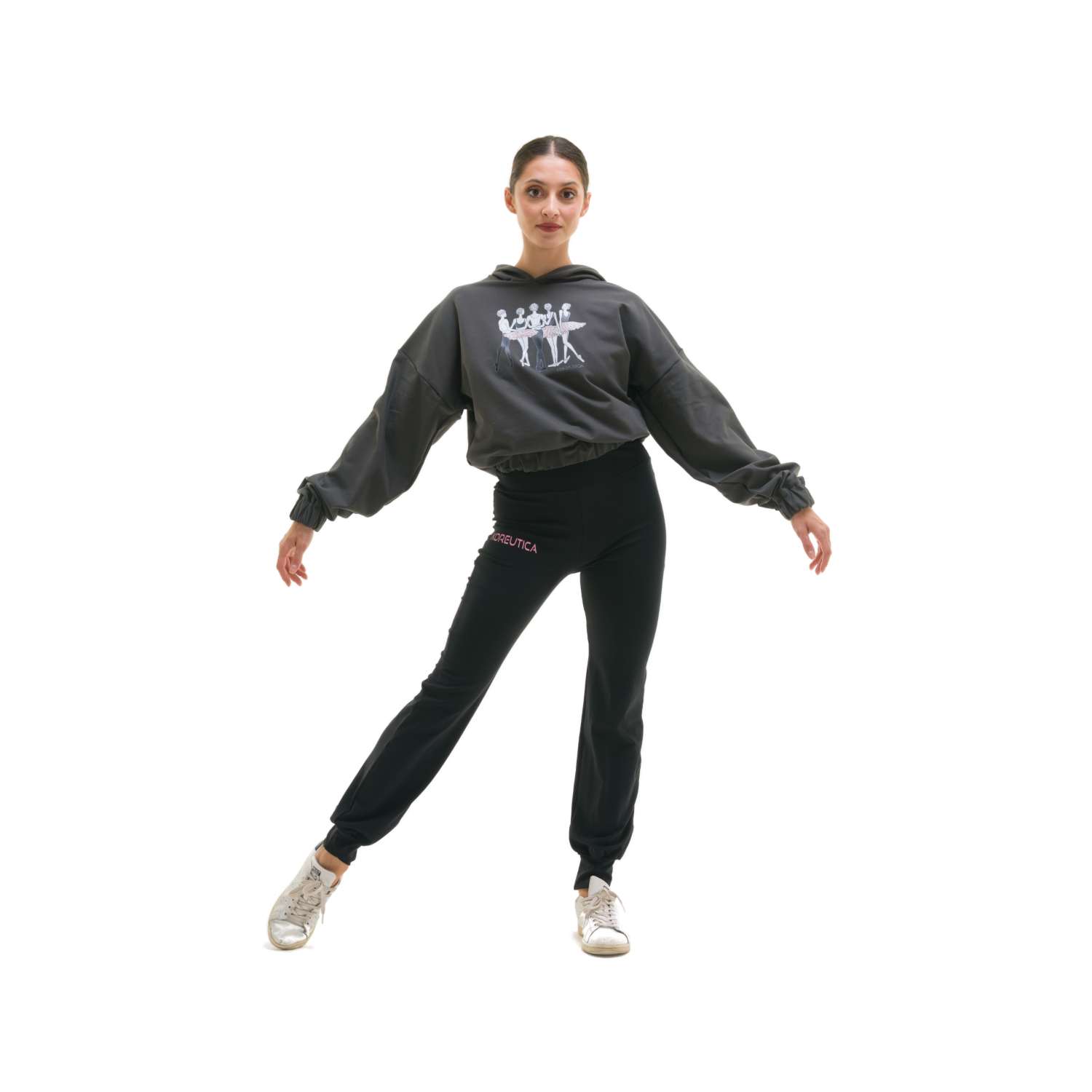 Felpa in felpina di cotone bi-eleastica con cappuccio, maniche lunghe con spalla scesa e rifiniture con elastico alto 4 cm.