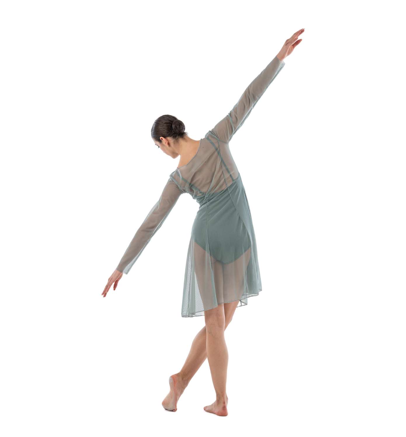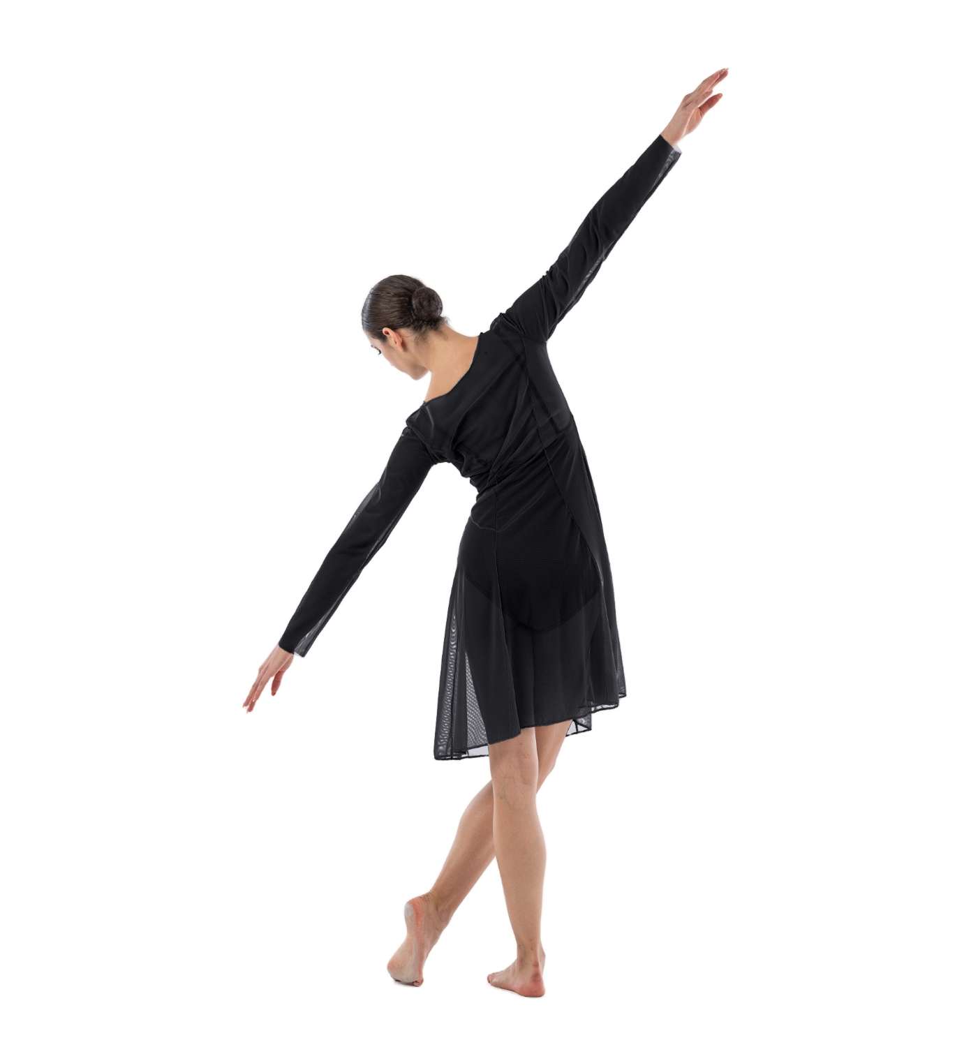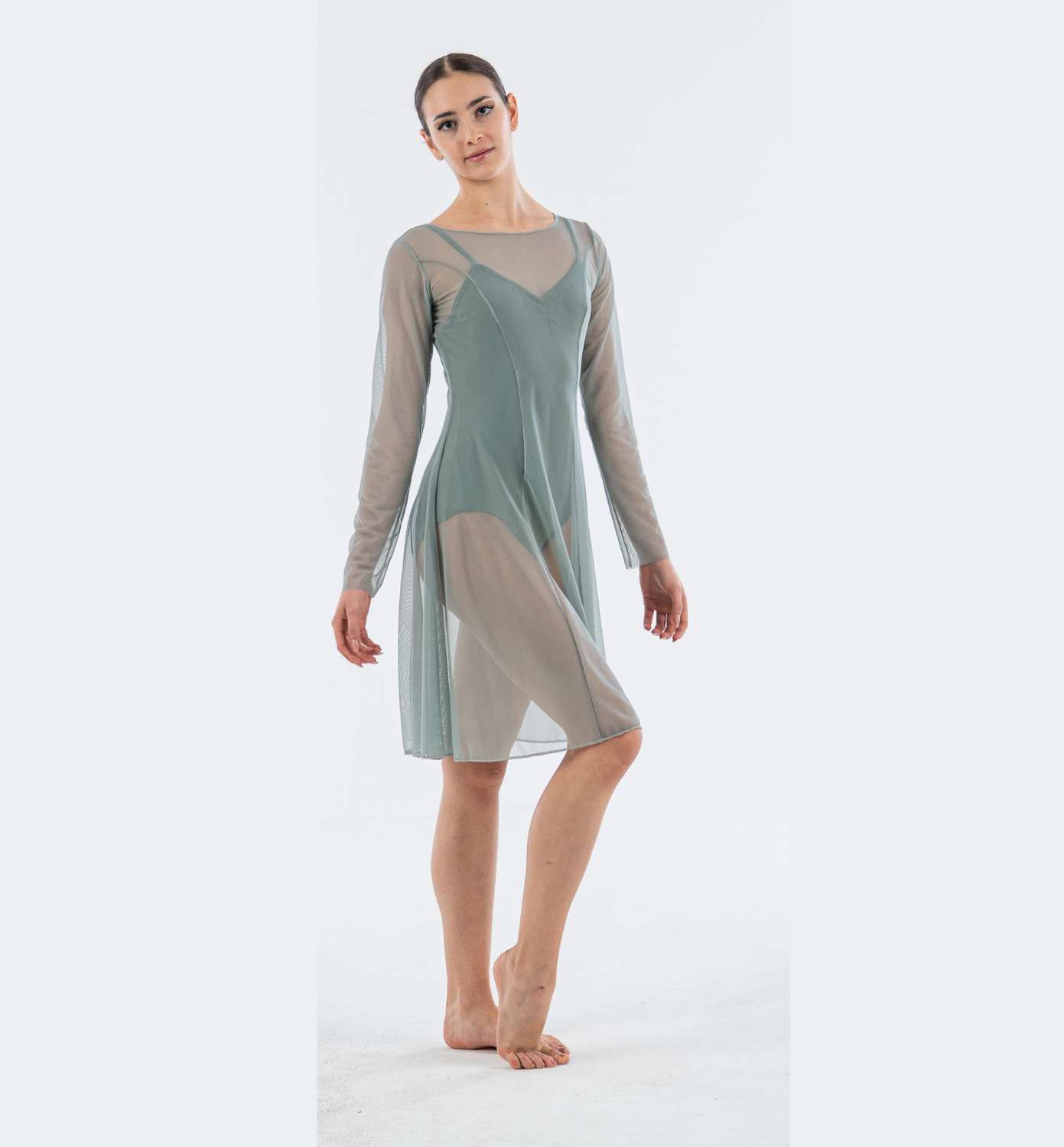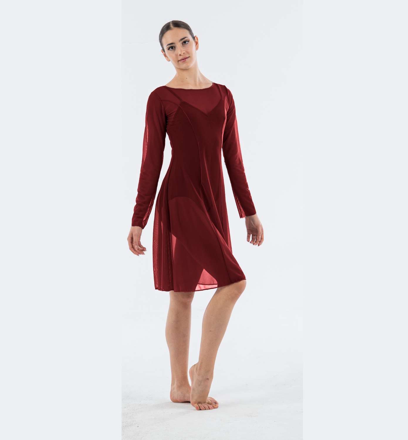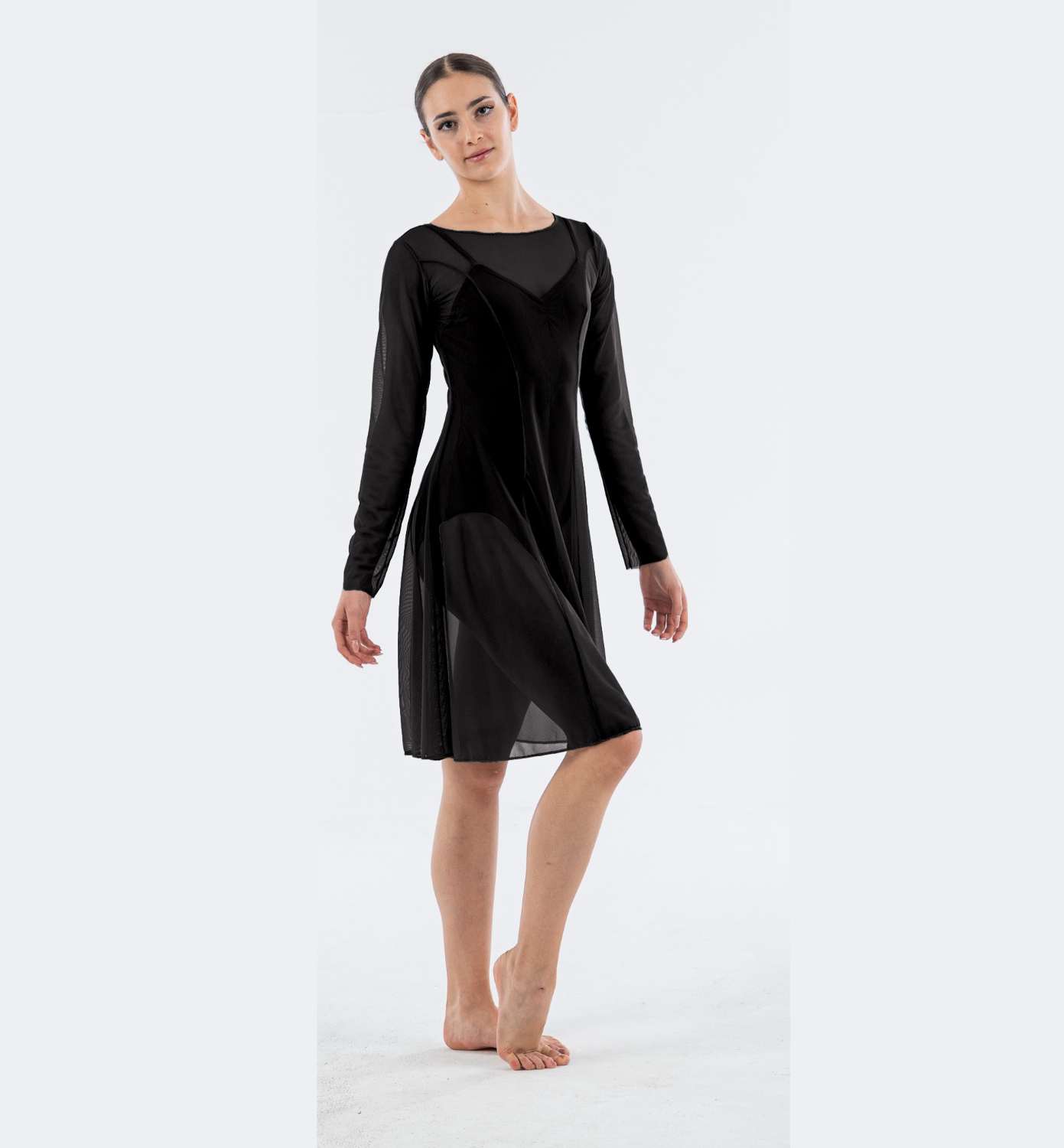 Vestito in retina bi-elastica leggera e trasparente, maniche lunghe , scollo a barchetta, lunghezza sopra ginocchio.
