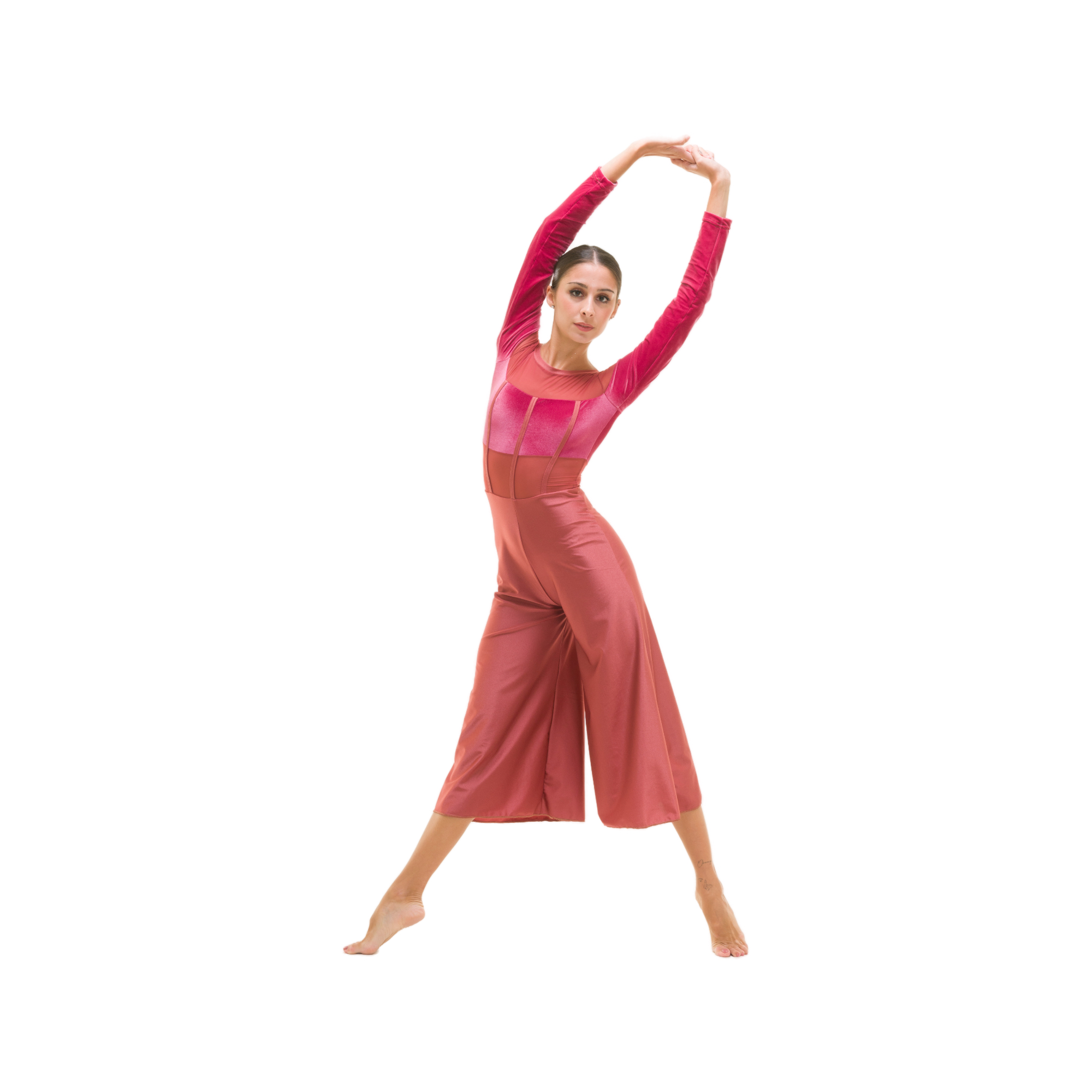 Tuta intera con parte seno e maniche in velluto, inserti in retina, scollo barchetta e più profondo dietro con bordino, strisce di lycra applicate in verticale su busto davanti, pantalone in lycra svasato lunghezza polpaccio.