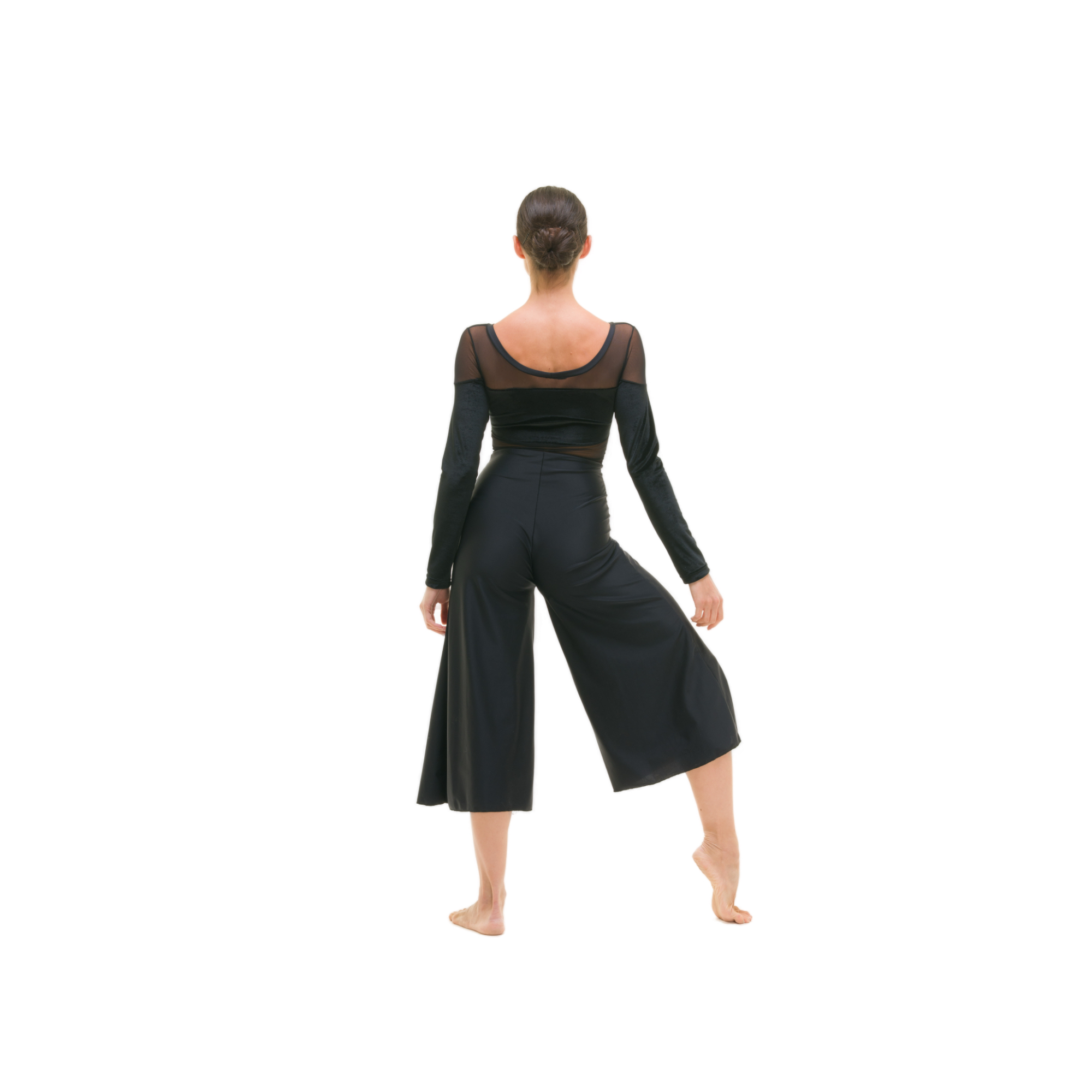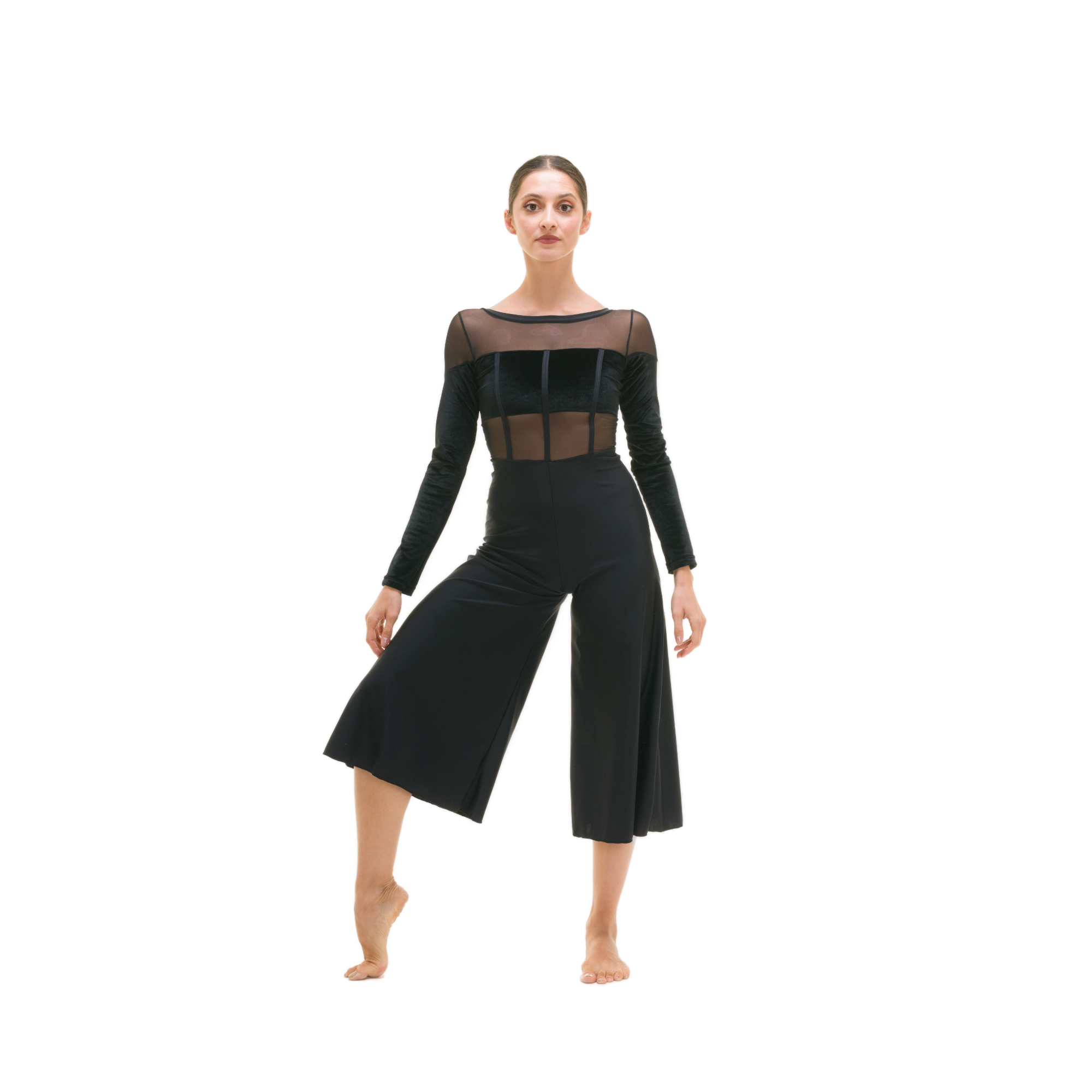 Tuta intera con parte seno e maniche in velluto, inserti in retina, scollo barchetta e più profondo dietro con bordino, strisce di lycra applicate in verticale su busto davanti, pantalone in lycra svasato lunghezza polpaccio.