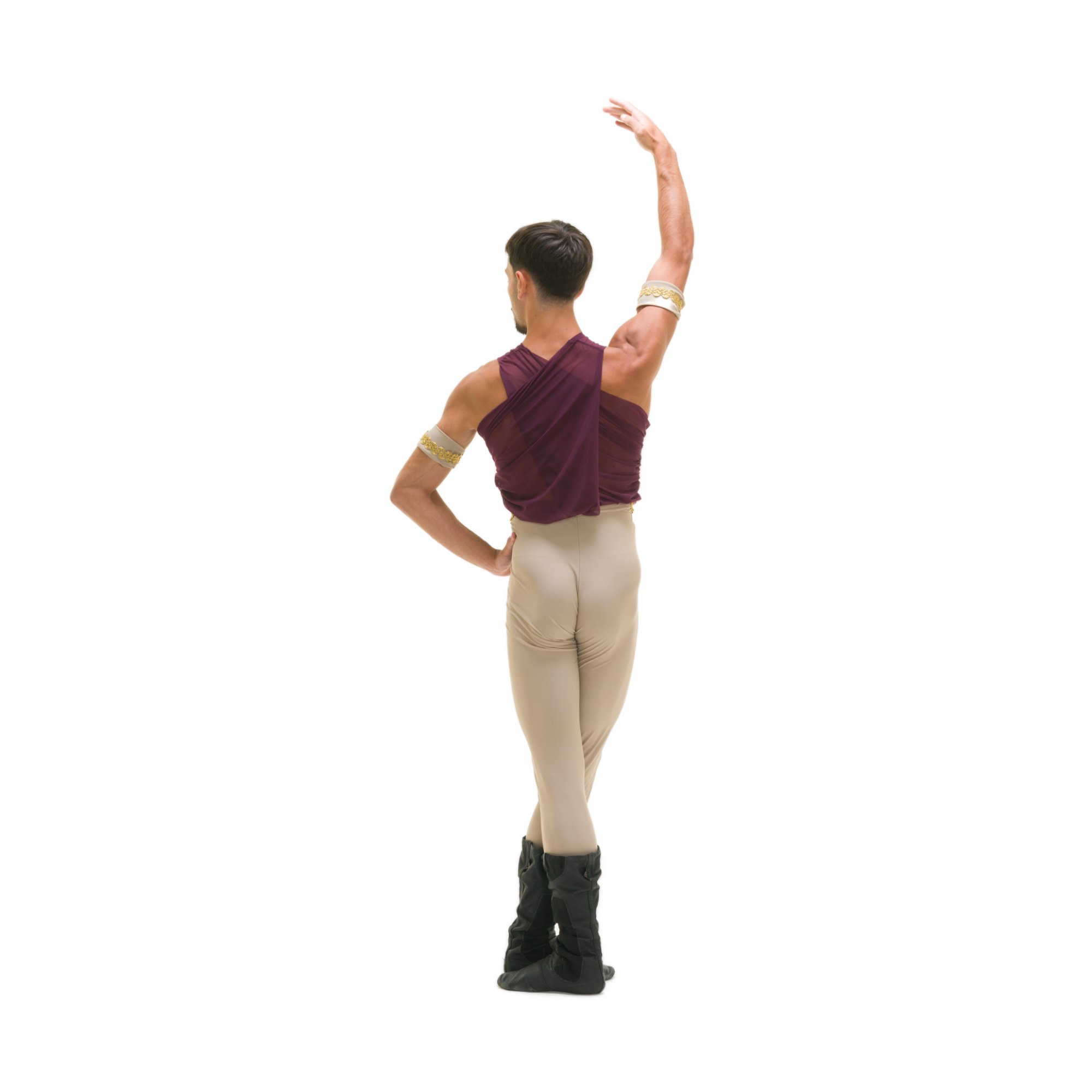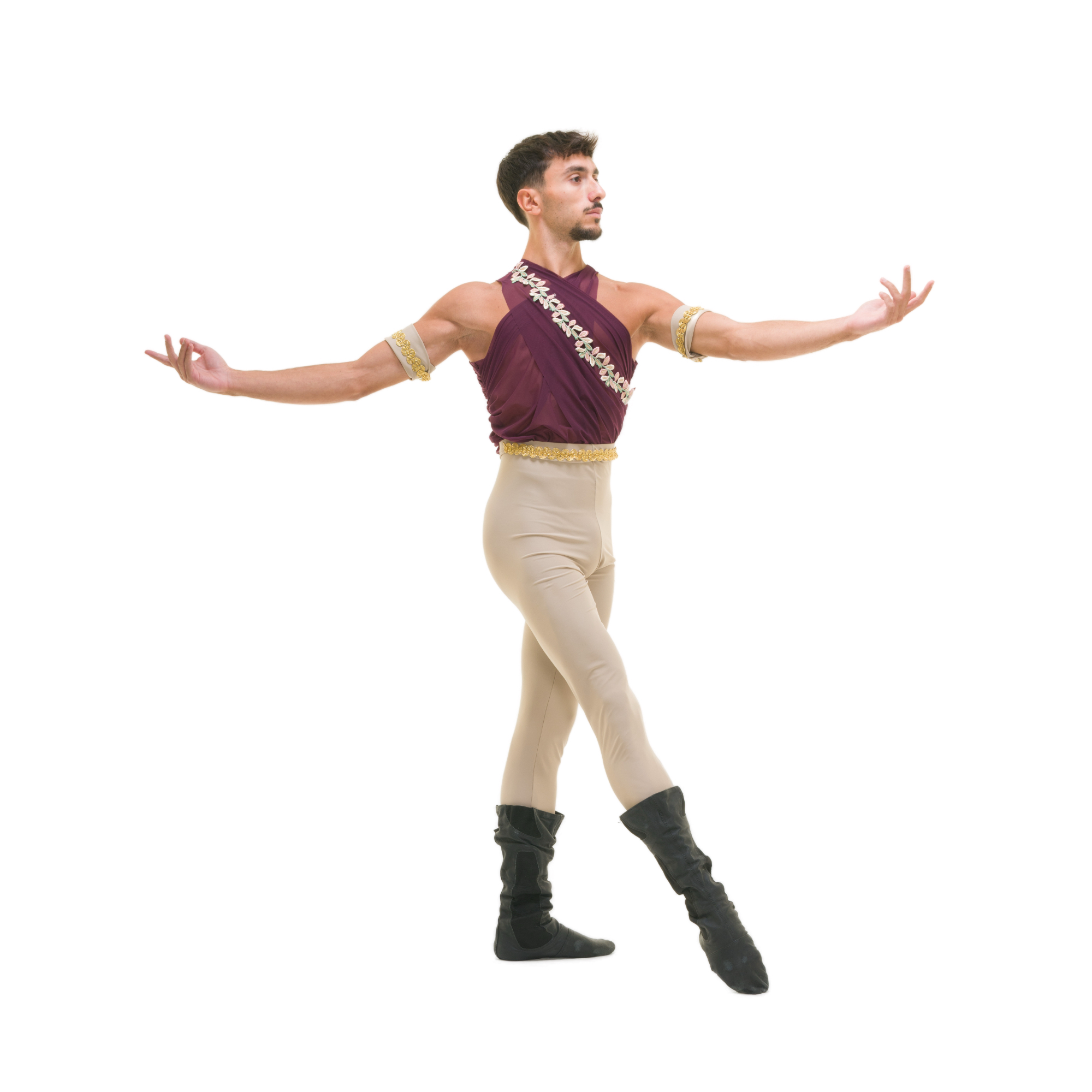 Tuta intera con parte gambe in lycra e doppio mono-spalla drappeggiato e incrociato in retina, passamaneria oro in vita, decoro foglie ricamate sul petto.