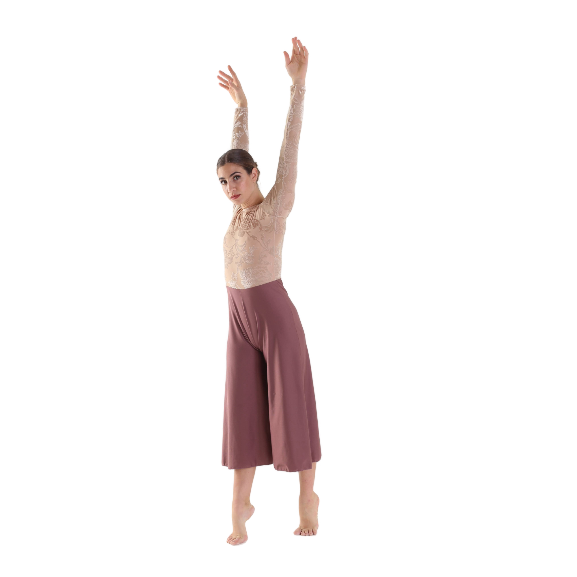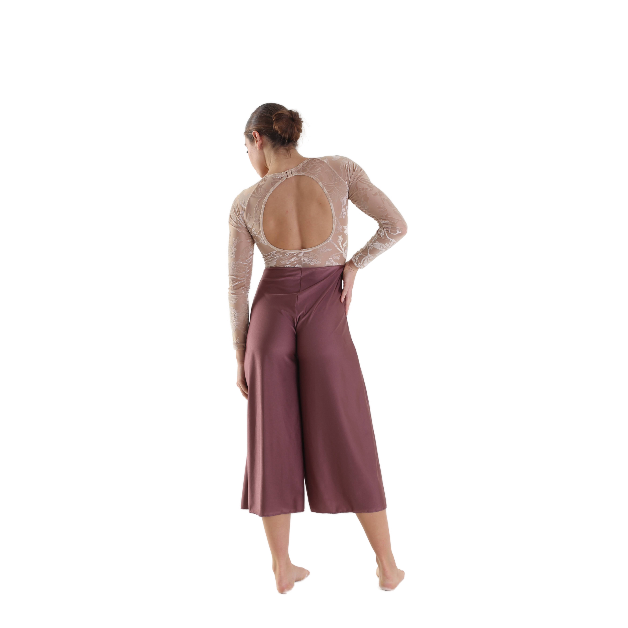 Tuta intera , maniche e busto in fantasia giverny nude con seno foderato, schiena con oblò, gancetto, pantalone svasato in lycra.