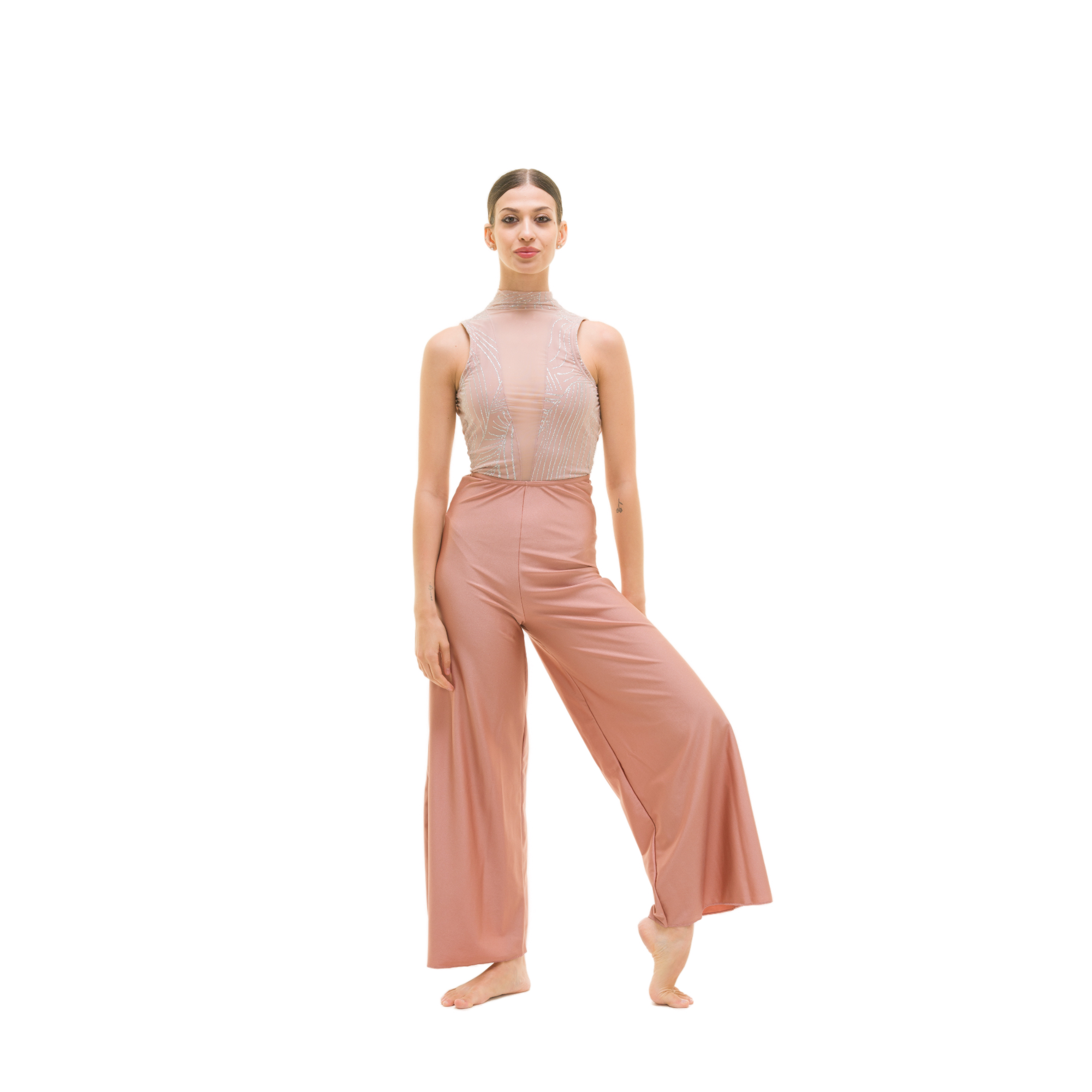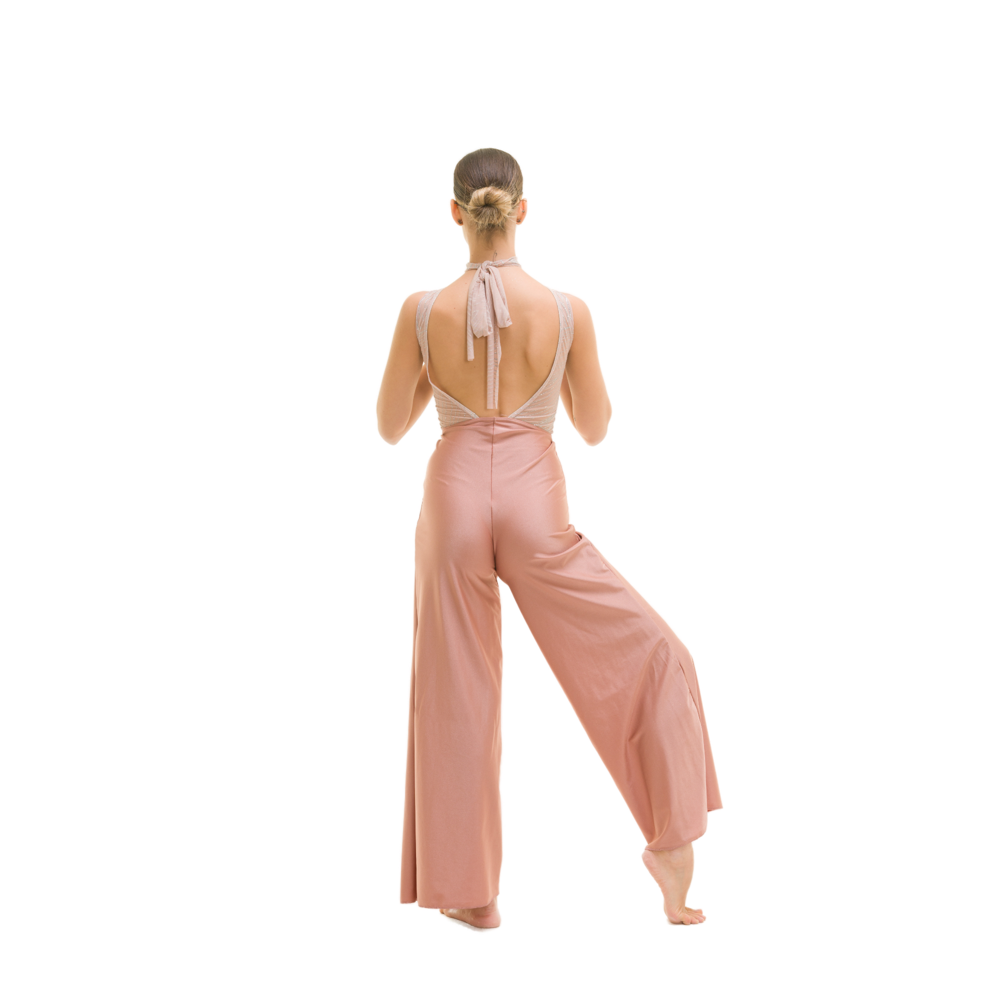 Tuta intera smanicata, corpetto in retina glamour luccicante doppiata in lycra sul seno, V centrale in retina, scollo schiena a V profondo, colletto lungo da legare dietro, pantalone alla caviglia in lycra. Elastico in vita ribattuto.