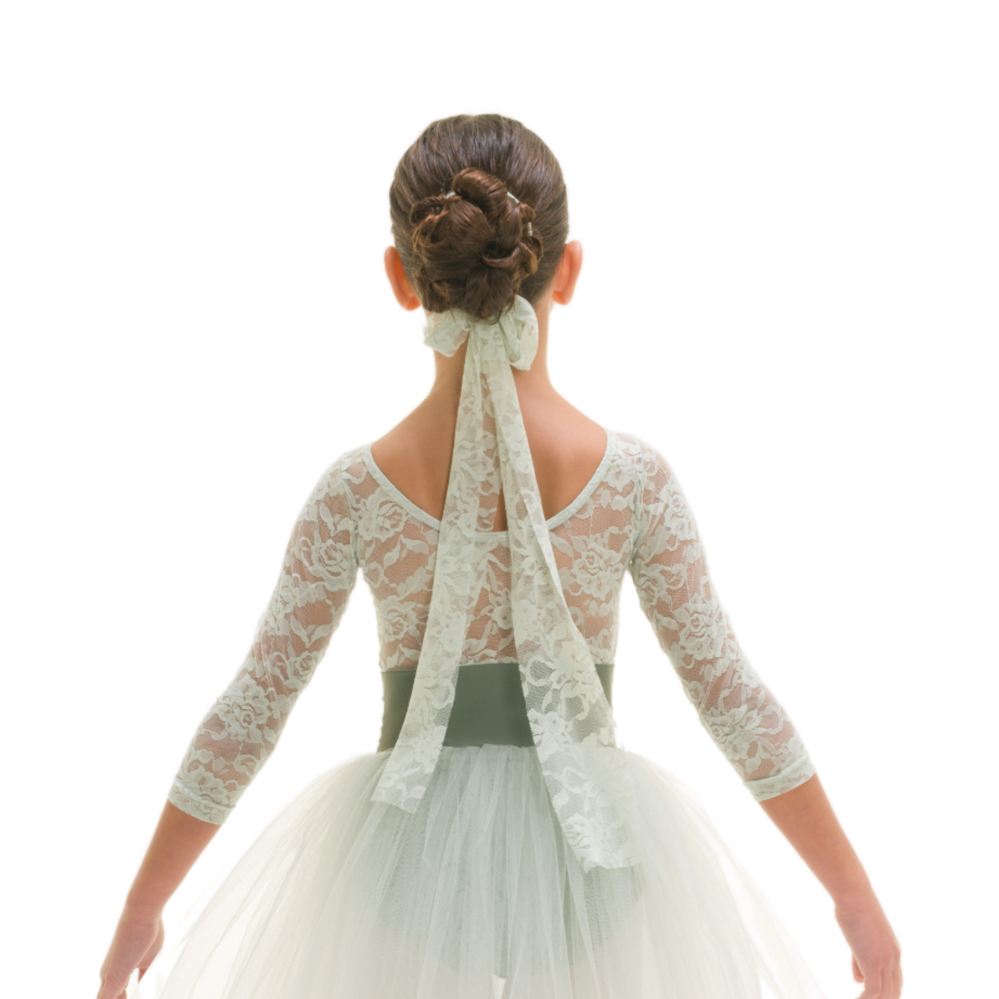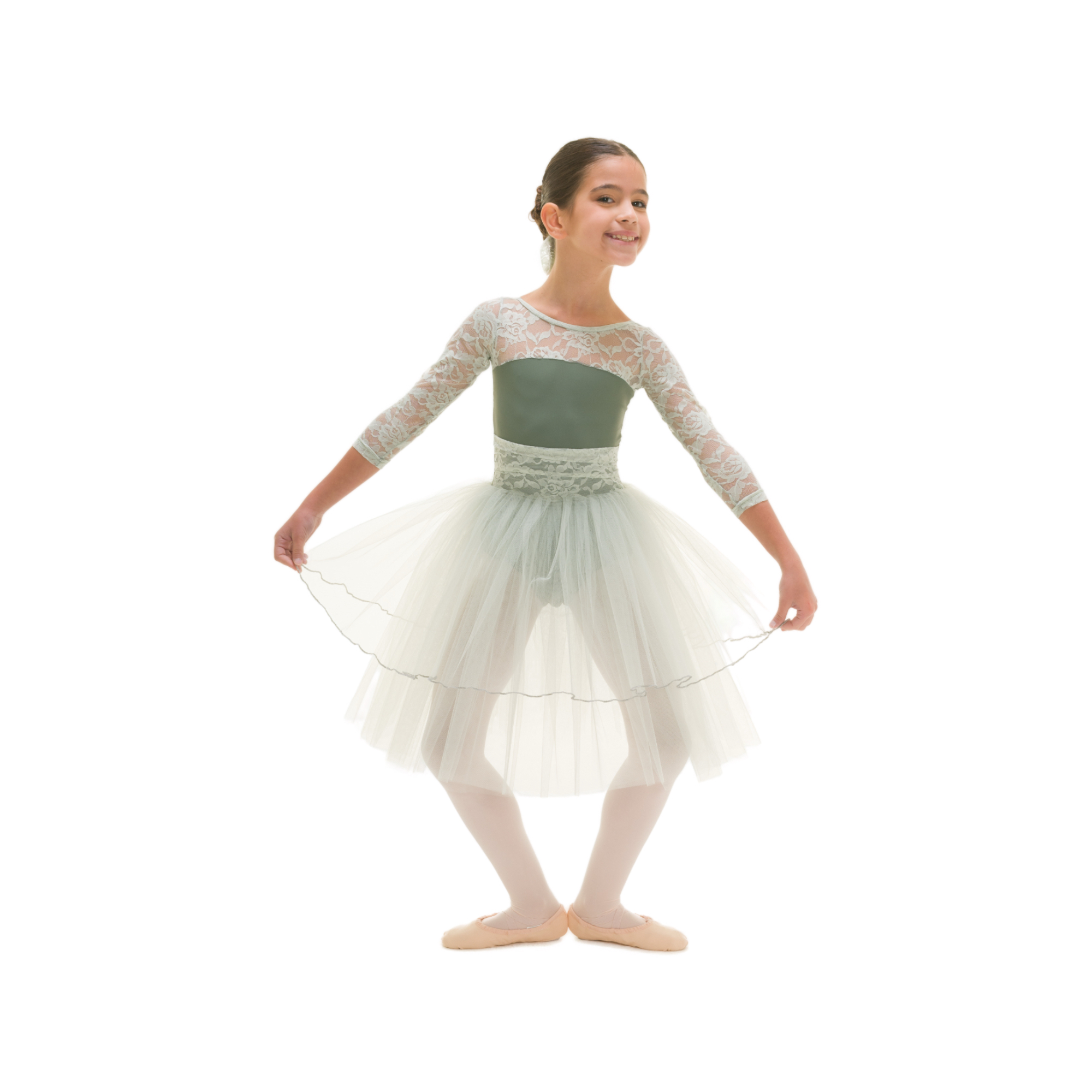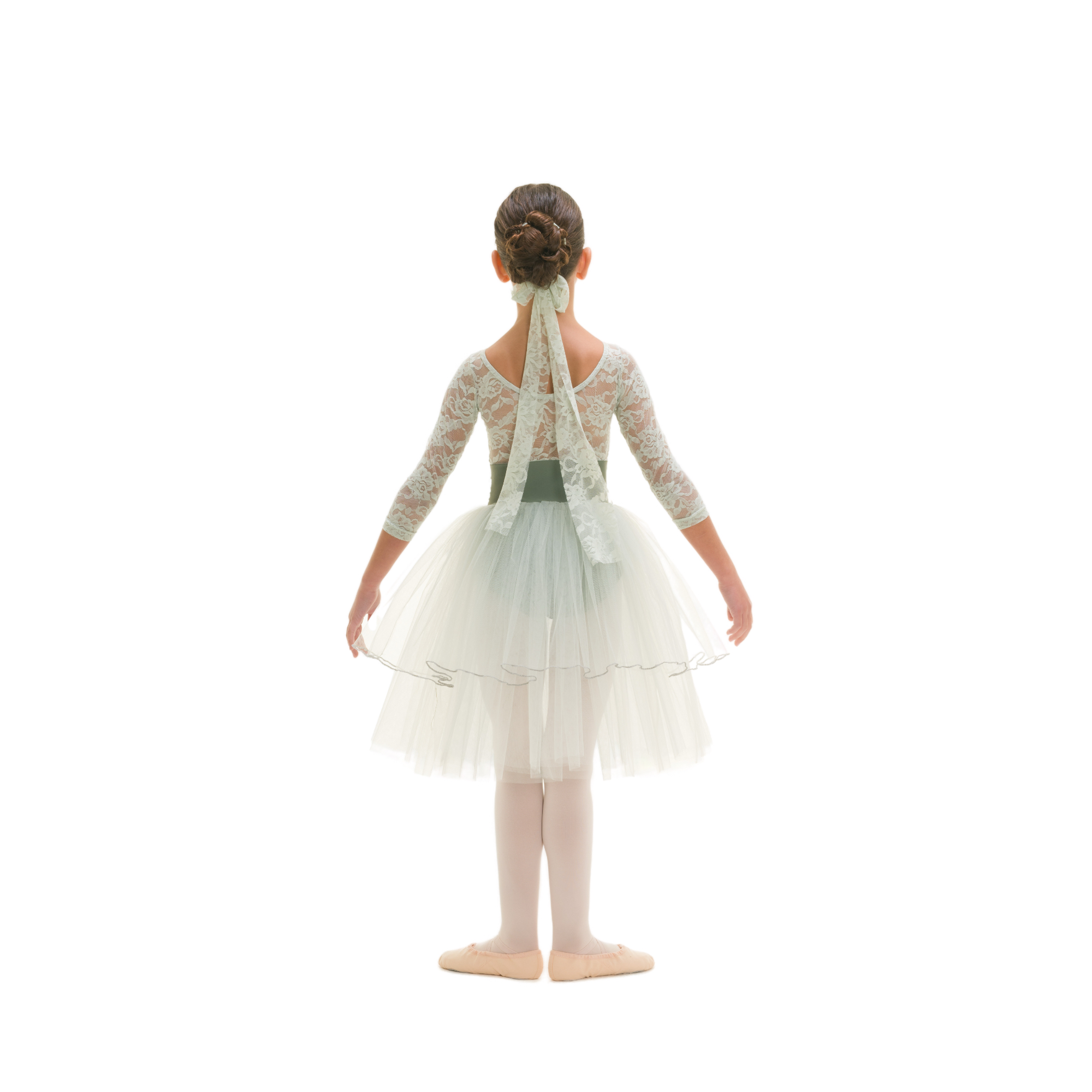 Tutù con body in lycra e pizzo, maniche 3/4, fascia in vita in pizzo, 4 veli tulle morbido di cui primo con bordatura rollè.