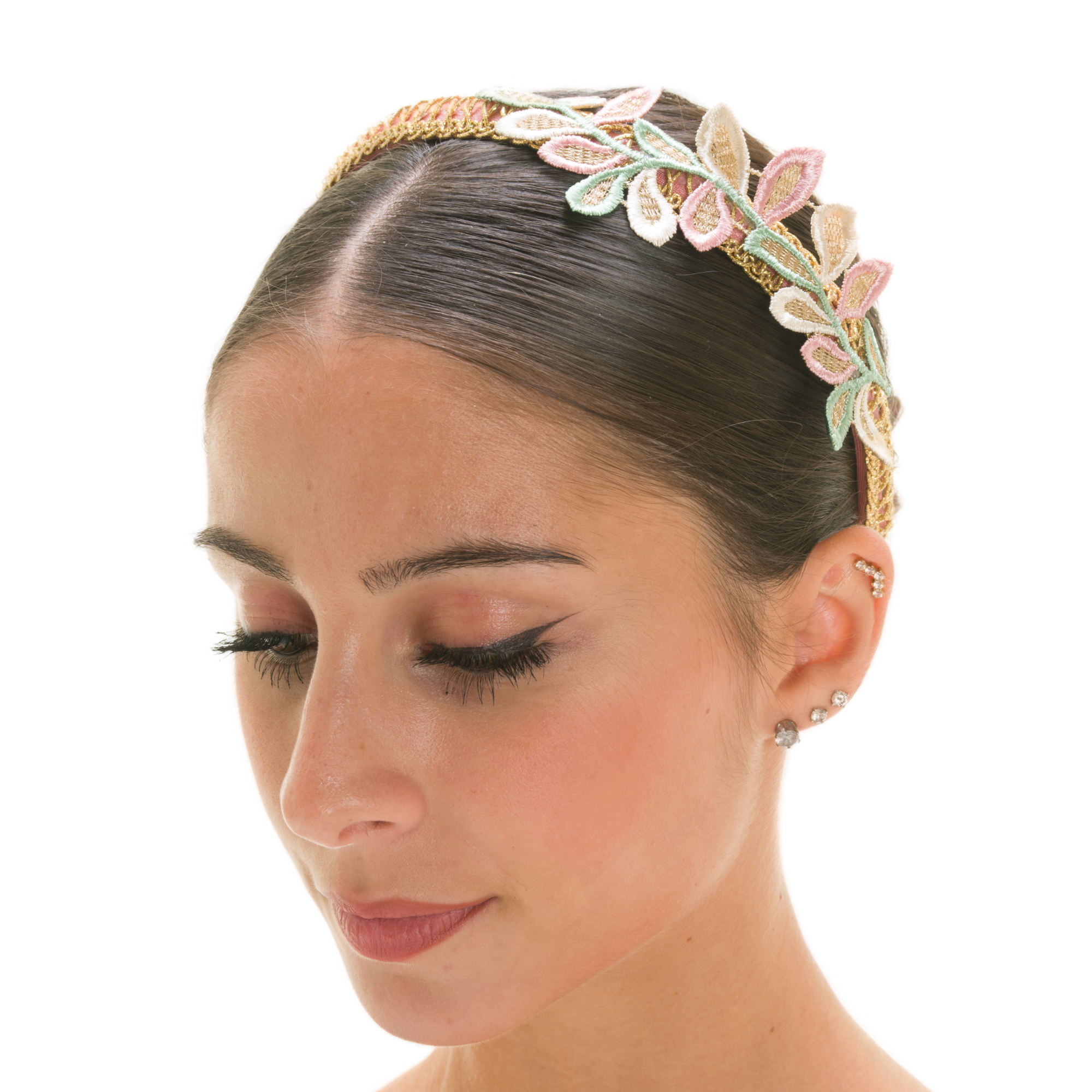 ACCESSORIO: Cerchietto rivestito in lycra con passamaneria oro e decoro foglie ricamate su un lato. Realizzato a mano.