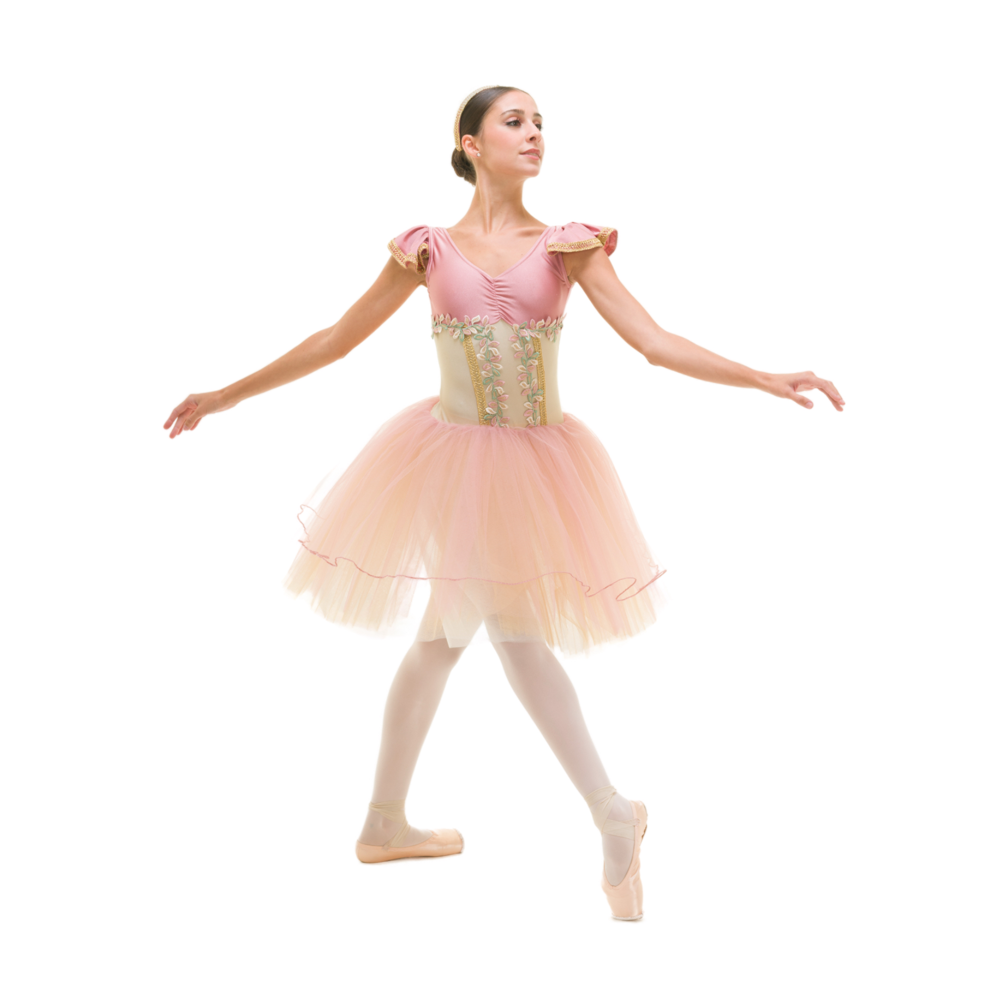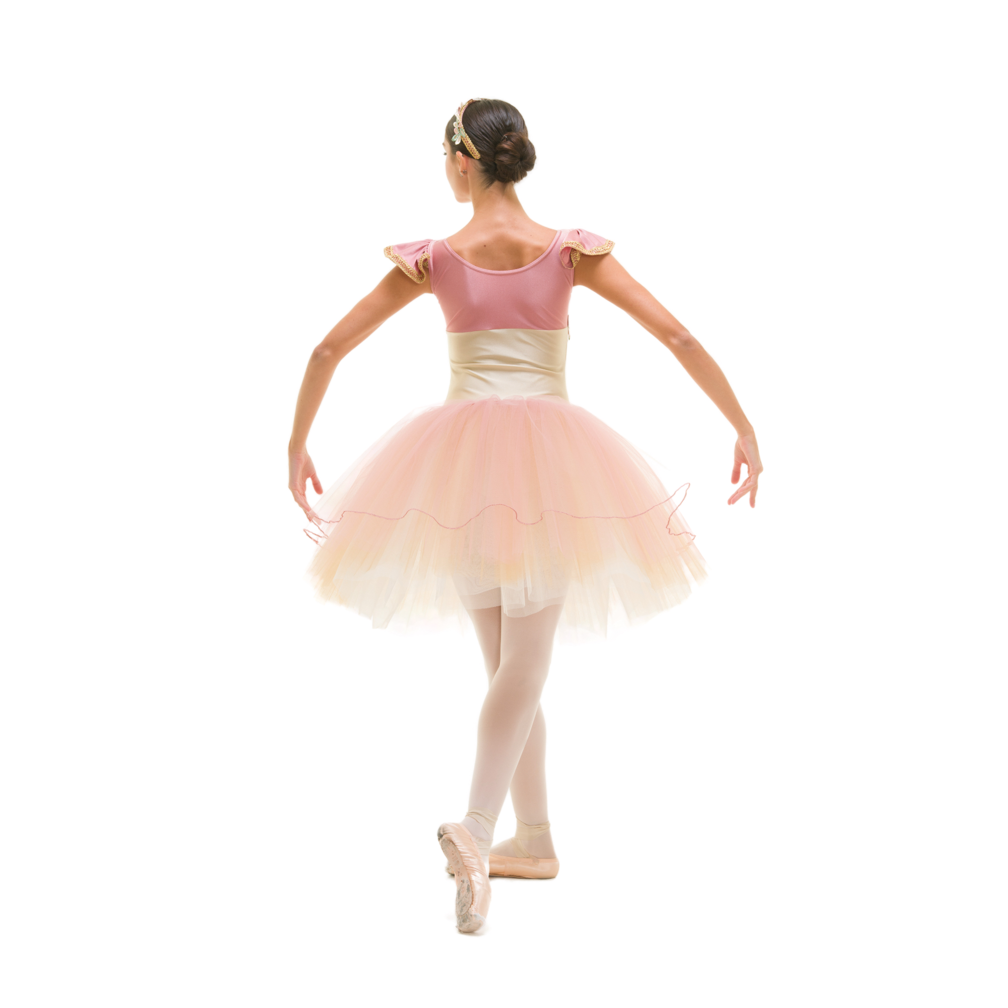 Tutù con body bicolore in lycra, arriccio sul petto, manichette a rouge con passamaneria oro, passamaneria oro e decoro foglie ricamate sul busto, 1 velo a ruota di tulle morbido con profilo rollè + 3 veli doppi tulle morbido + 2 veli tulle rigido.