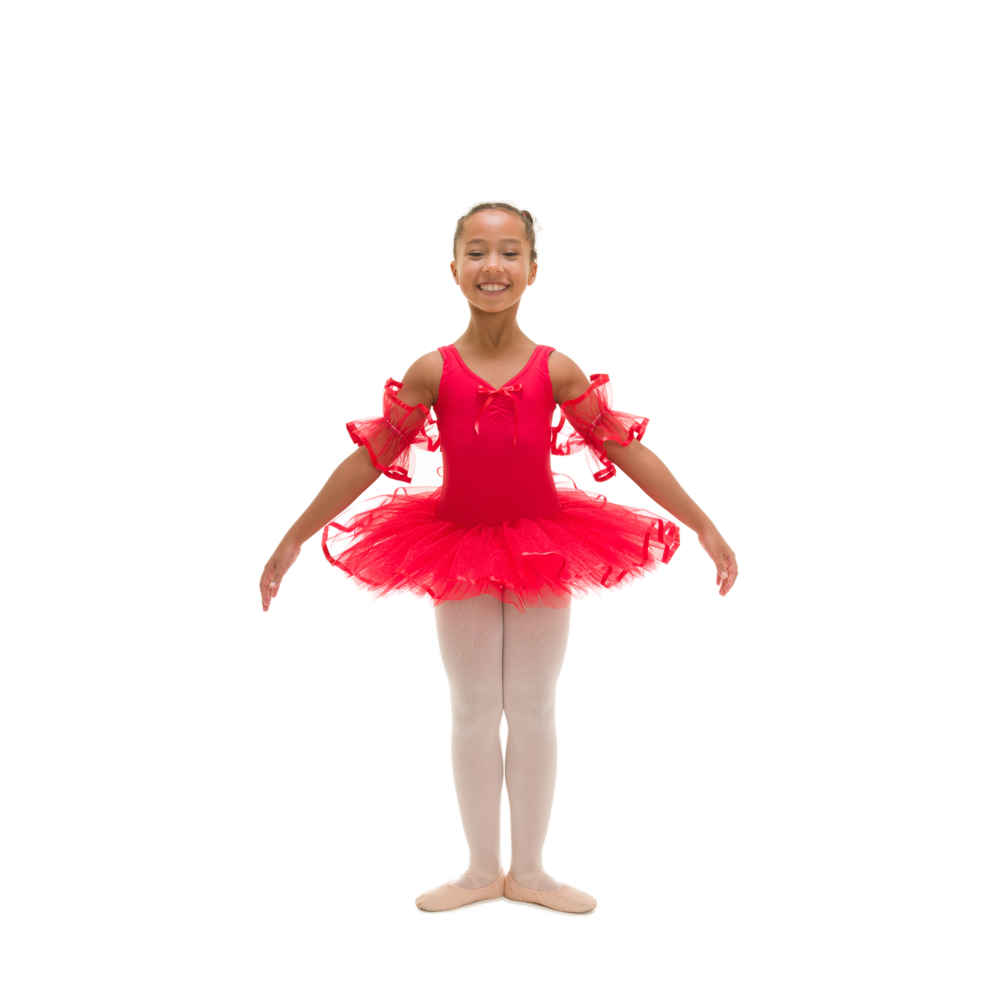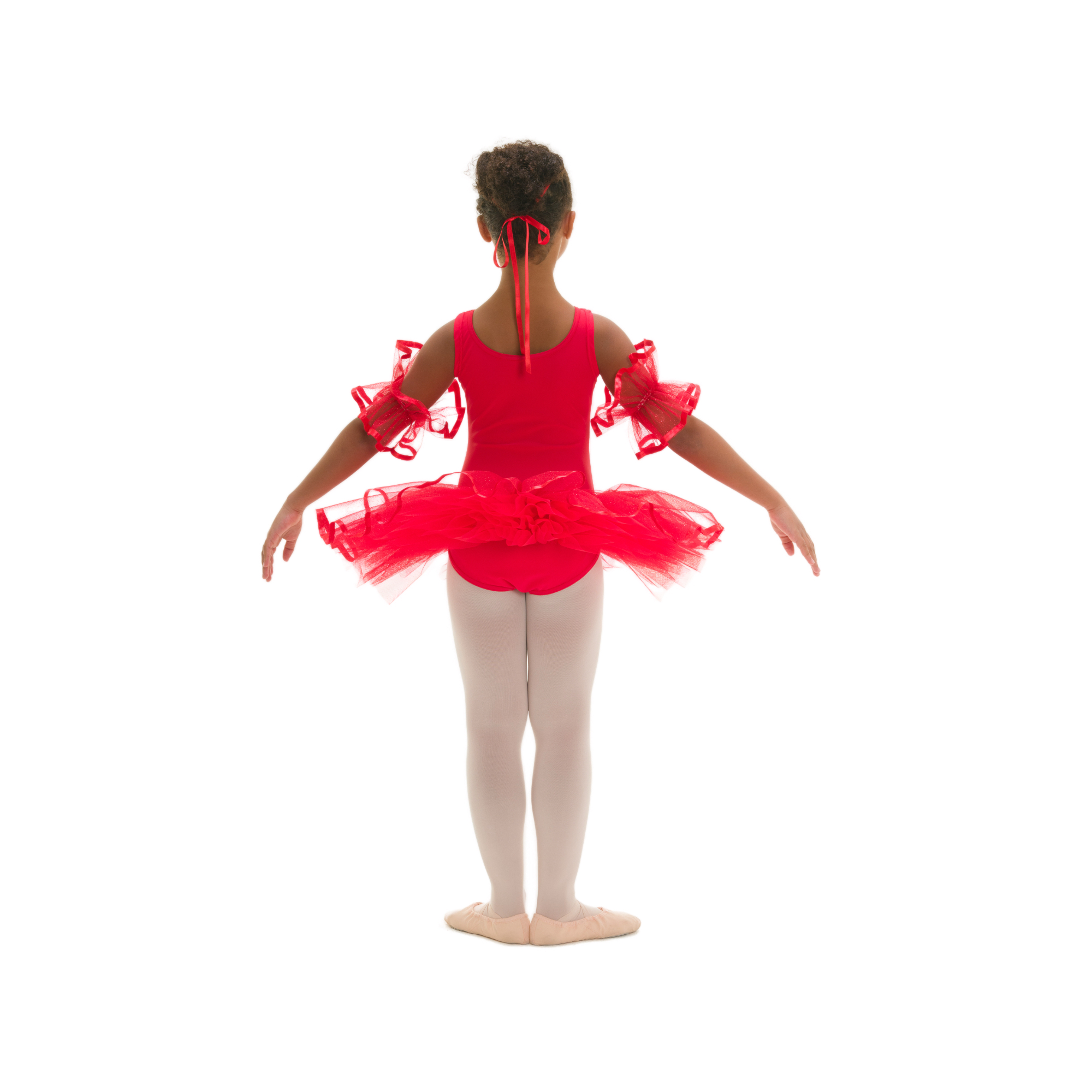 Tutù con body a canotta in lycra, arricciatura dv e nastrino raso, 1° velo di tulle strass rosso brillante con nastrino raso + 4 veli di tulle rigido scalato. Manichette a clessidra in tulle strass rosso con nastrino raso