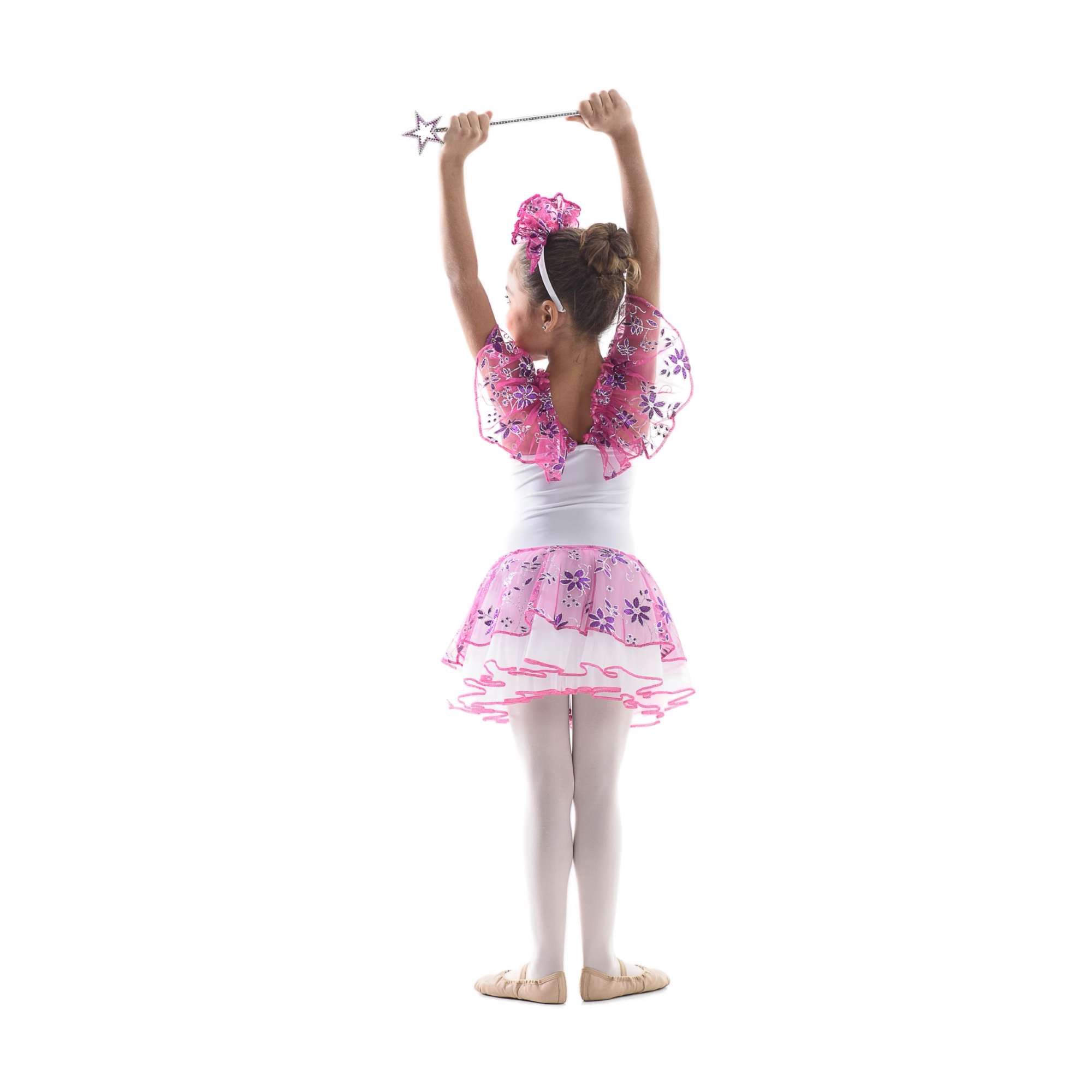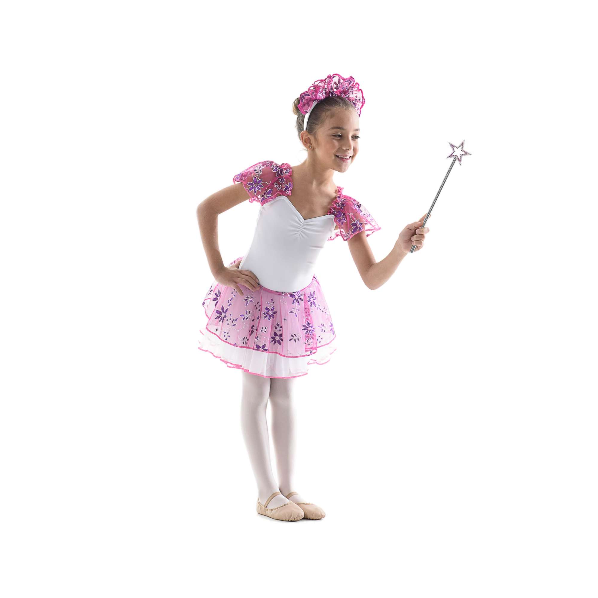 Tutù in lycra, 2 veli retina e 1 velo tulle con manichette a sbuffo e ali sulla schiena.