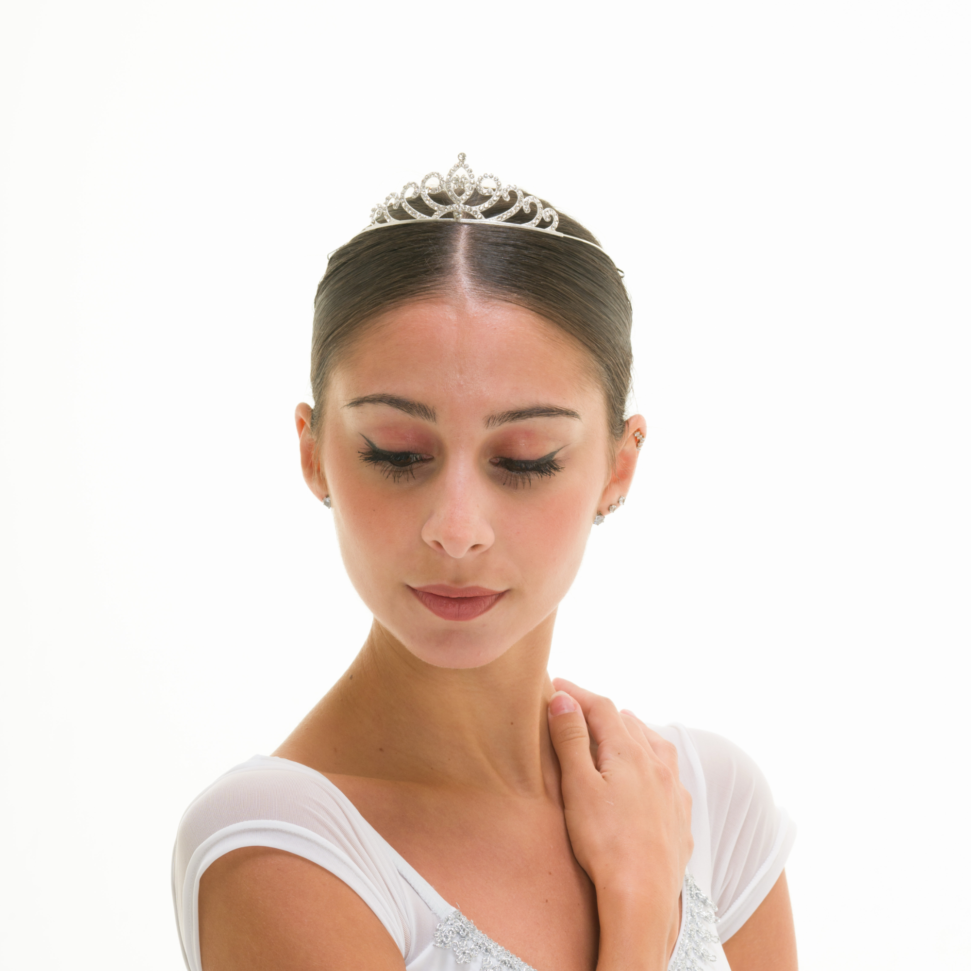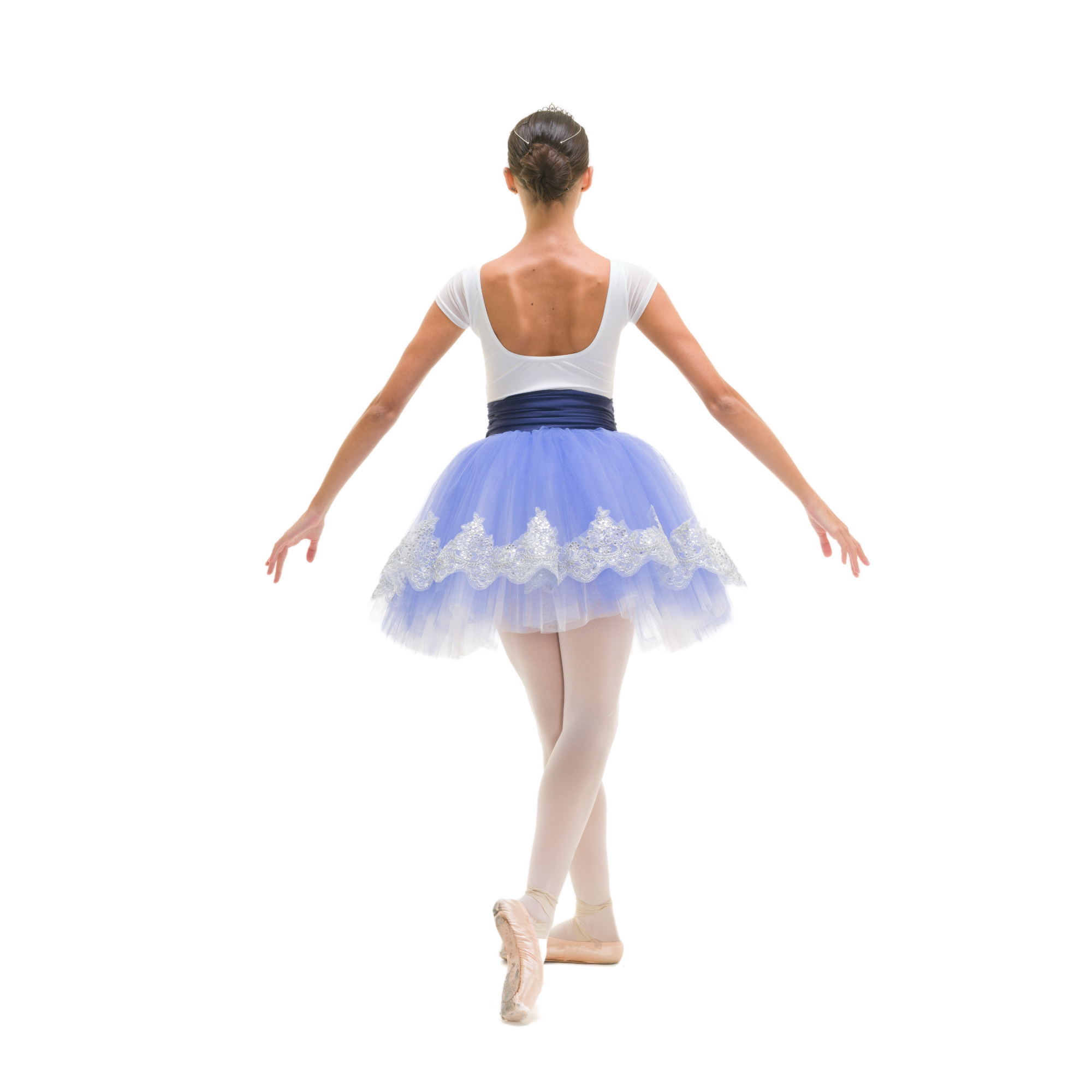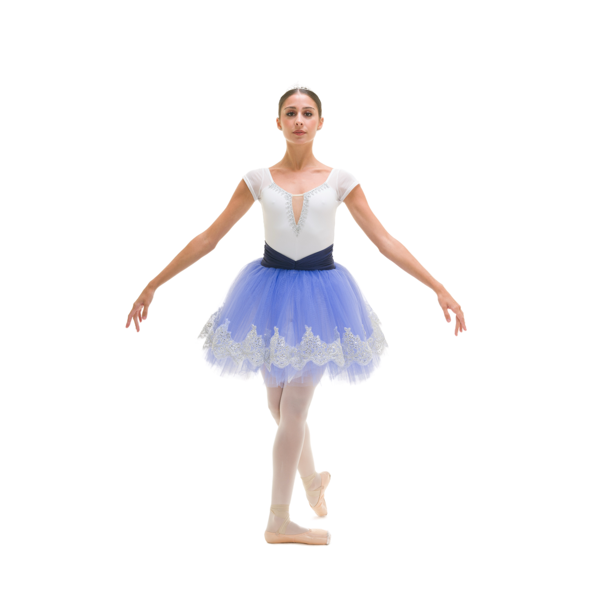 Tutù con body in lycra e manichette aderenti in retina semitrasparente (Siviglia), veletta di retina nudo con passamaneria argento, fascia cucita in lycra arricciata al centro, 1 velo tulle morbido con decorazione argento + 3 veli doppi di tulle morbido + 1 velo di tulle rigido.