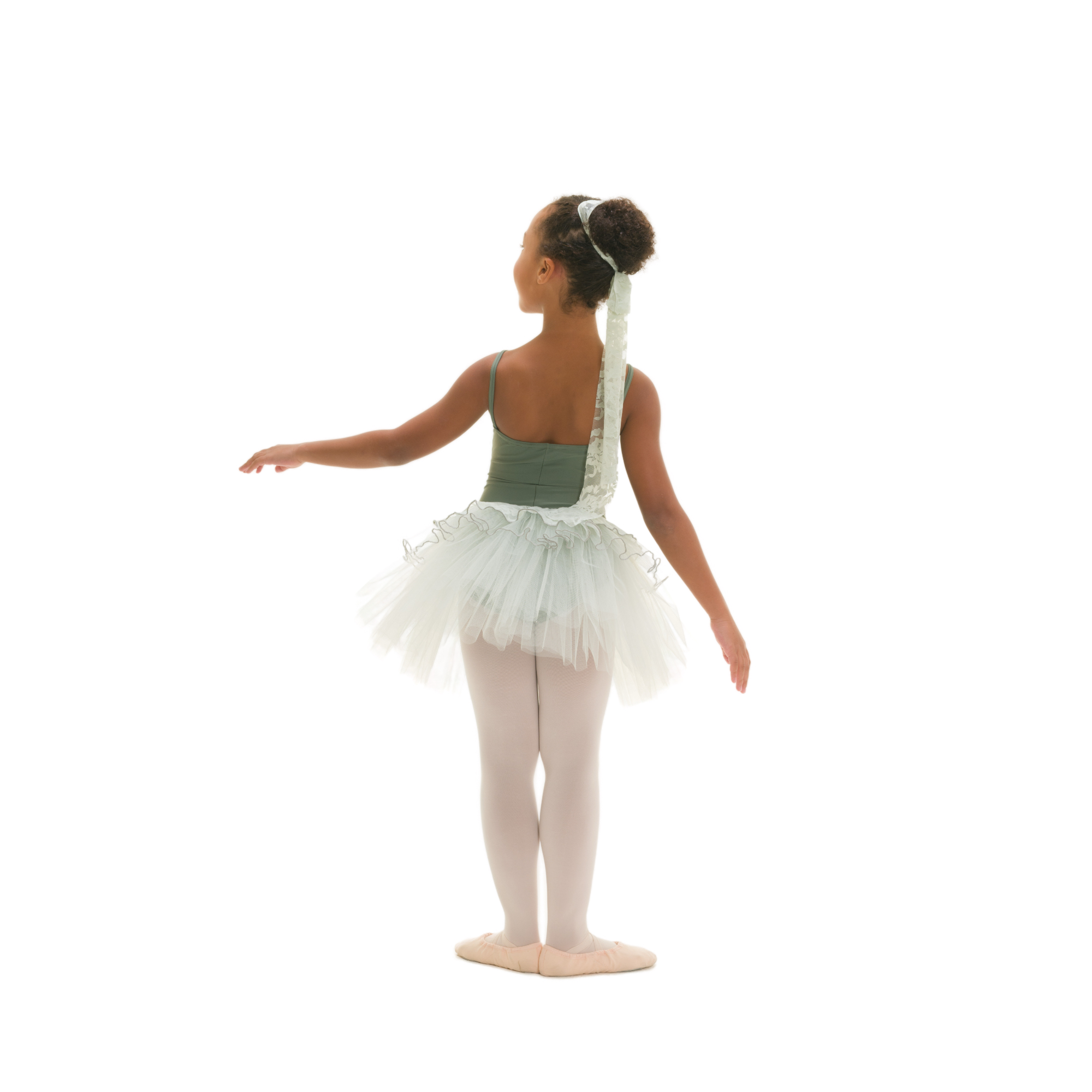 Tutù con body mono-spalla in lycra e tessuto shiny pink silver, manica 3/4 in retina semitrasparente (Siviglia), gonna a rombo in retina semitrasparente (Siviglia).