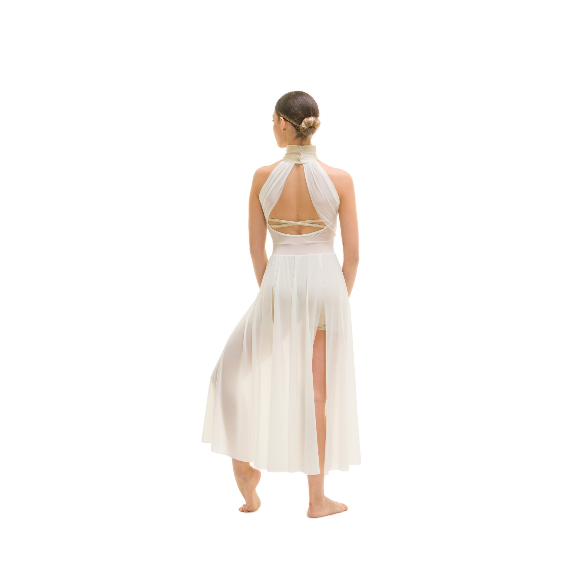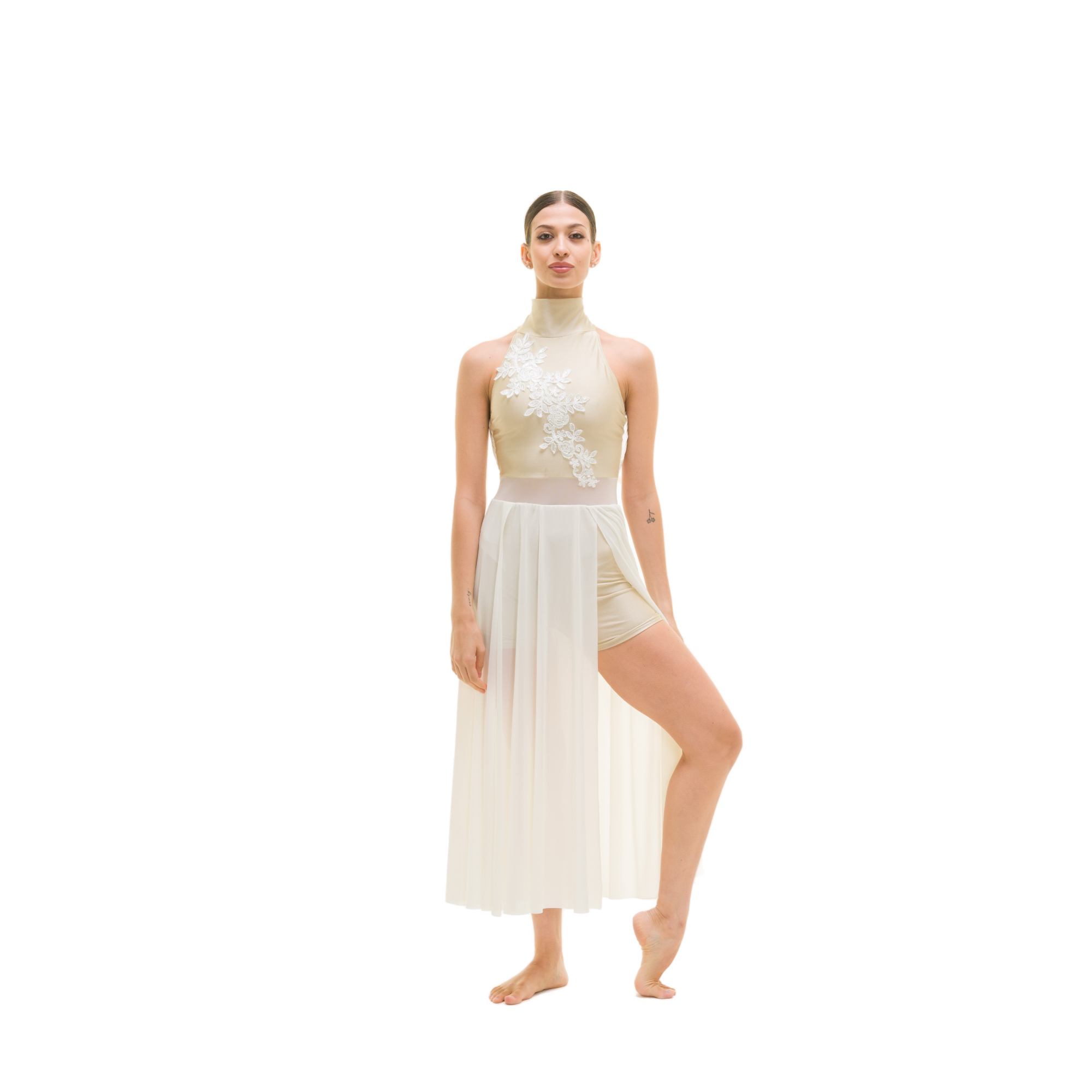 Vestito con accademico short in lycra ed inserto in vita in retina semitrasparente (Siviglia), scollo all’americana, veletti dietro schiena ed incrocio, gonna formata da 4 veli di retina semitrasparente (Siviglia), decoro pizzo floreale applicato sul petto.