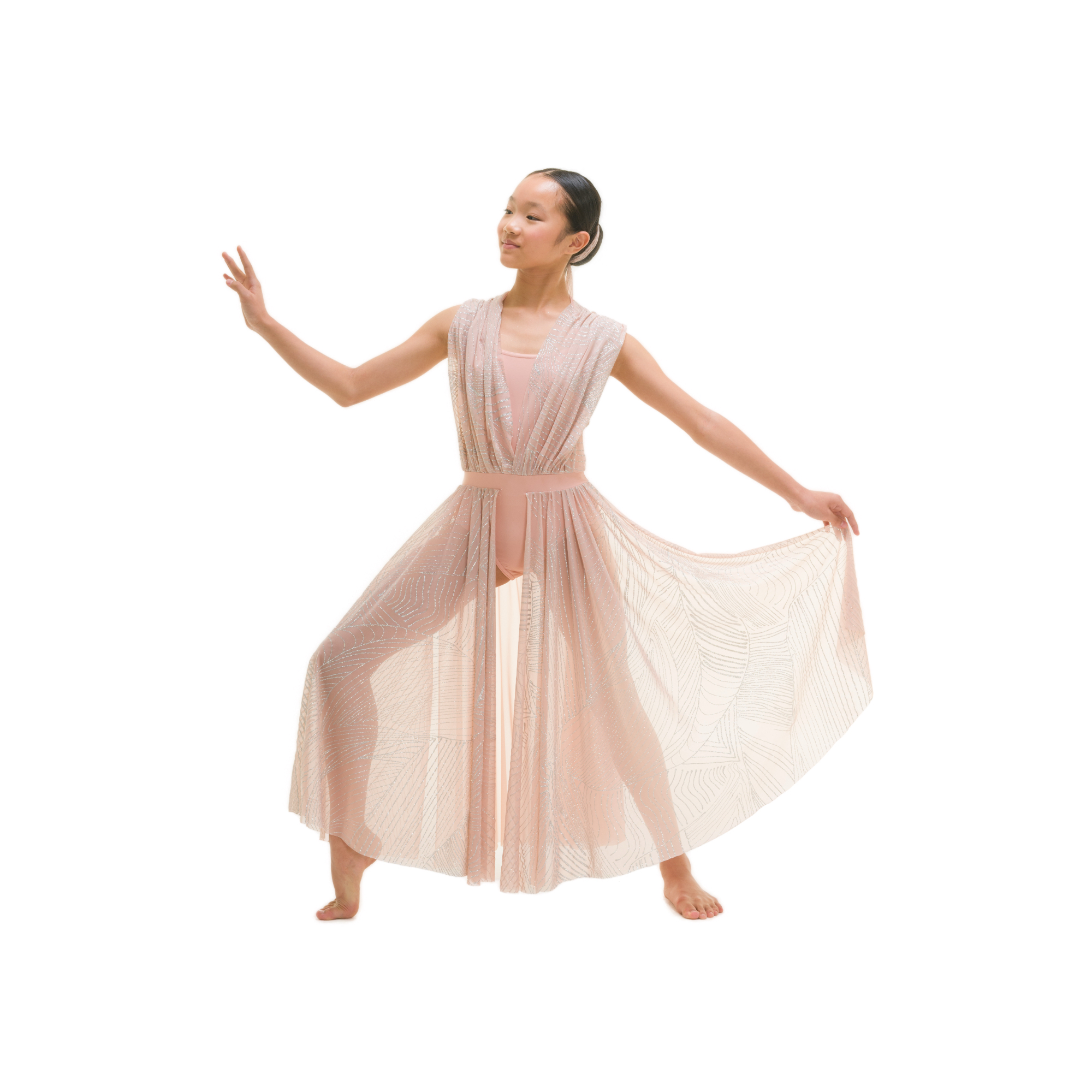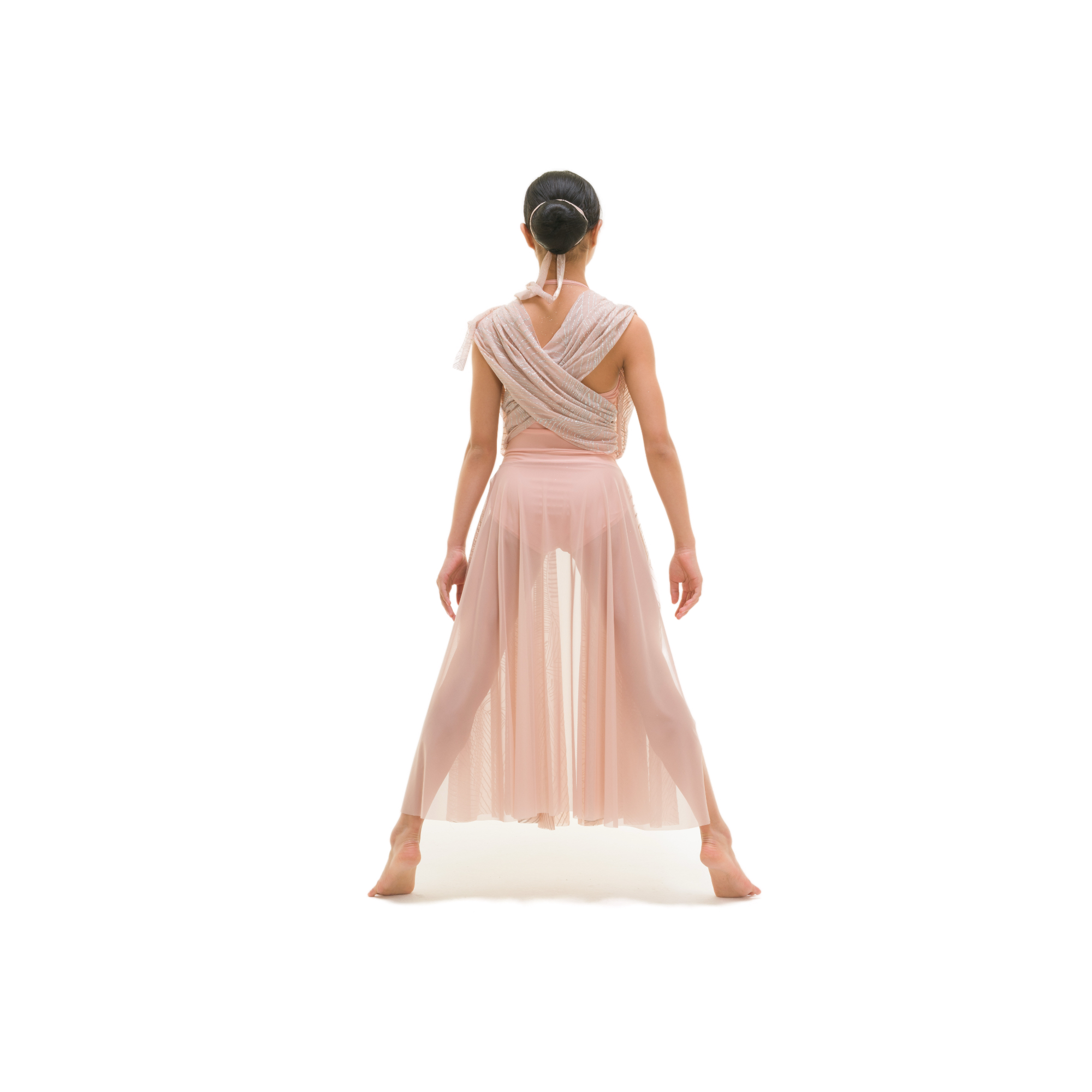 Vestito formato da body in lycra, teli drappeggiati in retina glamour luccicante insertati e incrociati su schiena, gonna formata da una semiruota in retina sul dietro e due teli drappeggiati in retina glamour luccicante sul davanti, apertura frontale.