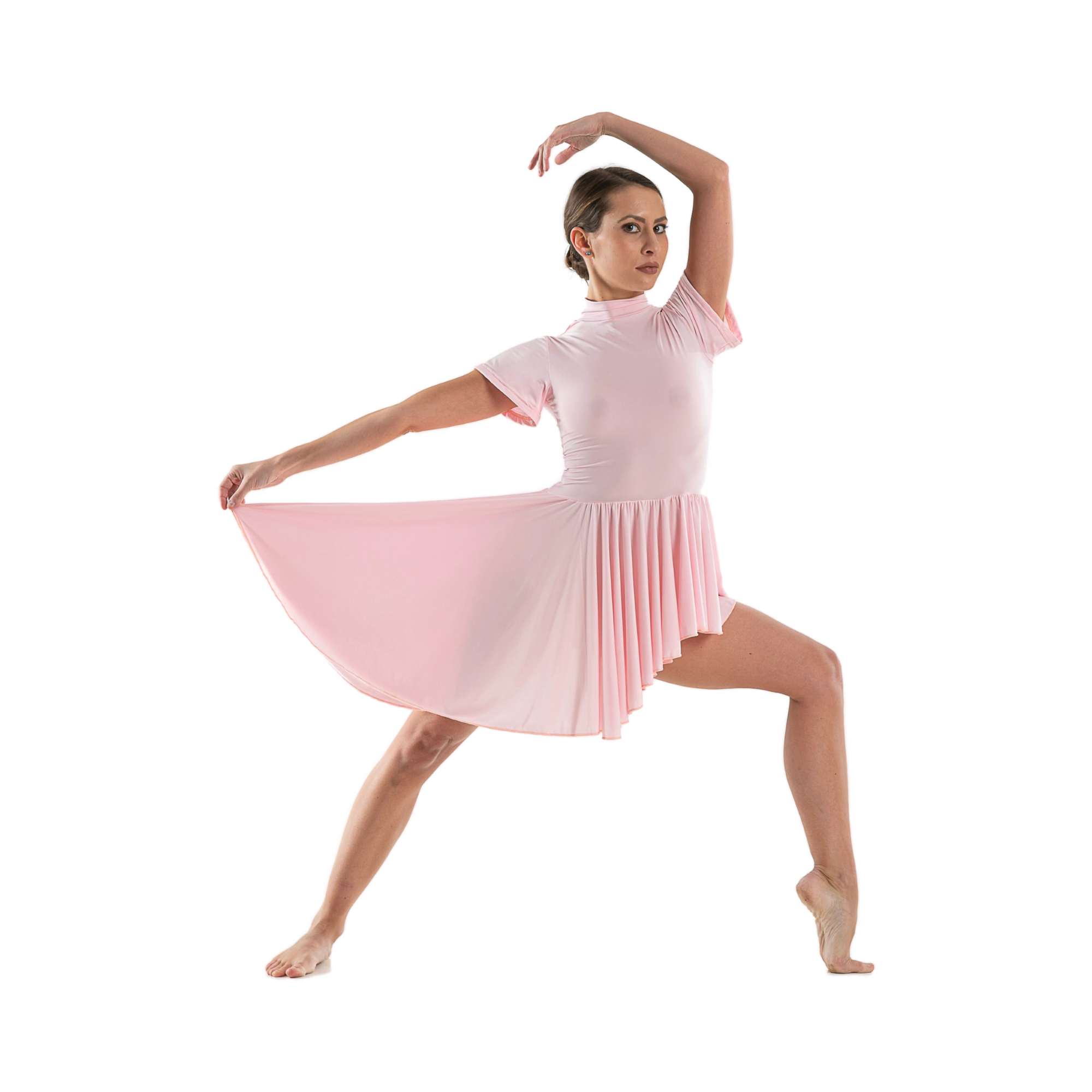 Vestito in tessuto elastico leggero (Maglina elastica) con collo alto, manica a campana e gonna asimmetrica.