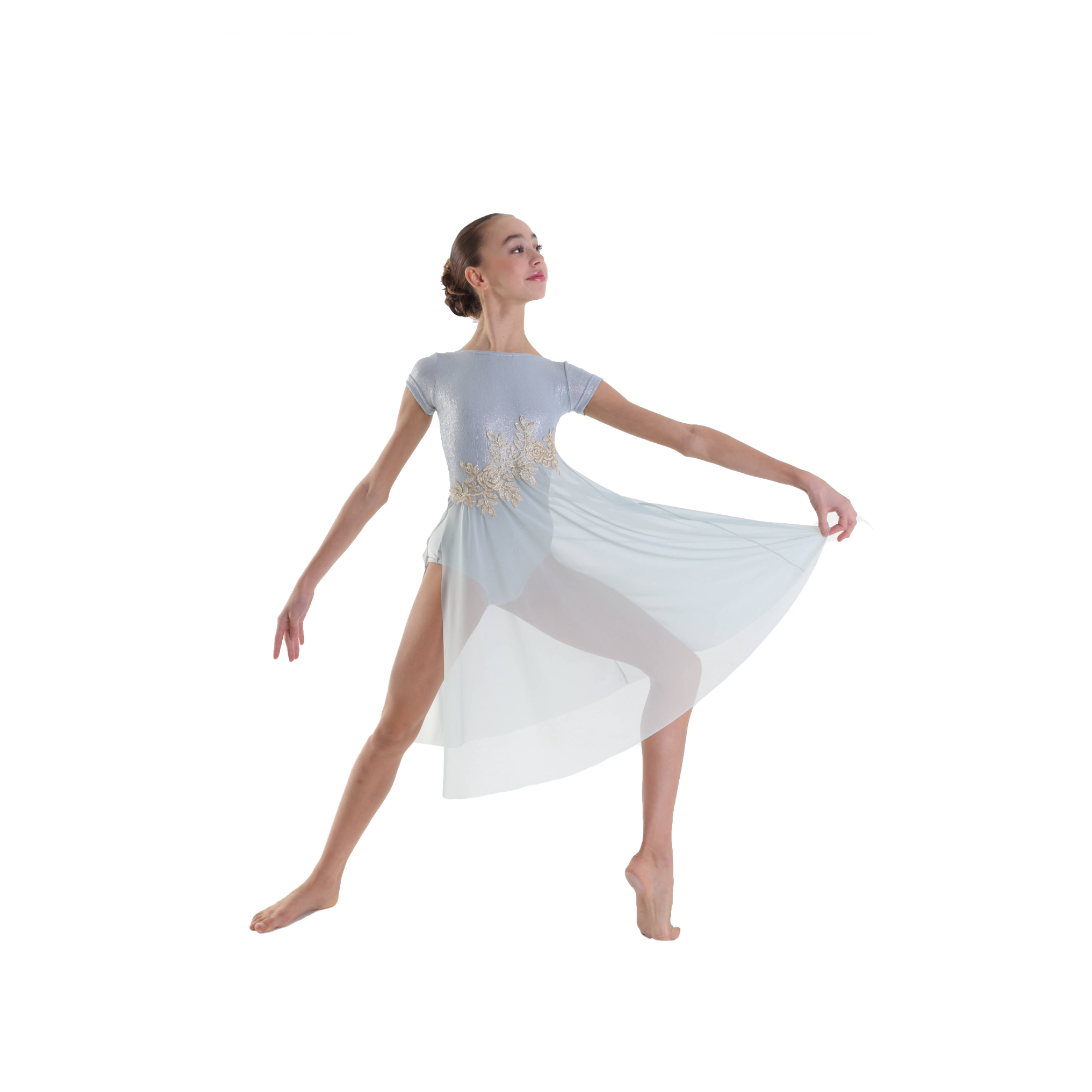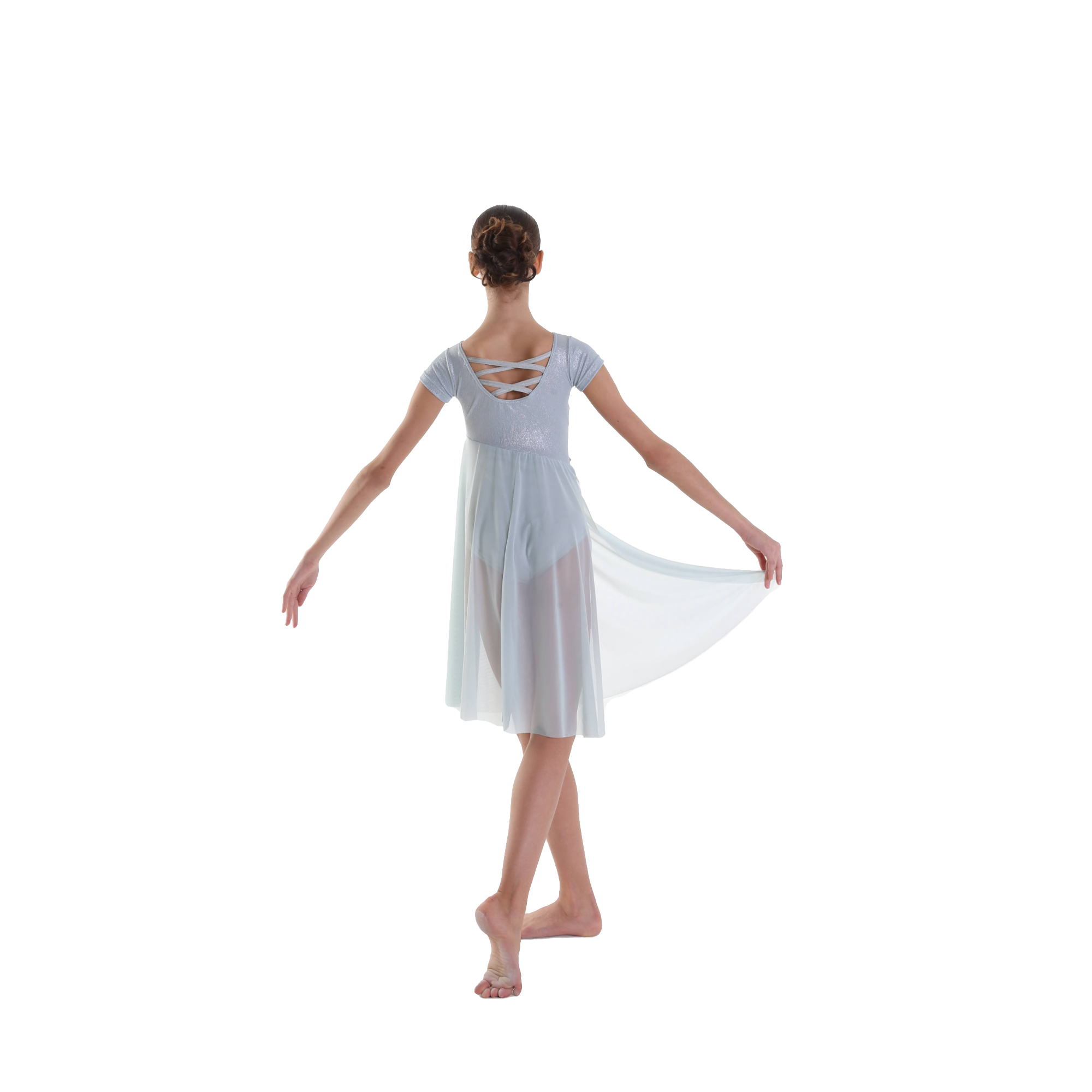 Vestito con body manichetta corta e scollo a barchetta, scollo dietro più profondo con incroci, parte alta in tessuto shiny lime parte bassa in lycra, gonna con spacco laterale destro lunghezza al ginocchio, decorazione pizzo colore oro chiaro.